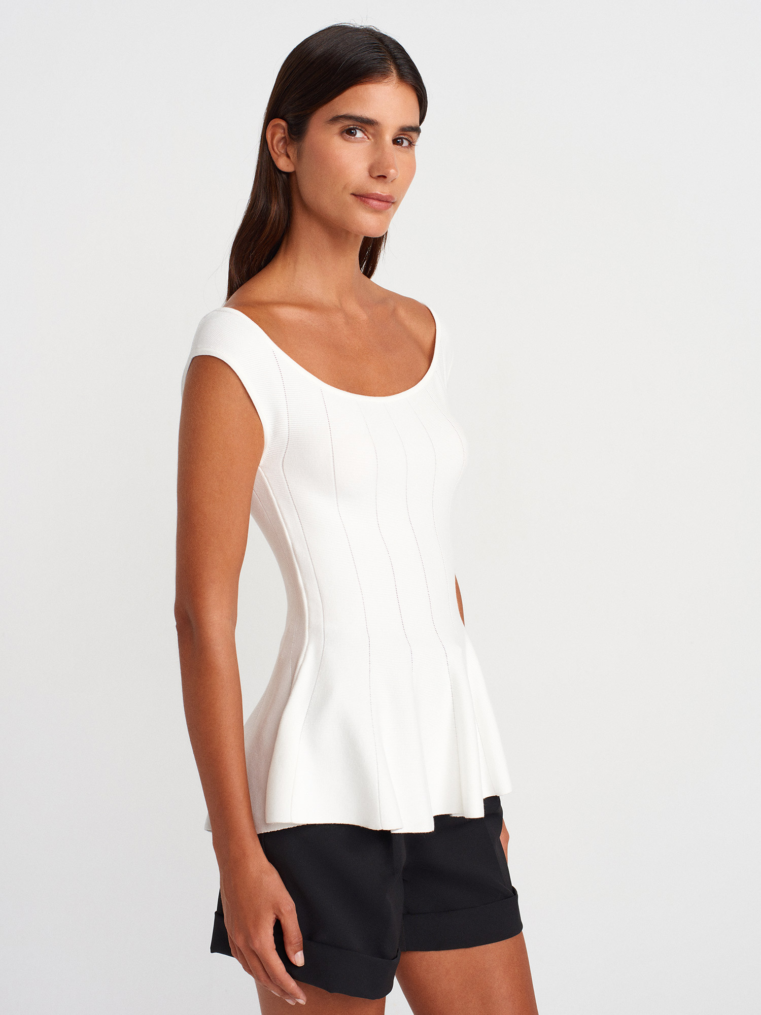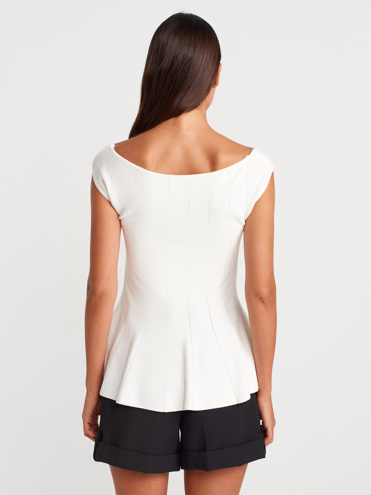 10741 Kayık Yaka Volanlı Triko Bluz-Ekru