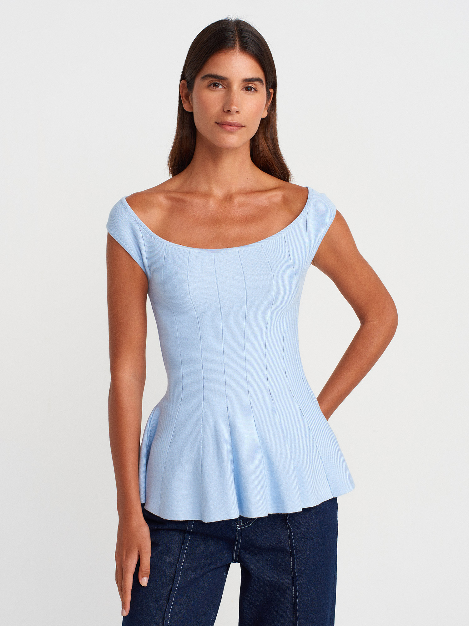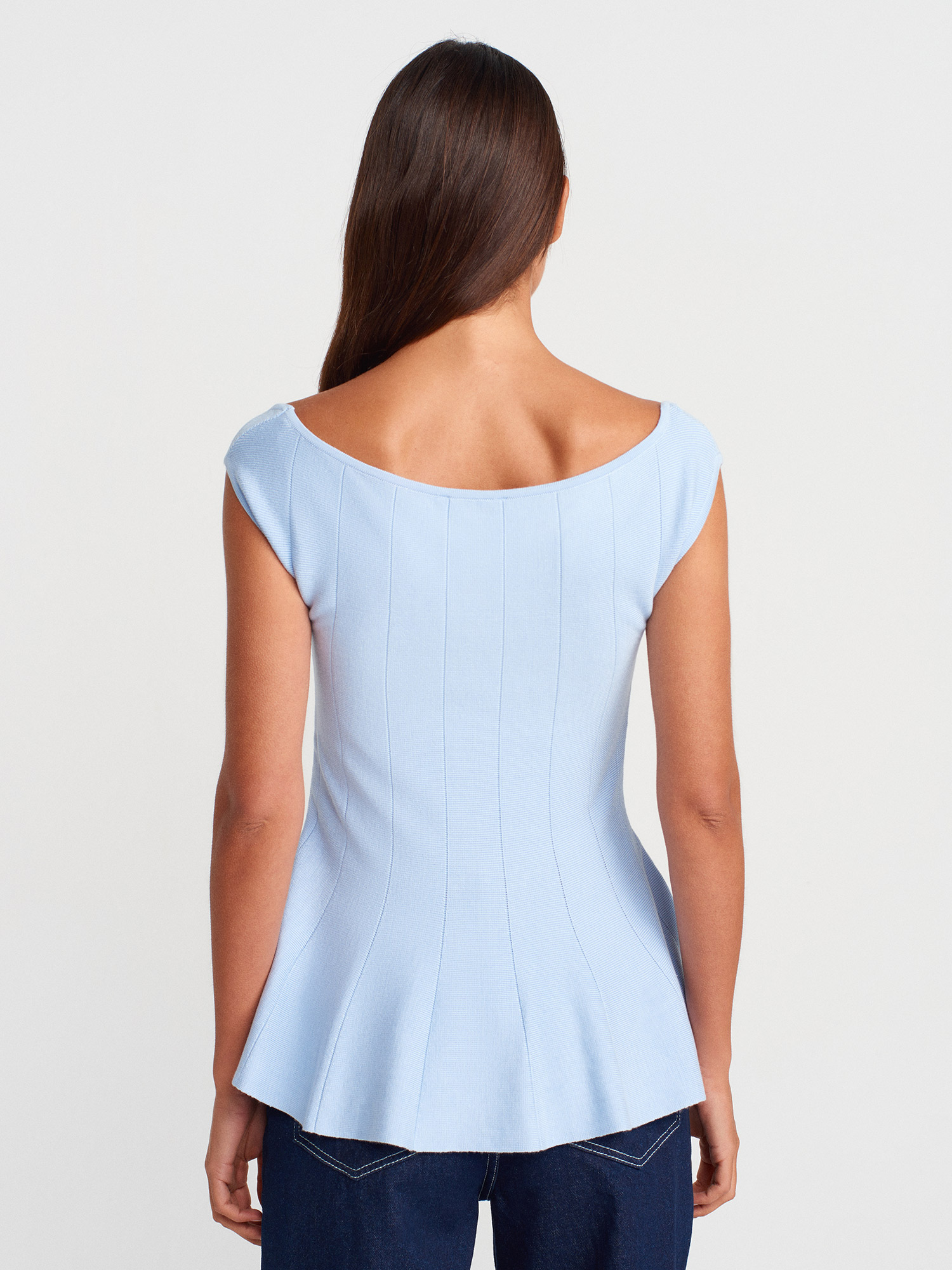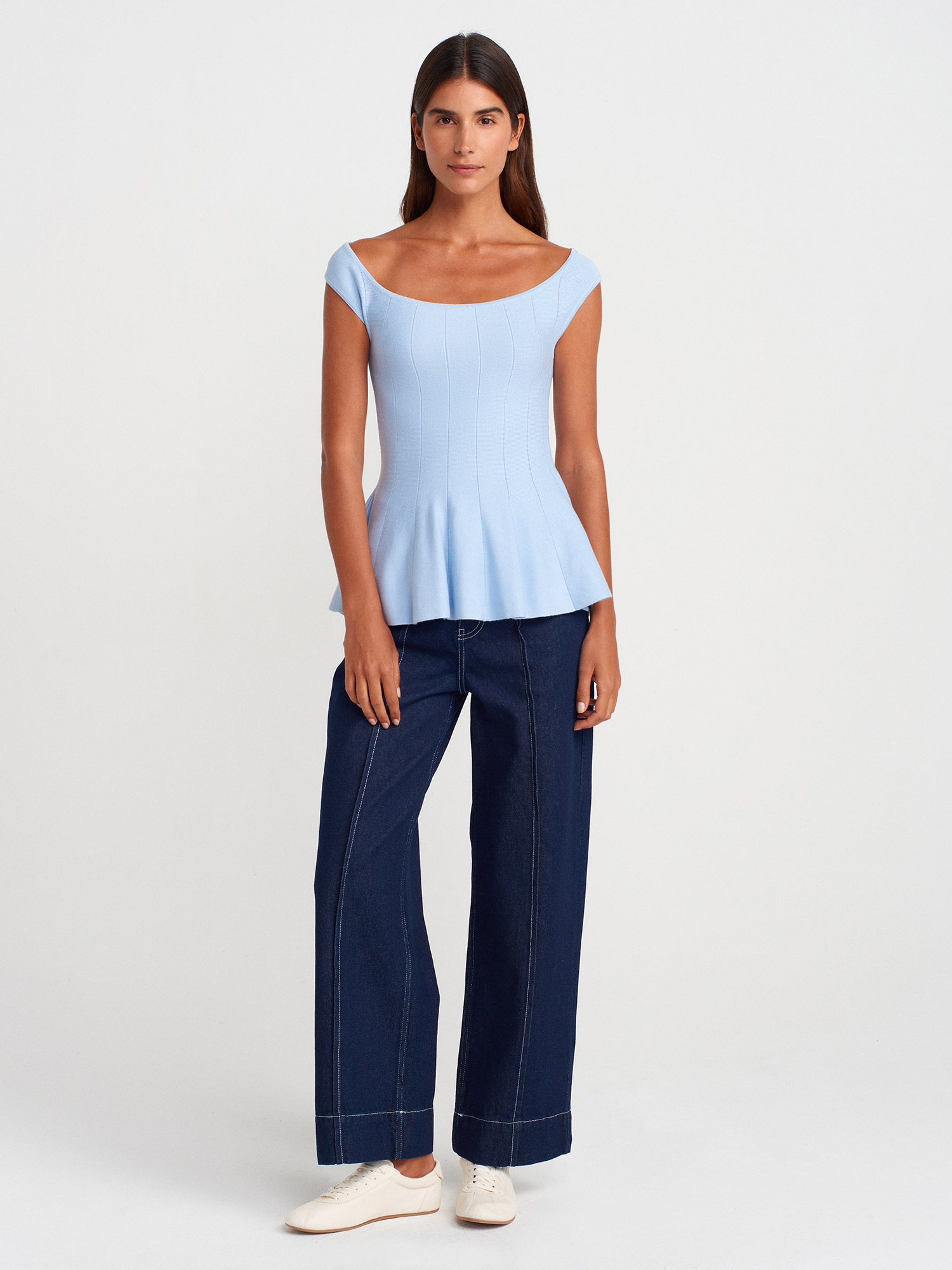 10741 Kayık Yaka Volanlı Triko Bluz-Mavi