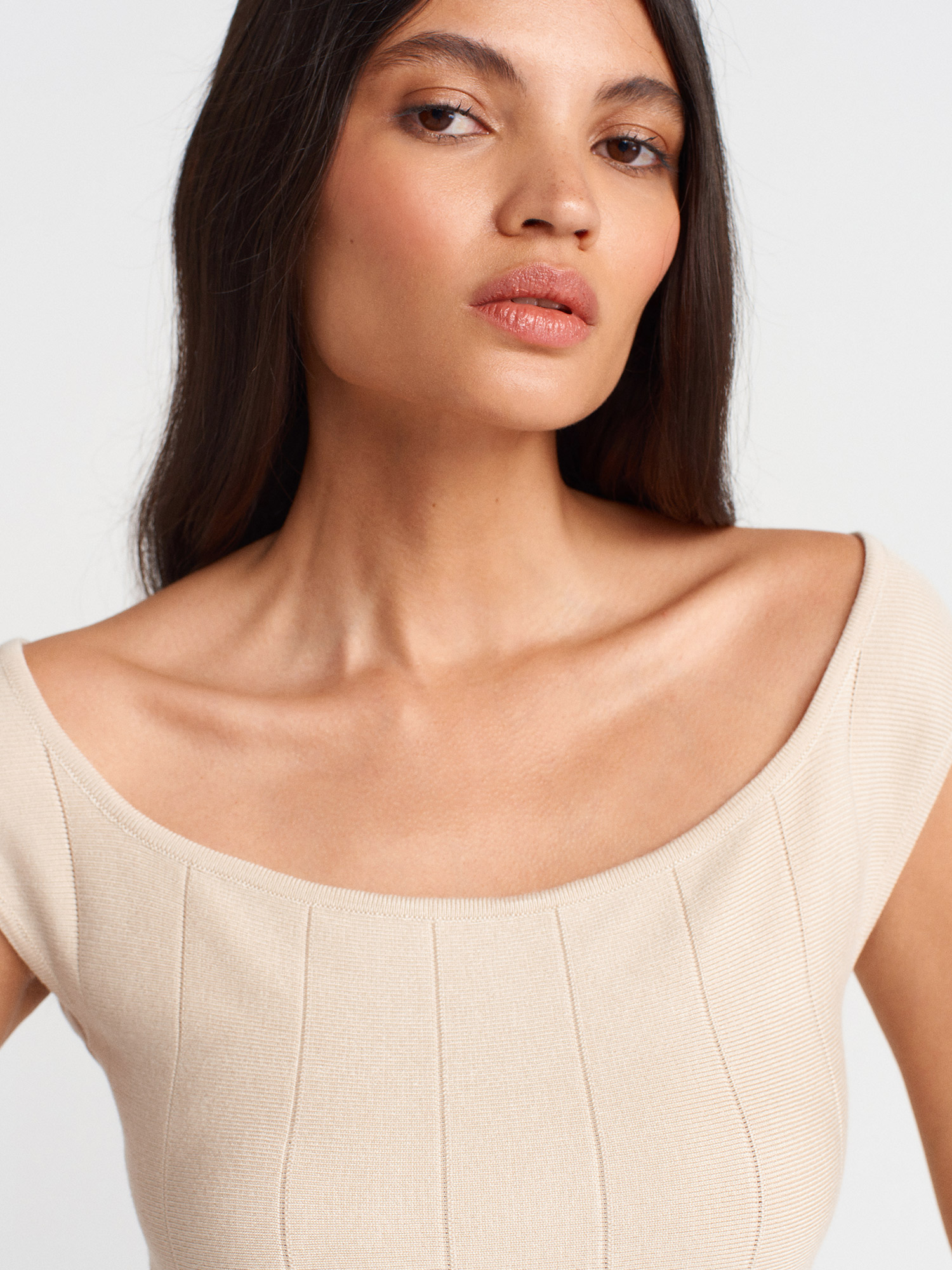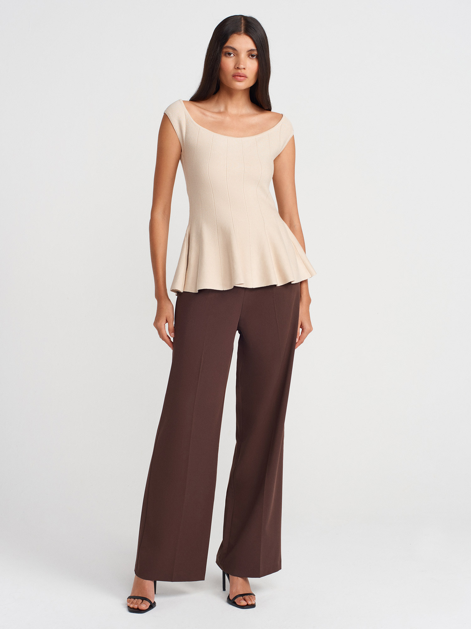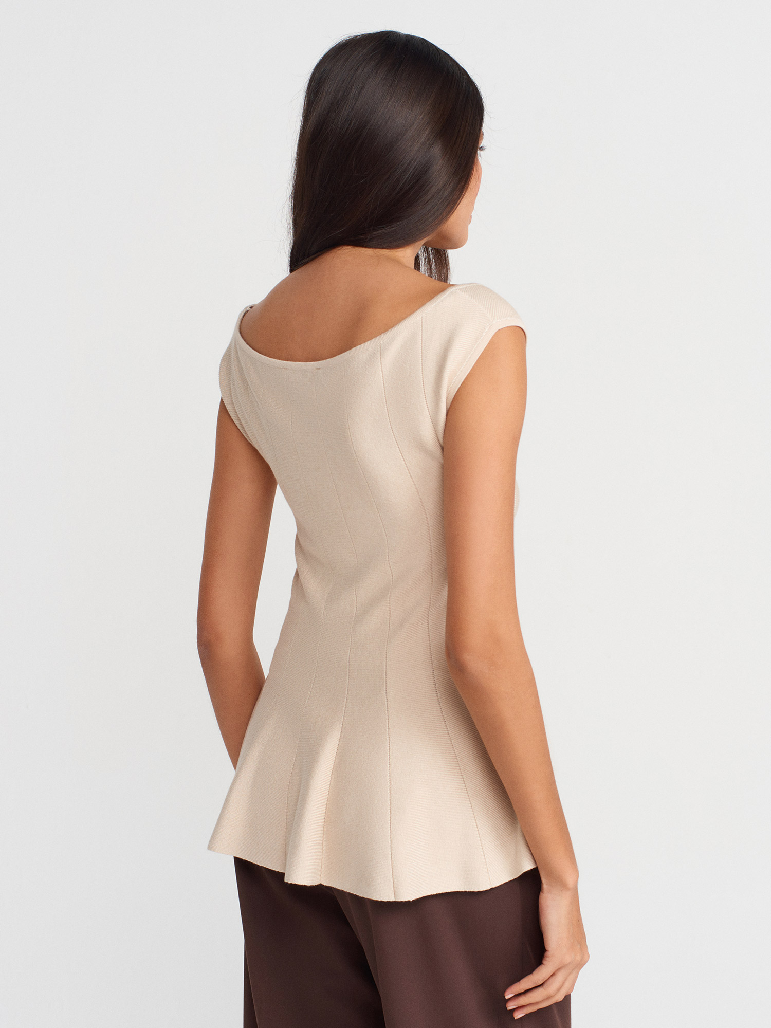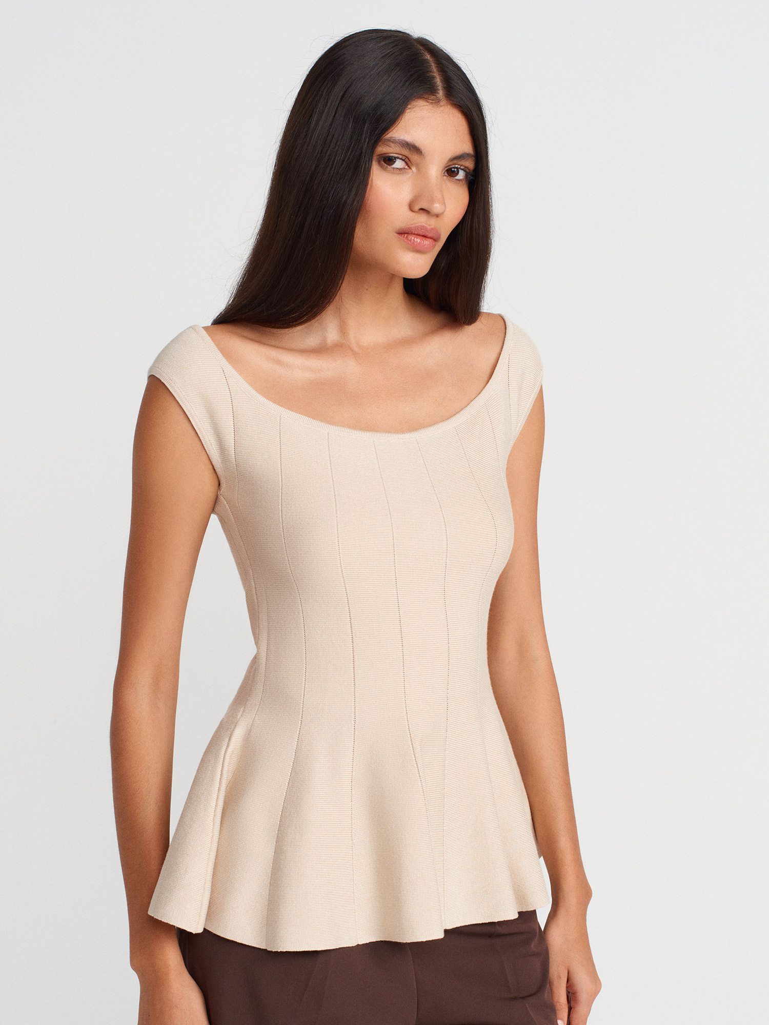 10741 Kayık Yaka Volanlı Triko Bluz-Taş