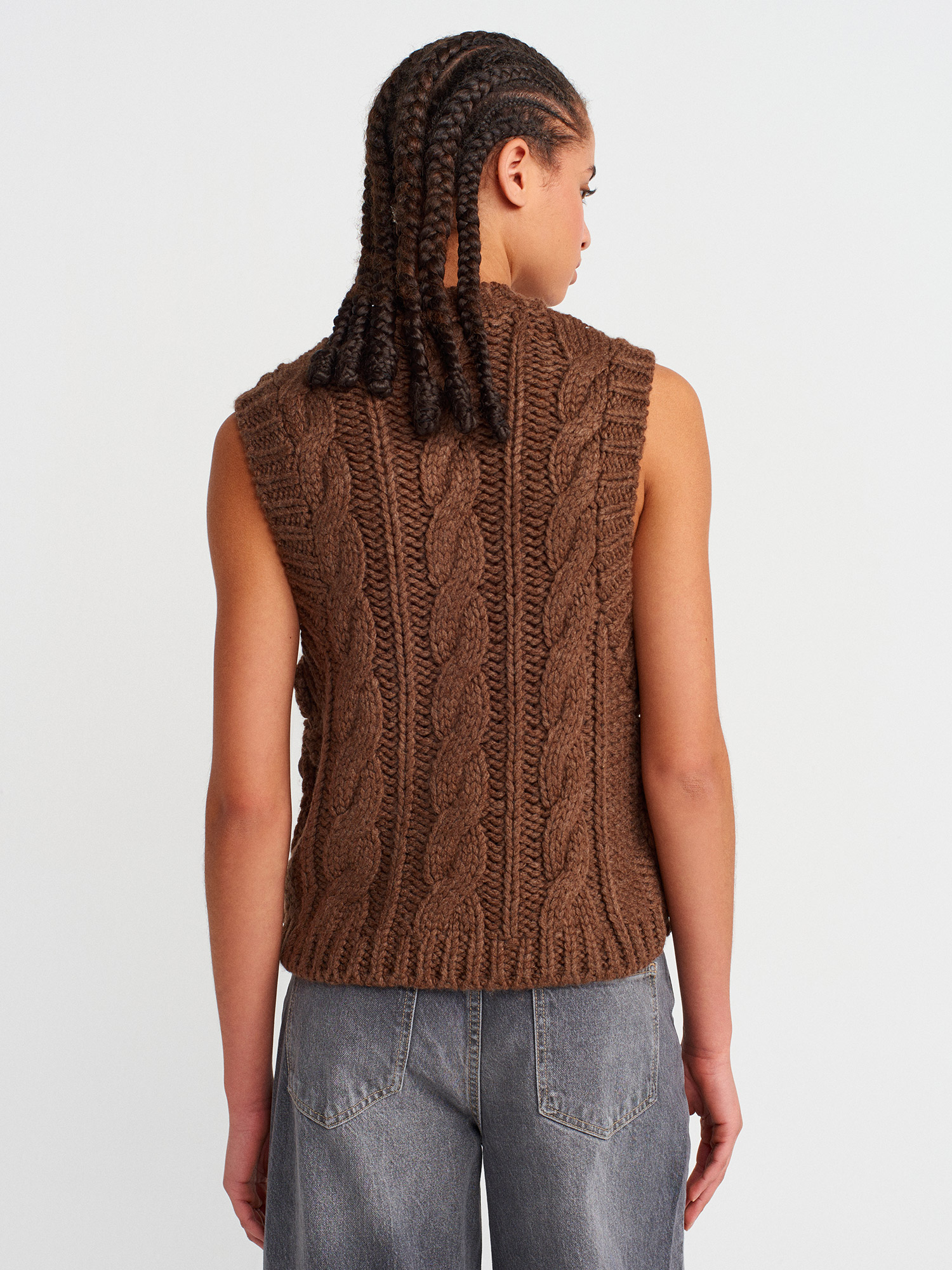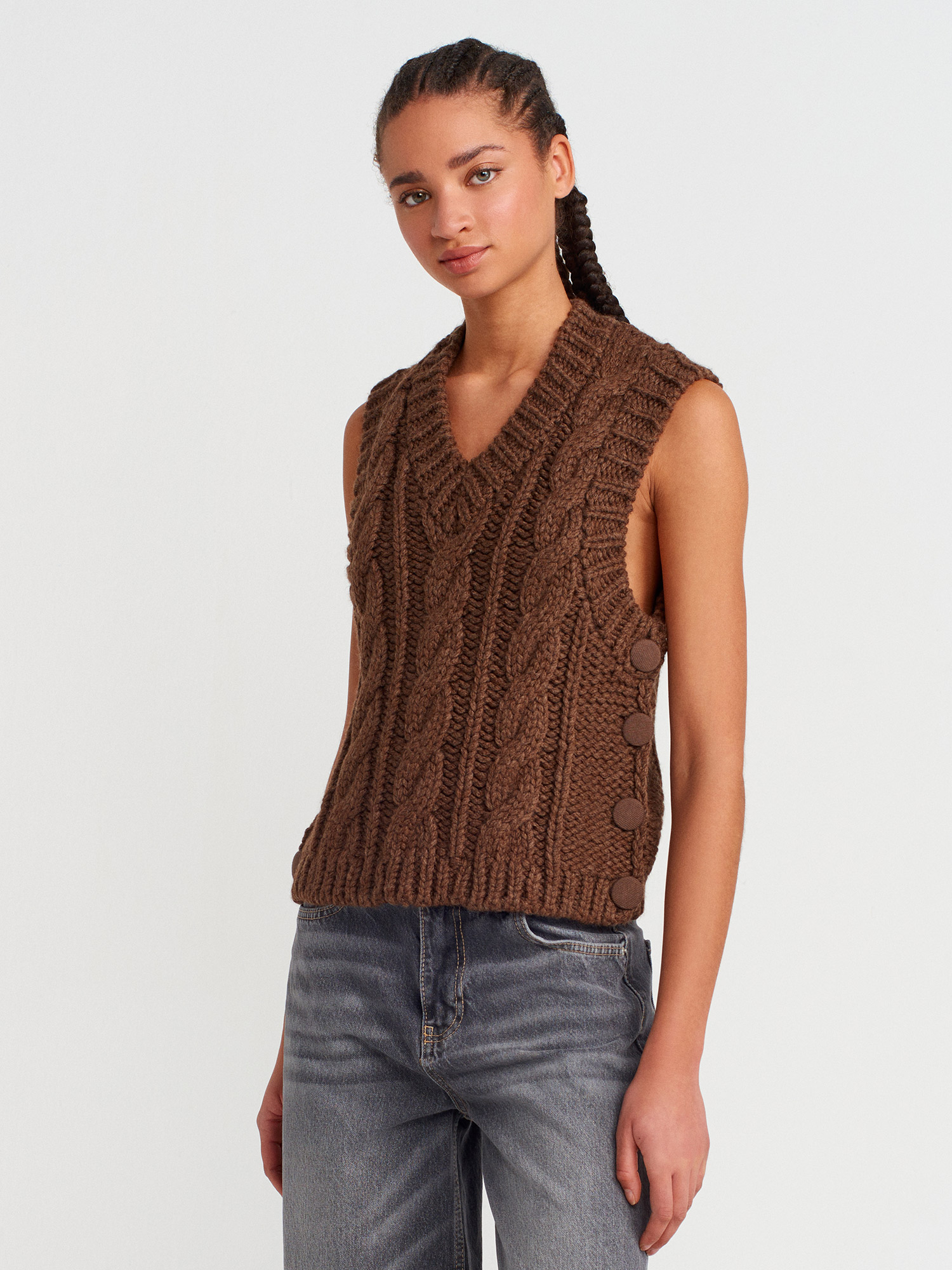 10742 V Yaka Yanları Düğmeli Saç Örgü Triko Süveter-Kahve