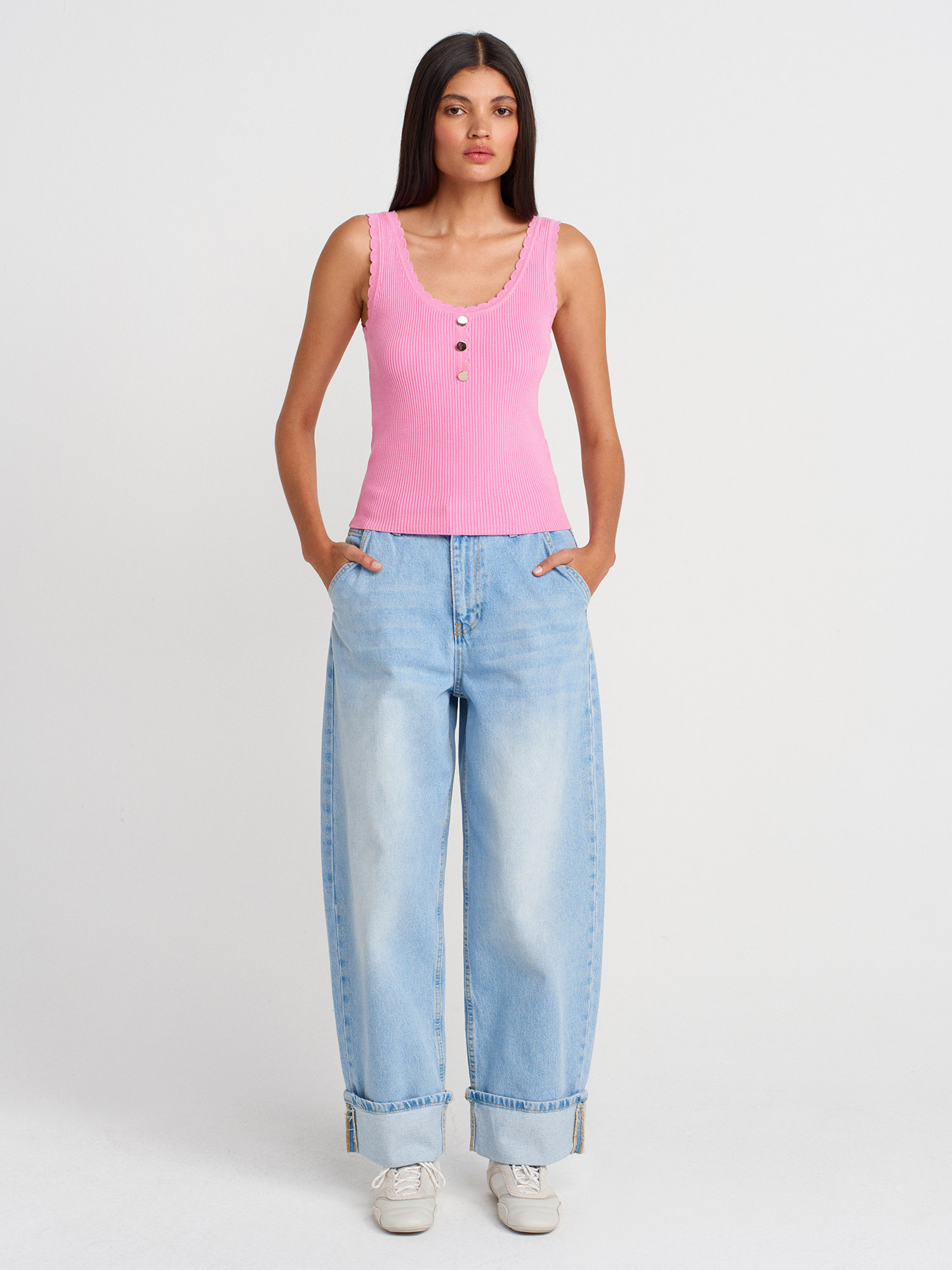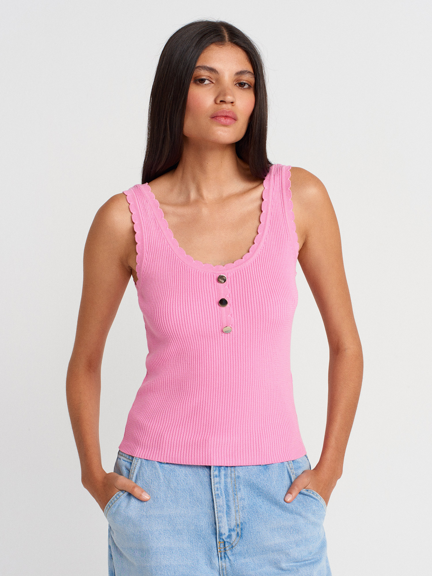 10744 Fitilli Düğme Detaylı Triko Bluz-Koyu Pembe
