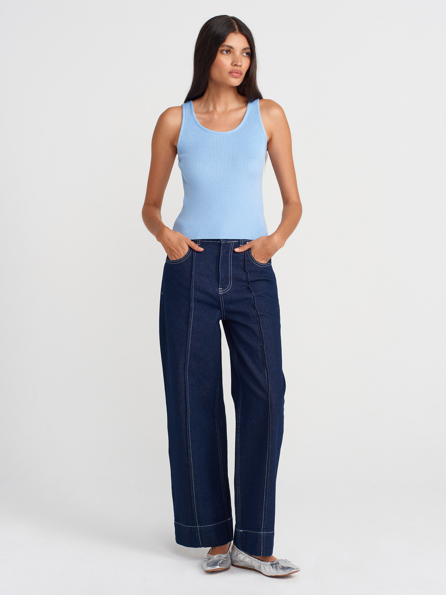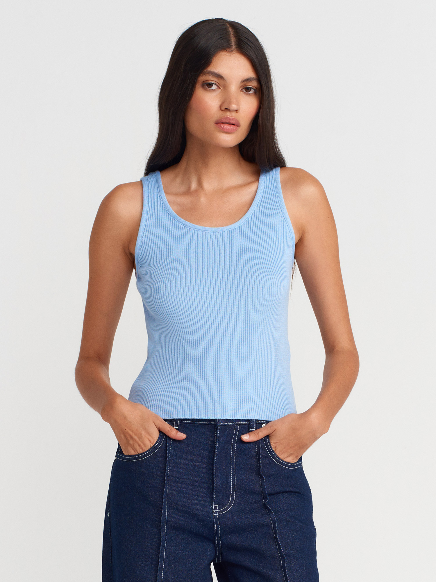 10748 Askılı Fitilli İnce Dokulu Triko Bluz-Mavi