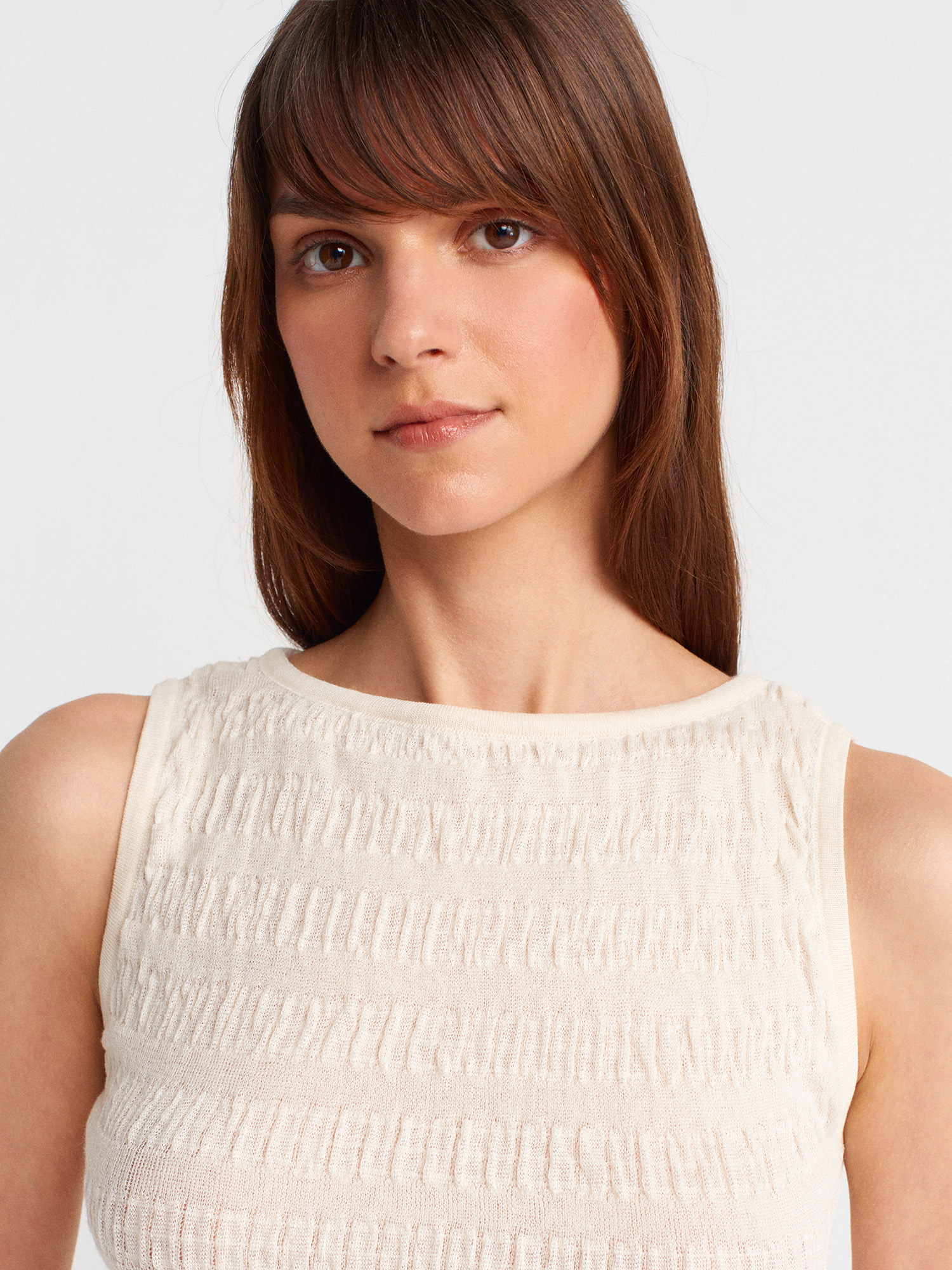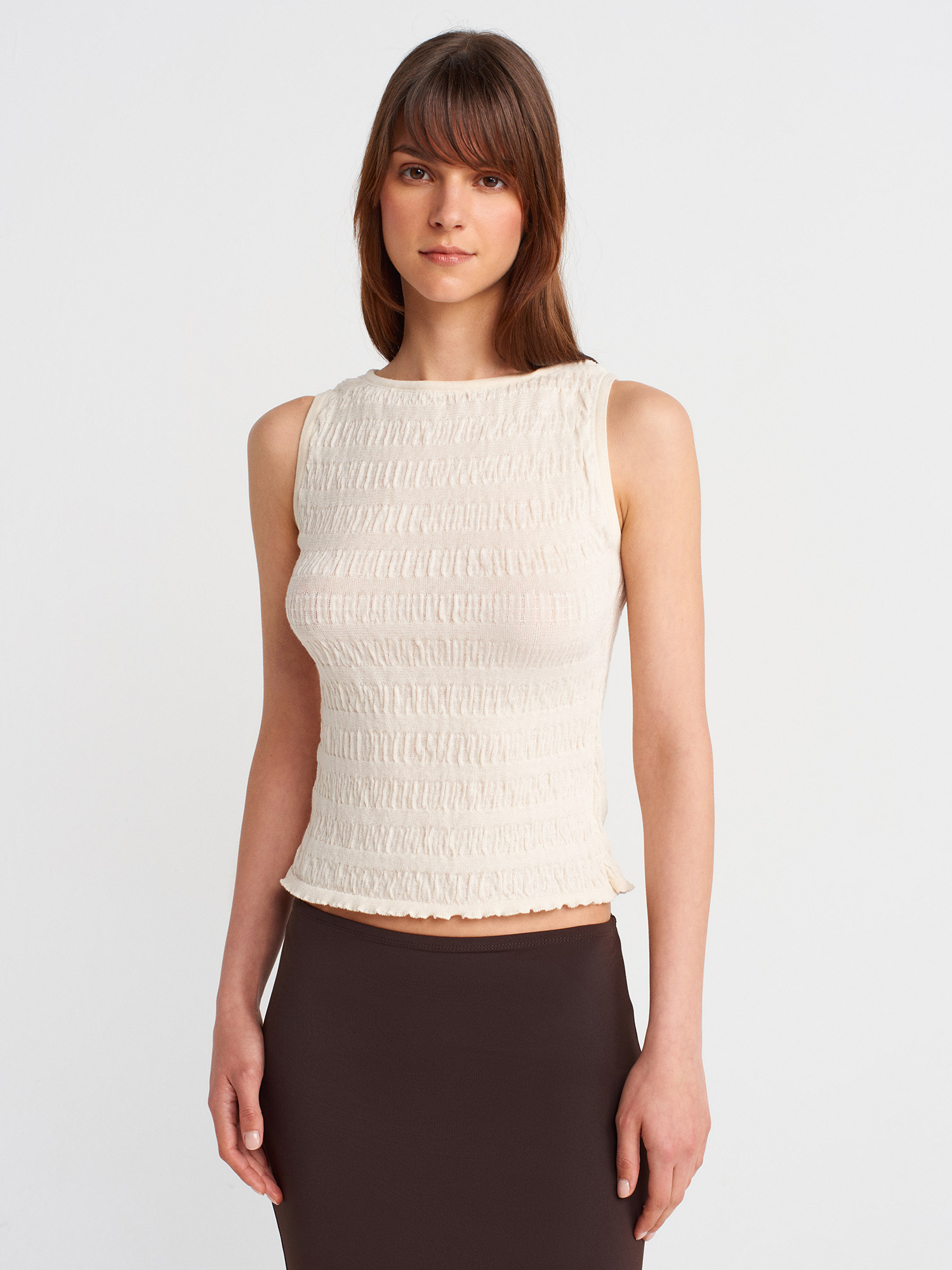 10751 Kayık Yaka Büzgülü İnce Triko Bluz-Ekru