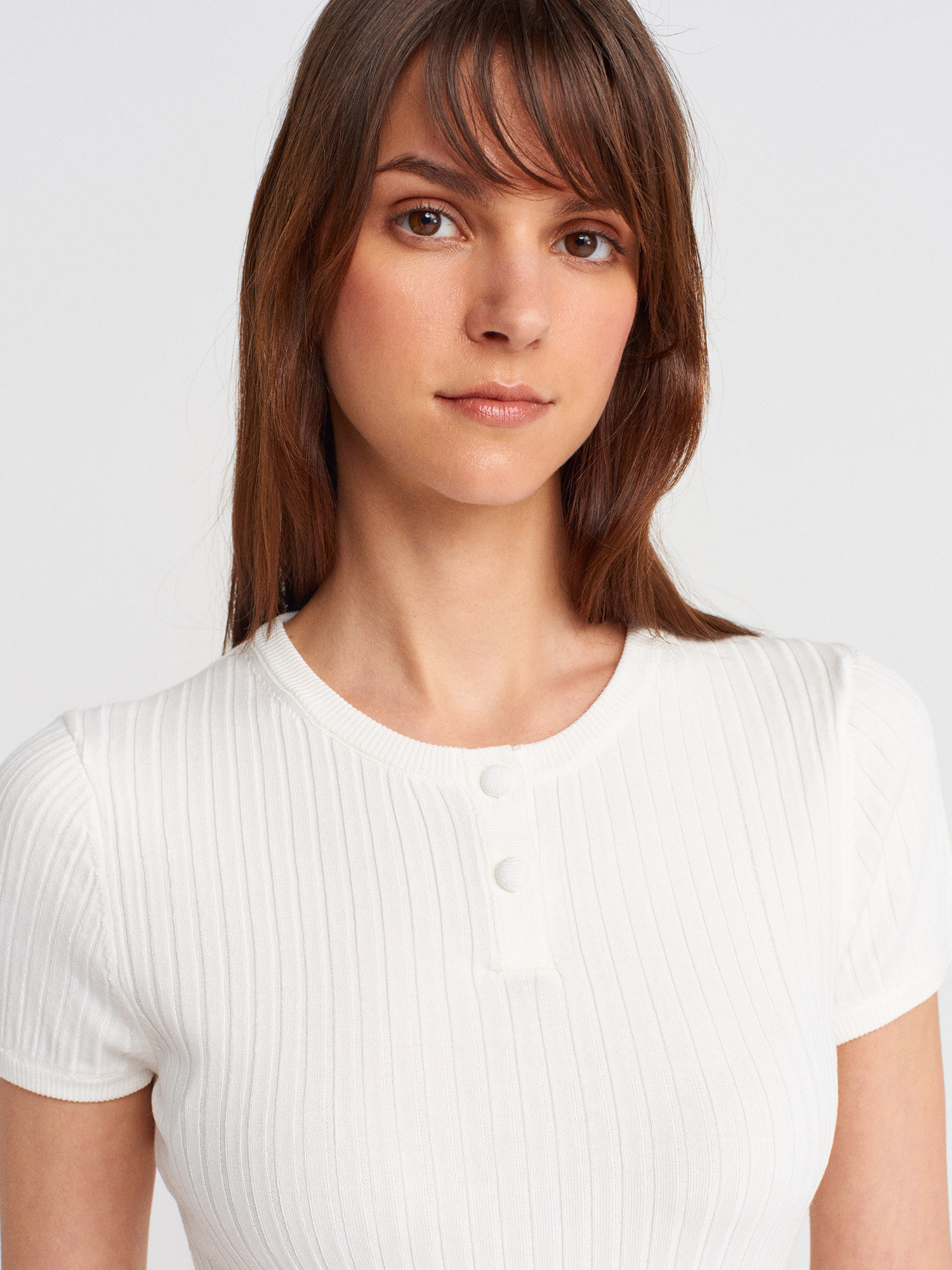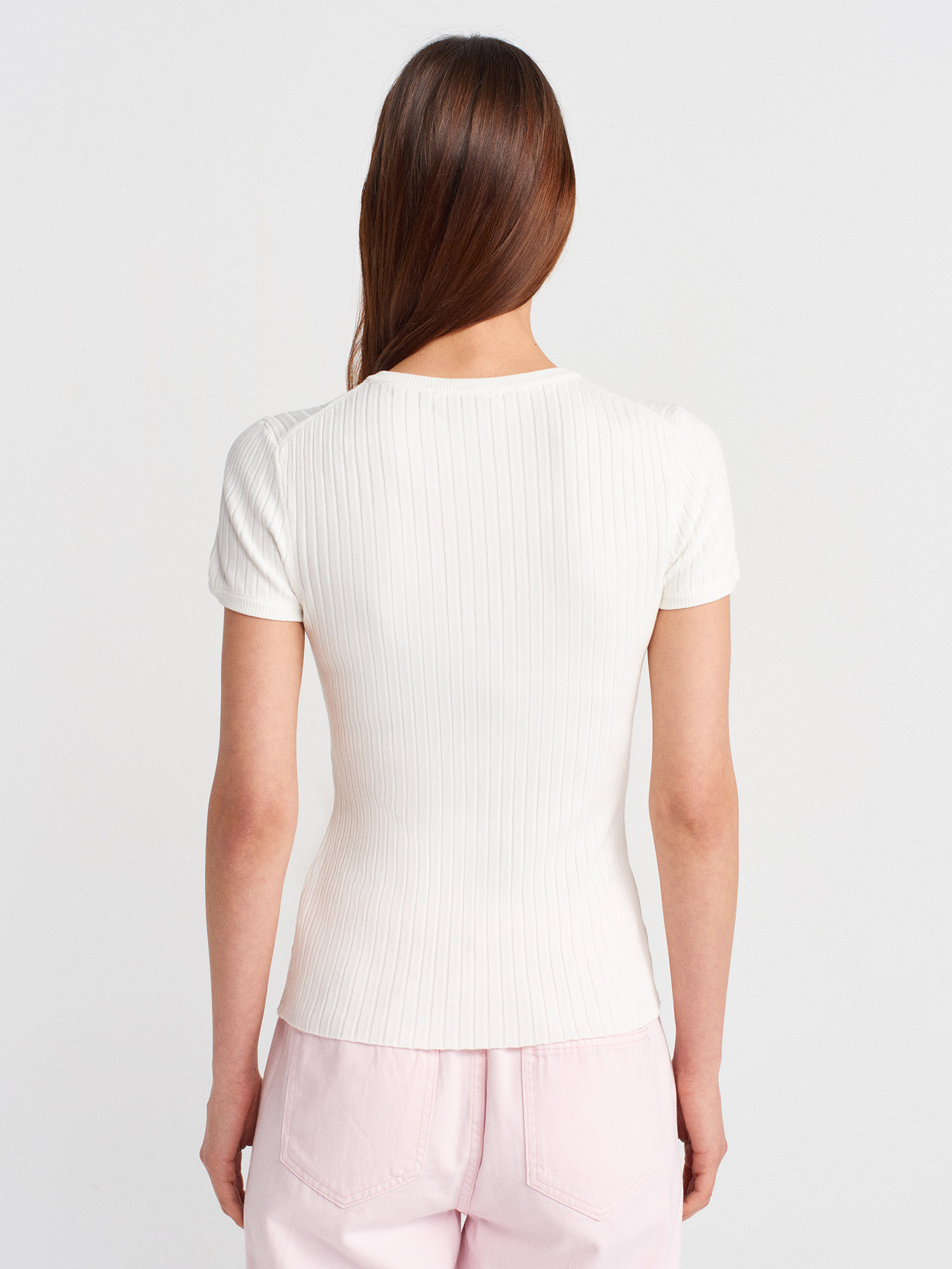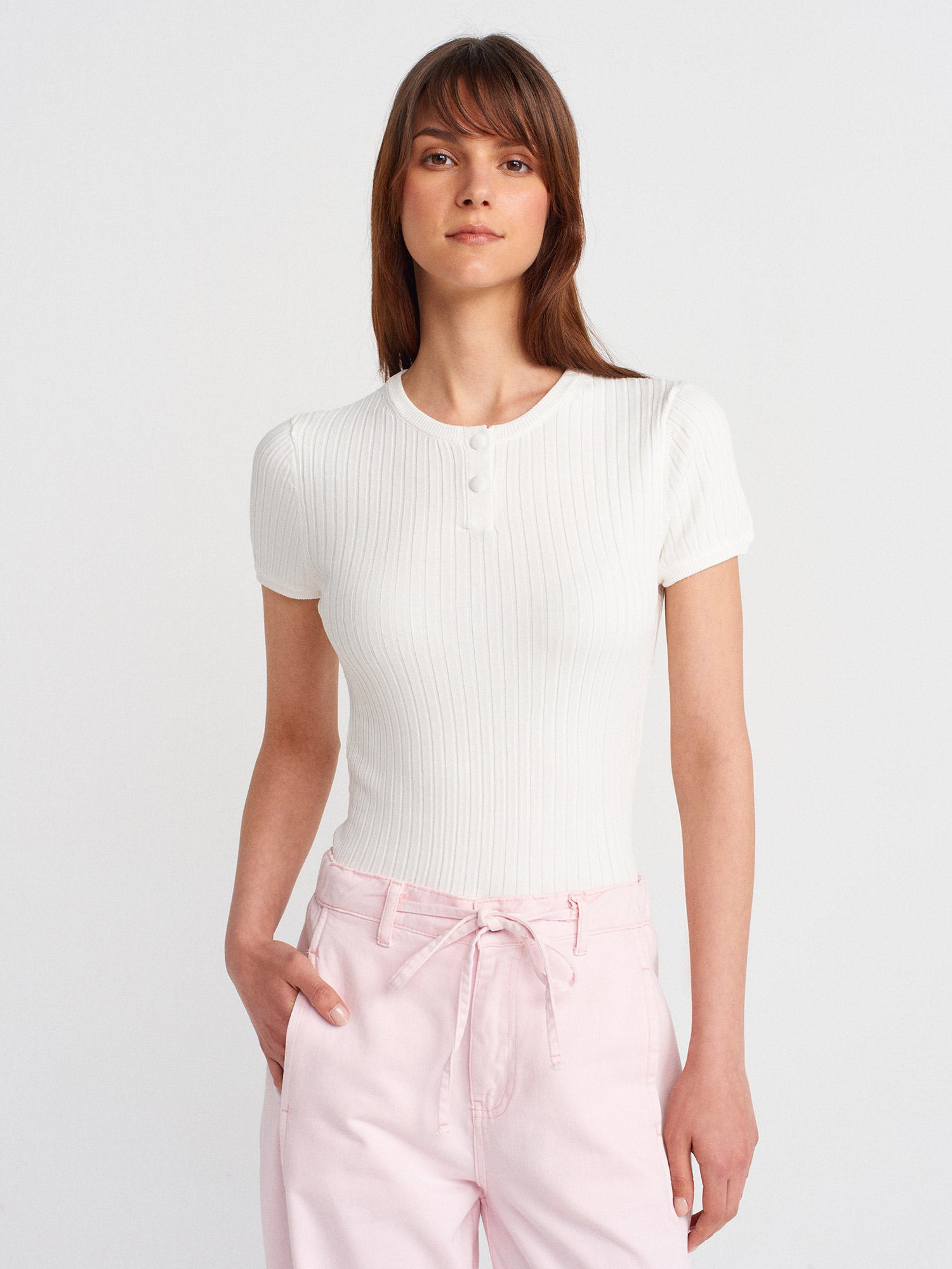 10756 Bisiklet Yaka Düğmeli Triko Bluz-Ekru