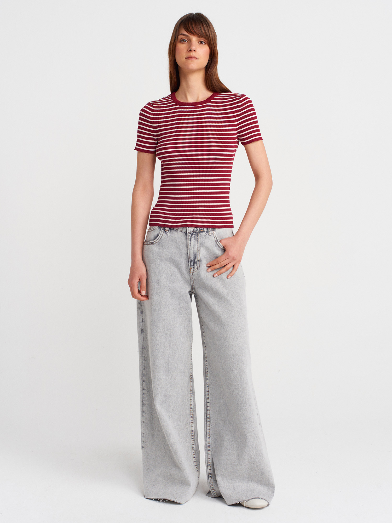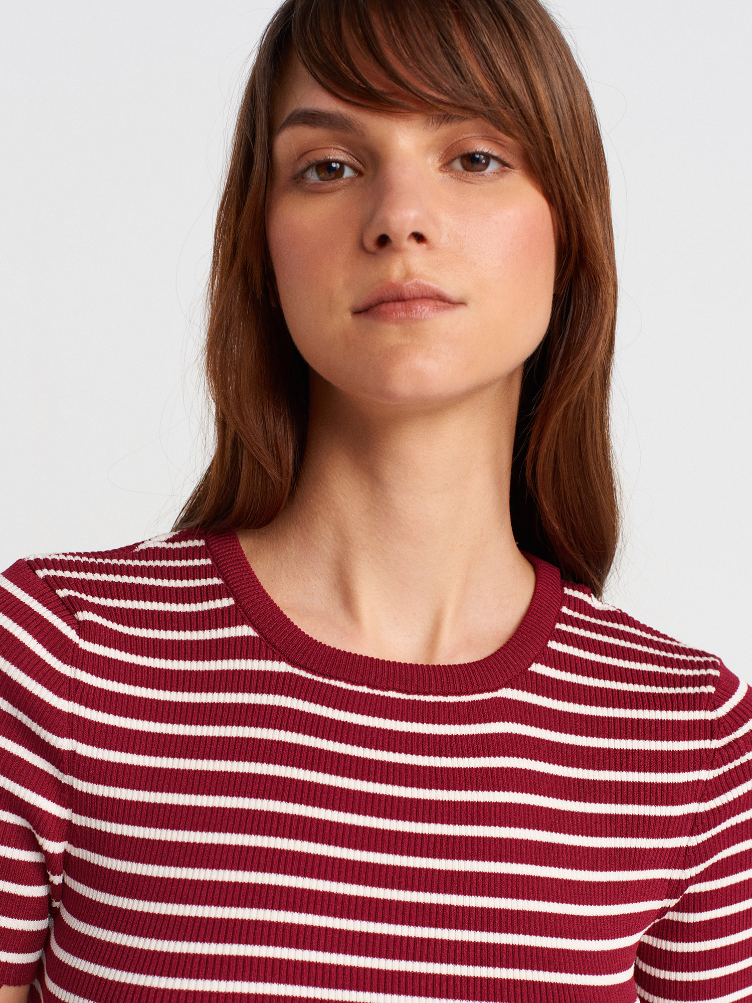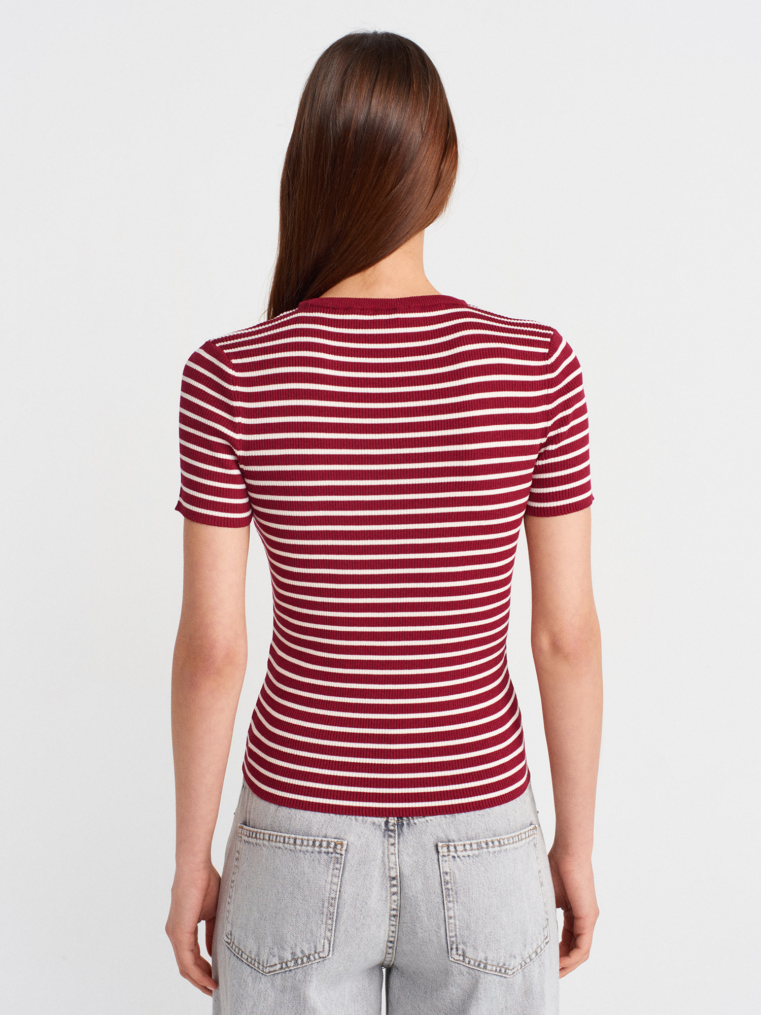 10758 Bisiklet Yaka Çizgili Basic Triko Bluz-Bordo-Ekru