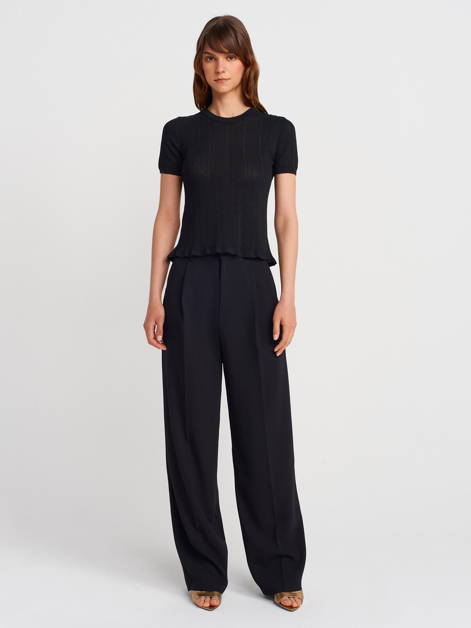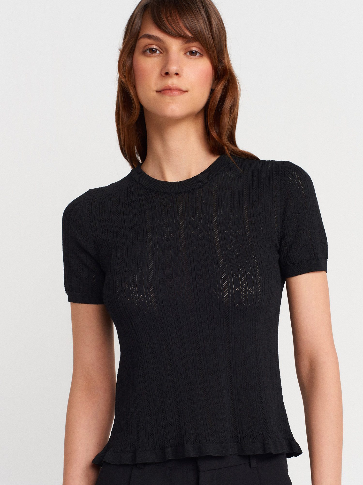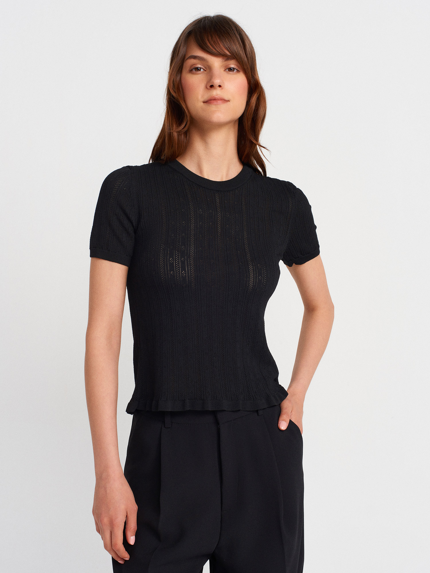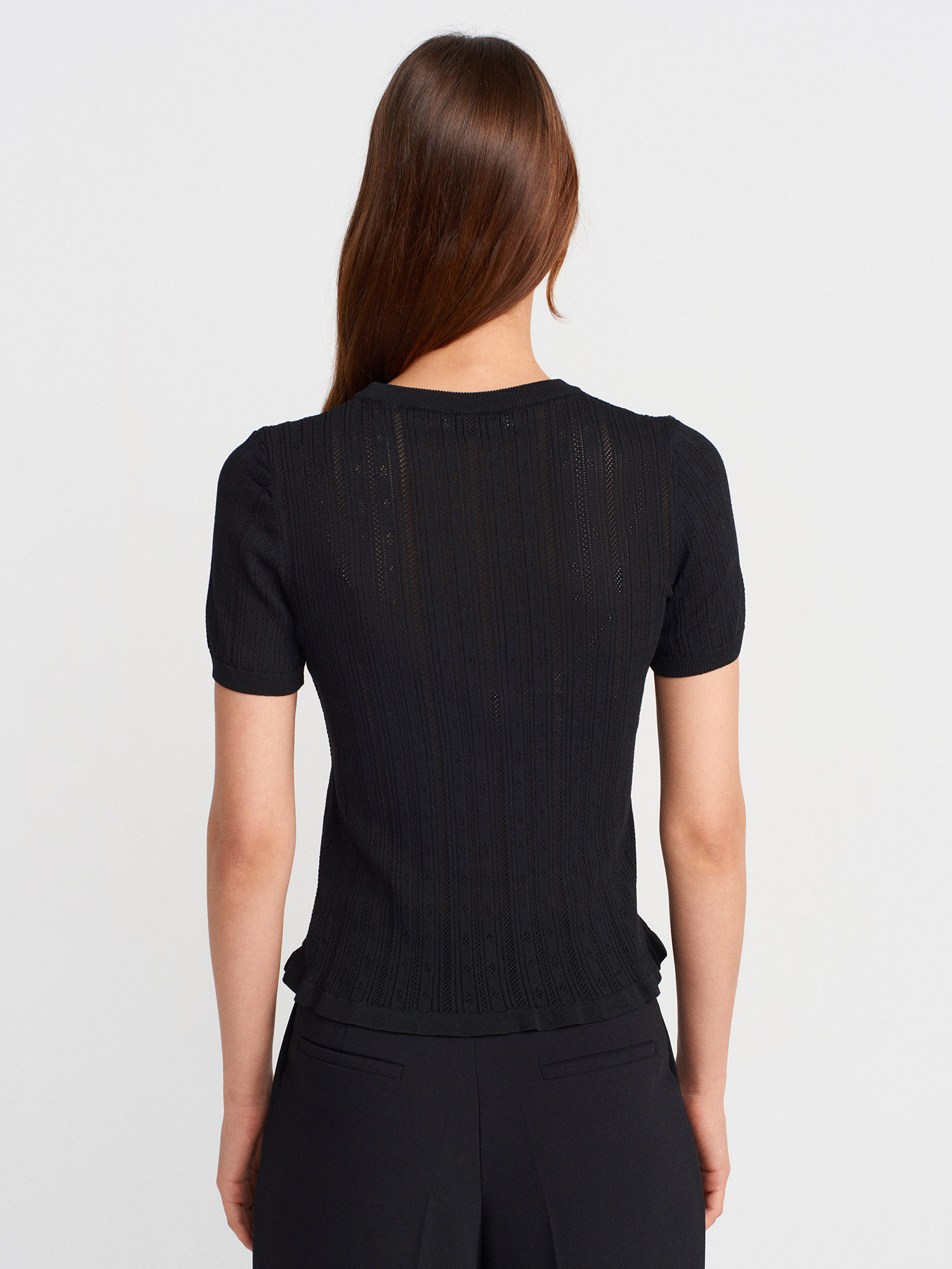 10762 Bisiklet Yaka Ajurlu Fırfırlı Bluz-Siyah