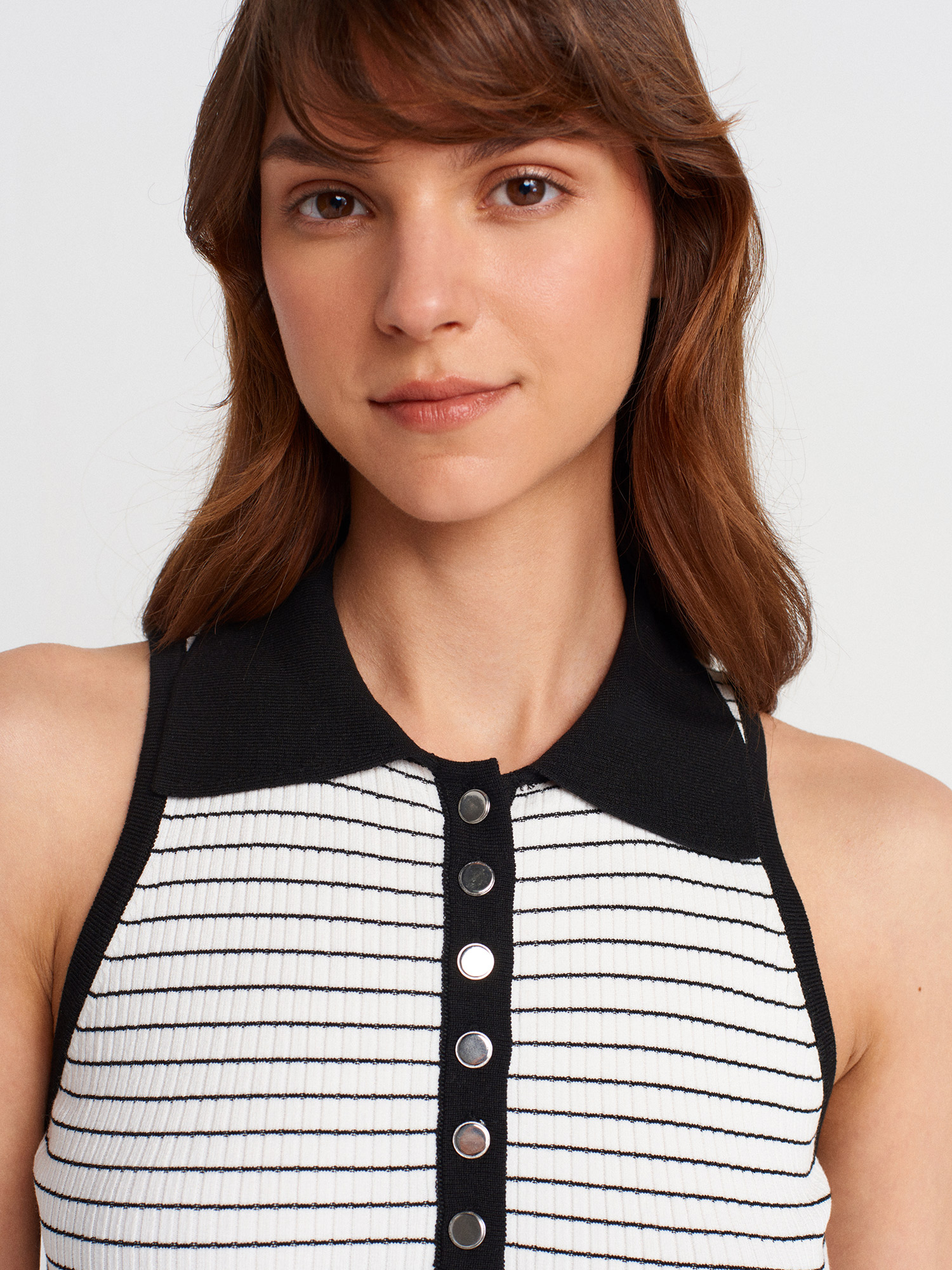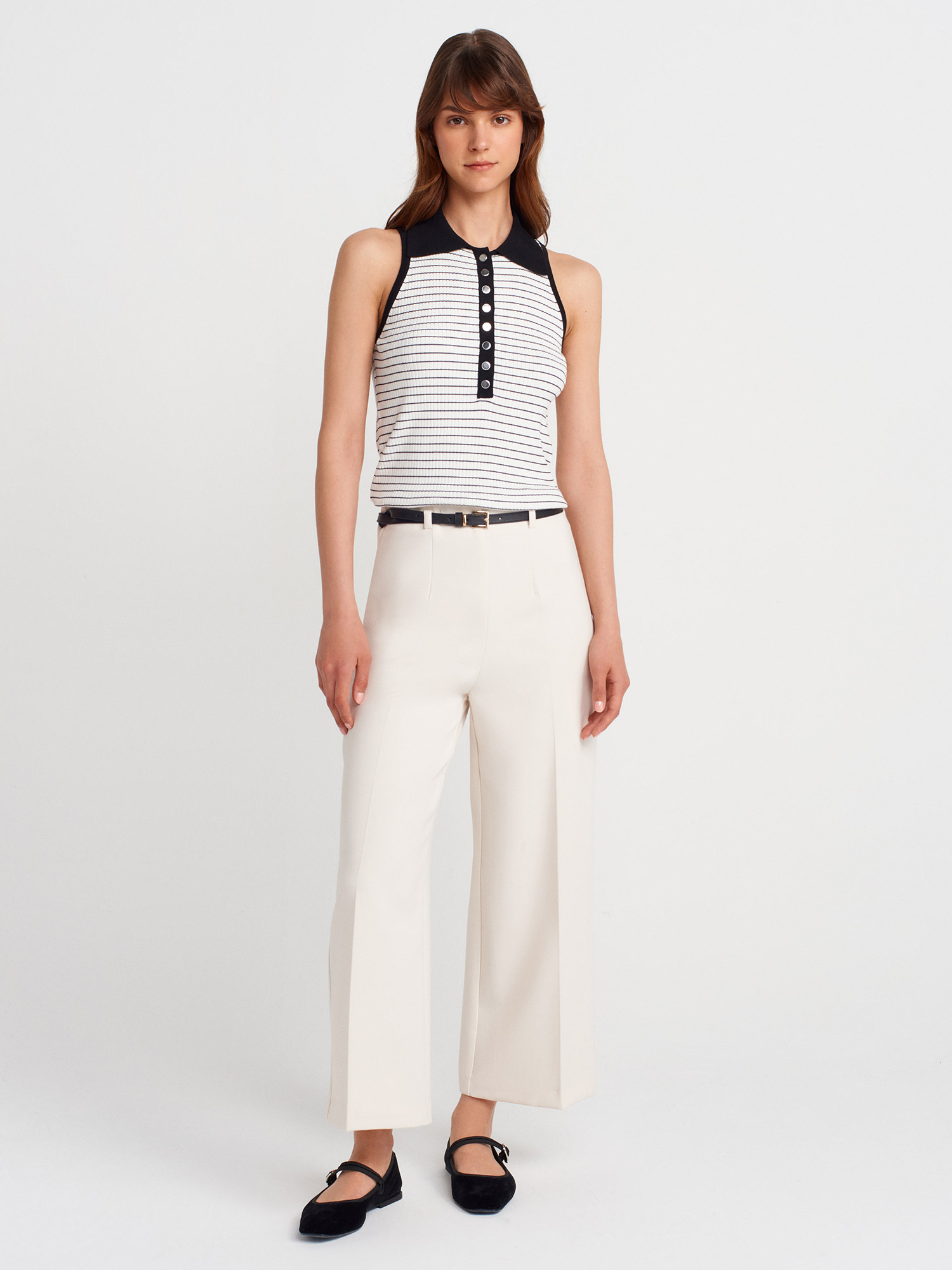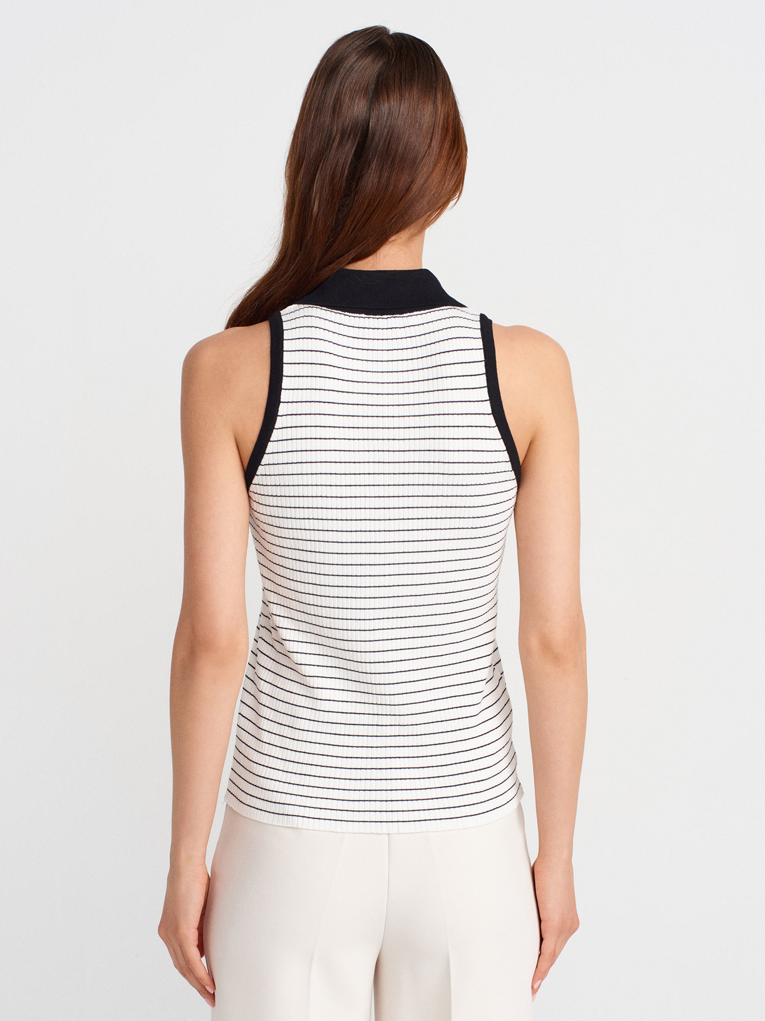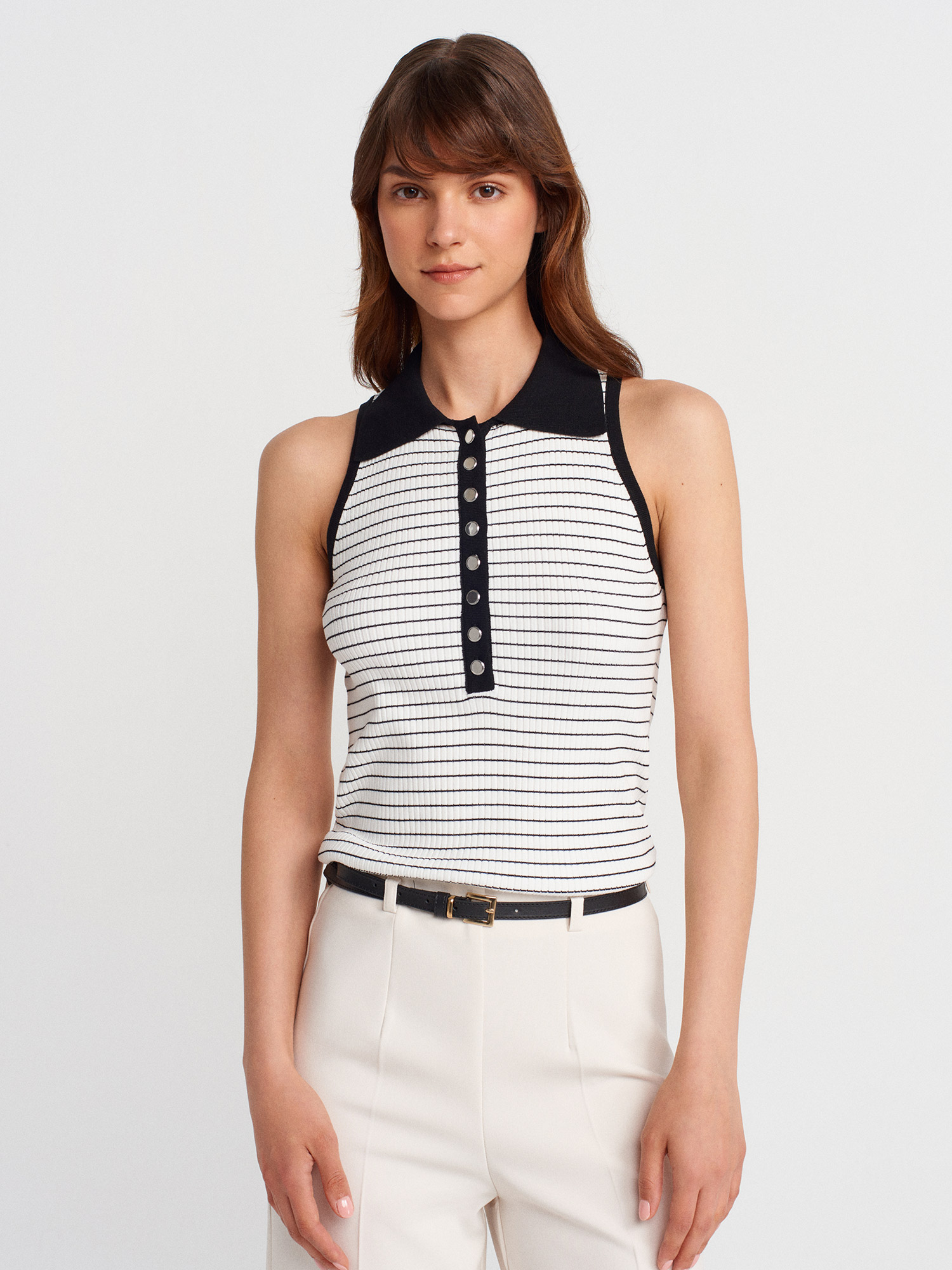 10763 Polo Yaka Çizgili Düğmeli Triko Bluz-Ekru-Siyah