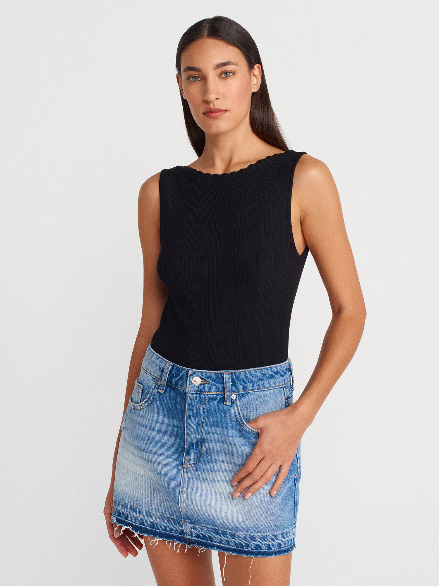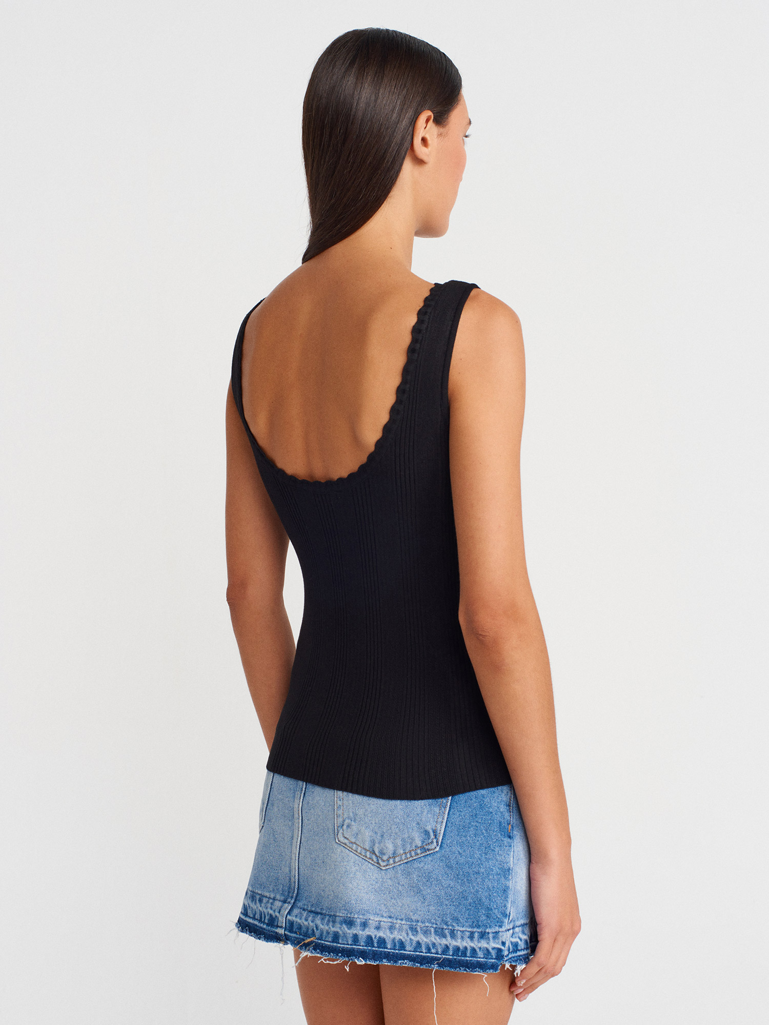 10764 Kayık Yaka Fitilli Triko Bluz-Siyah