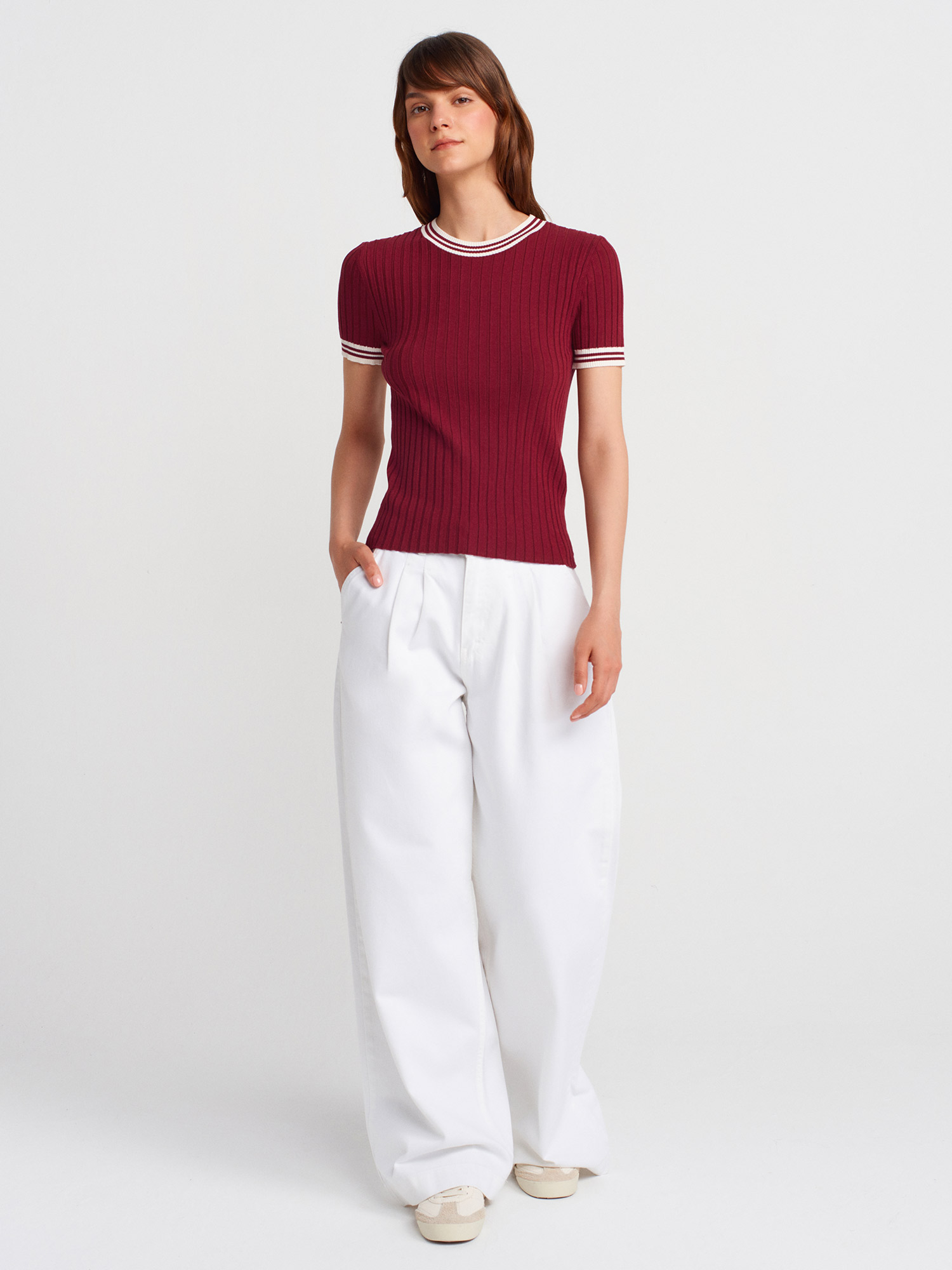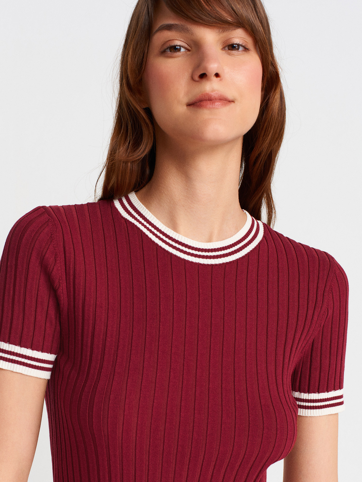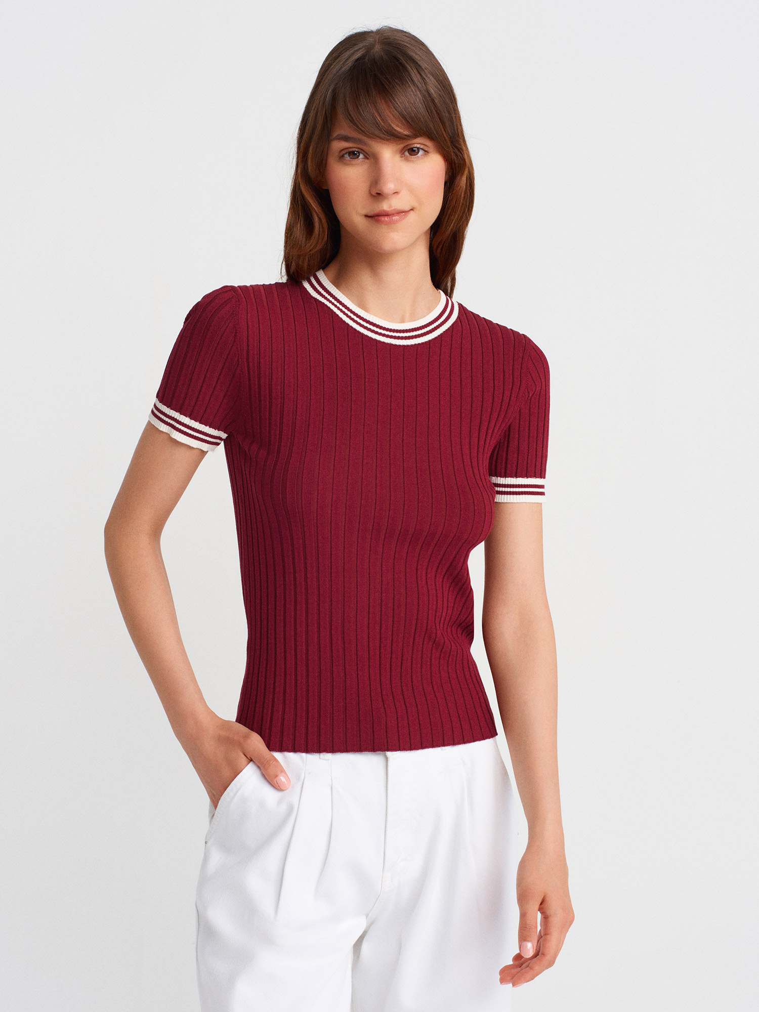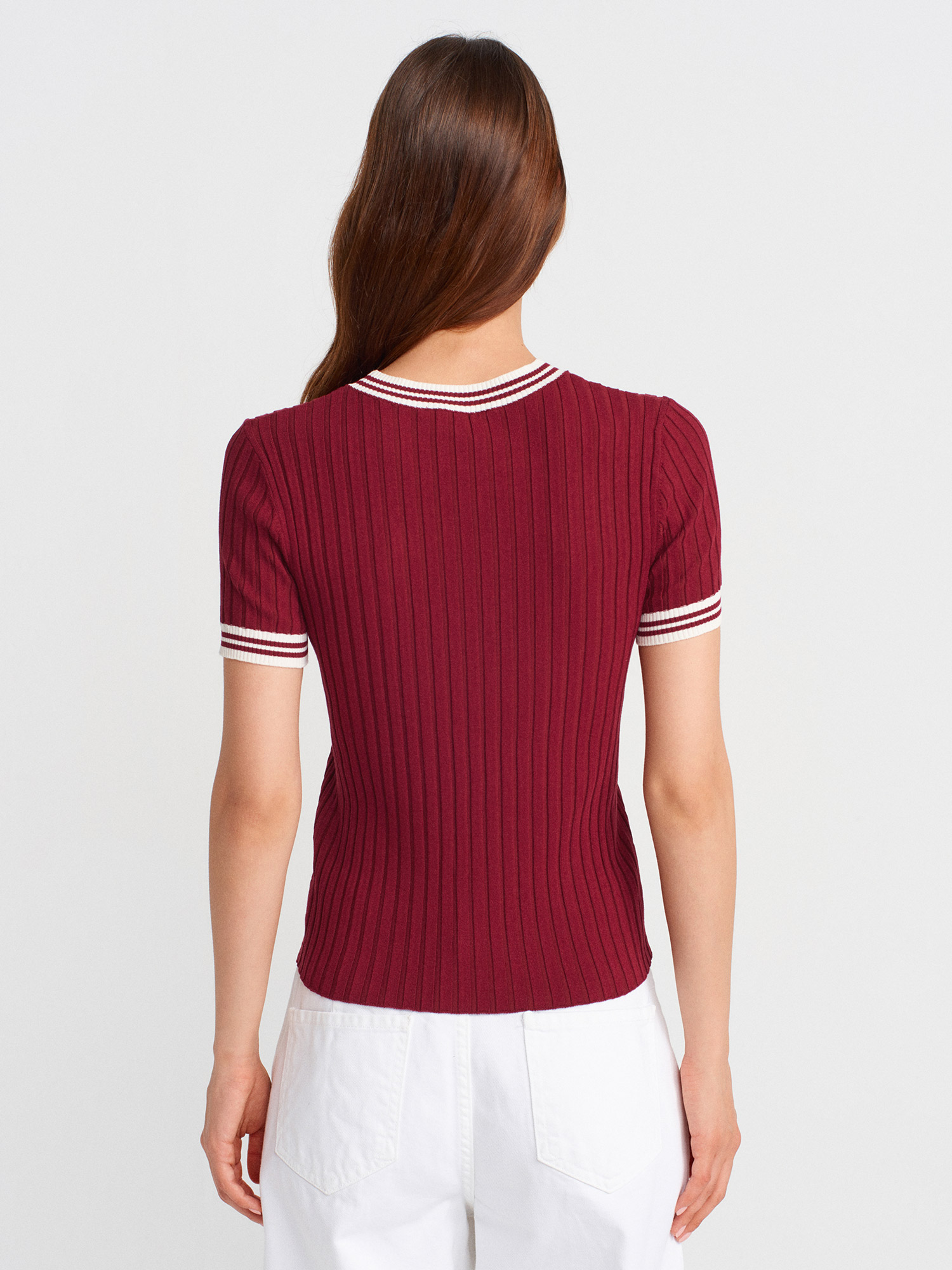10765 Bisiklet Yaka Çizgili Triko Bluz-Bordo-Krem