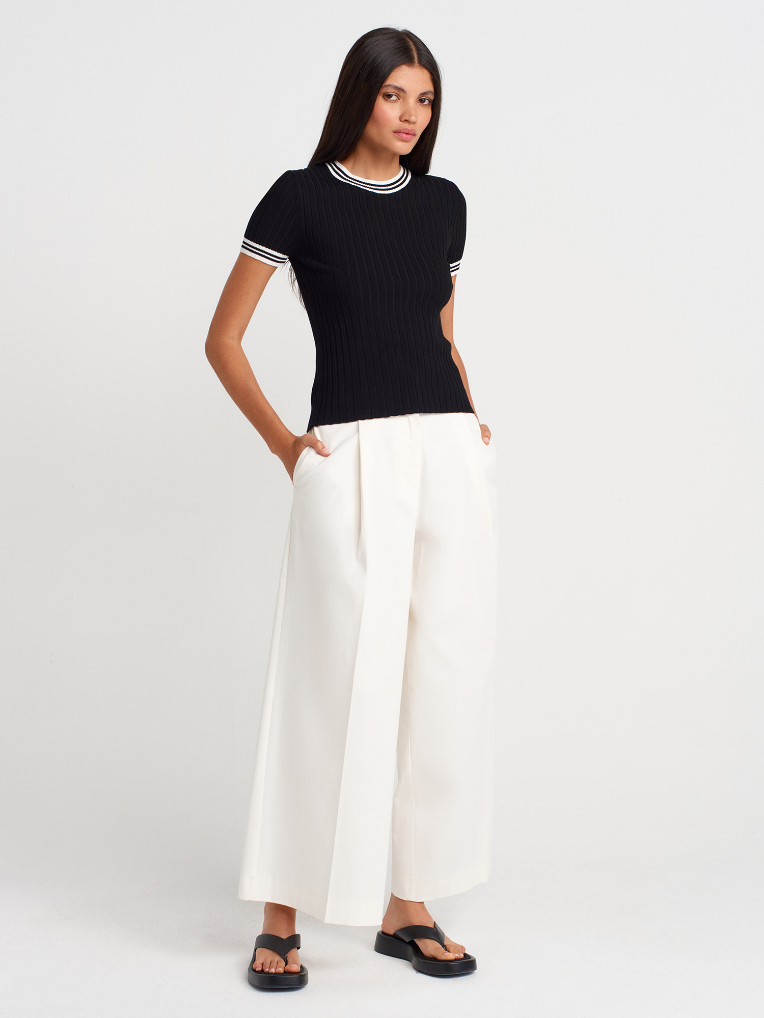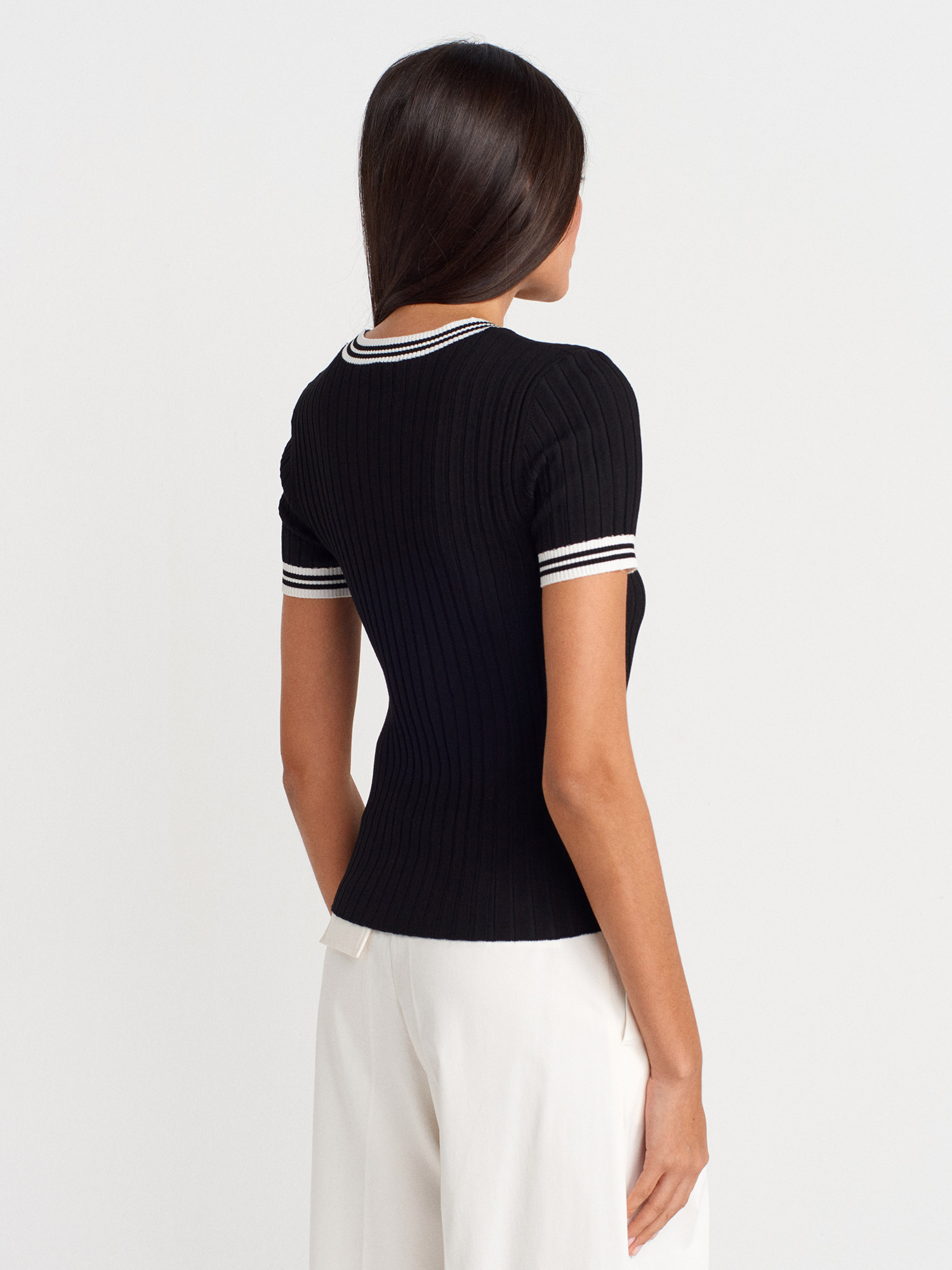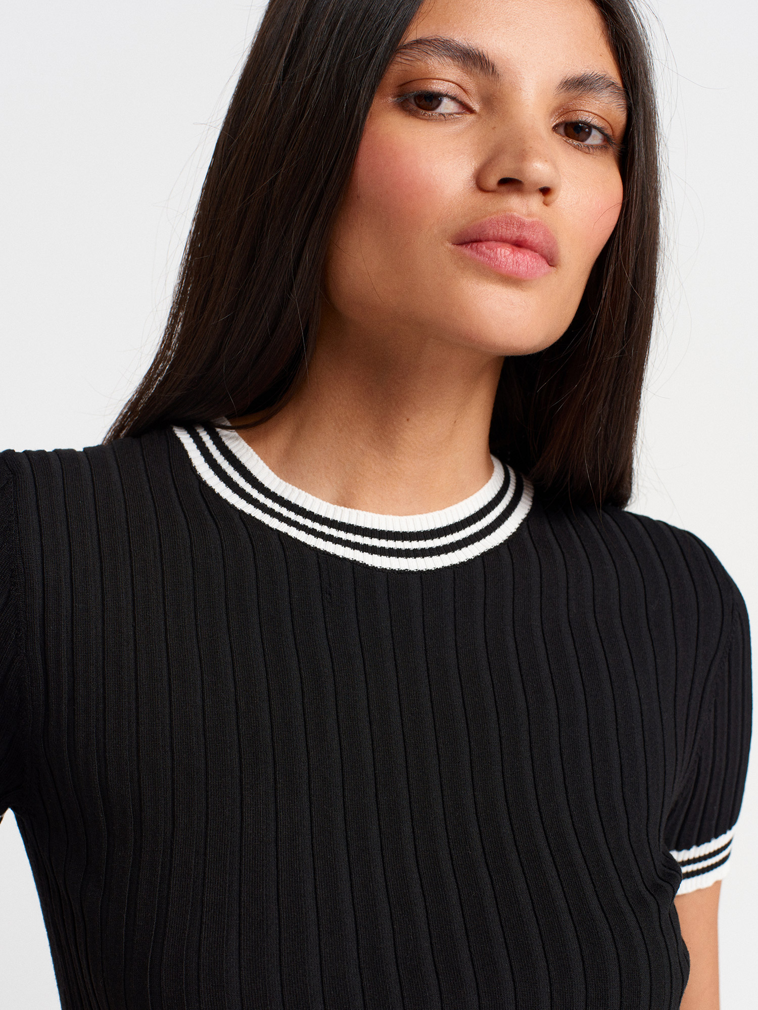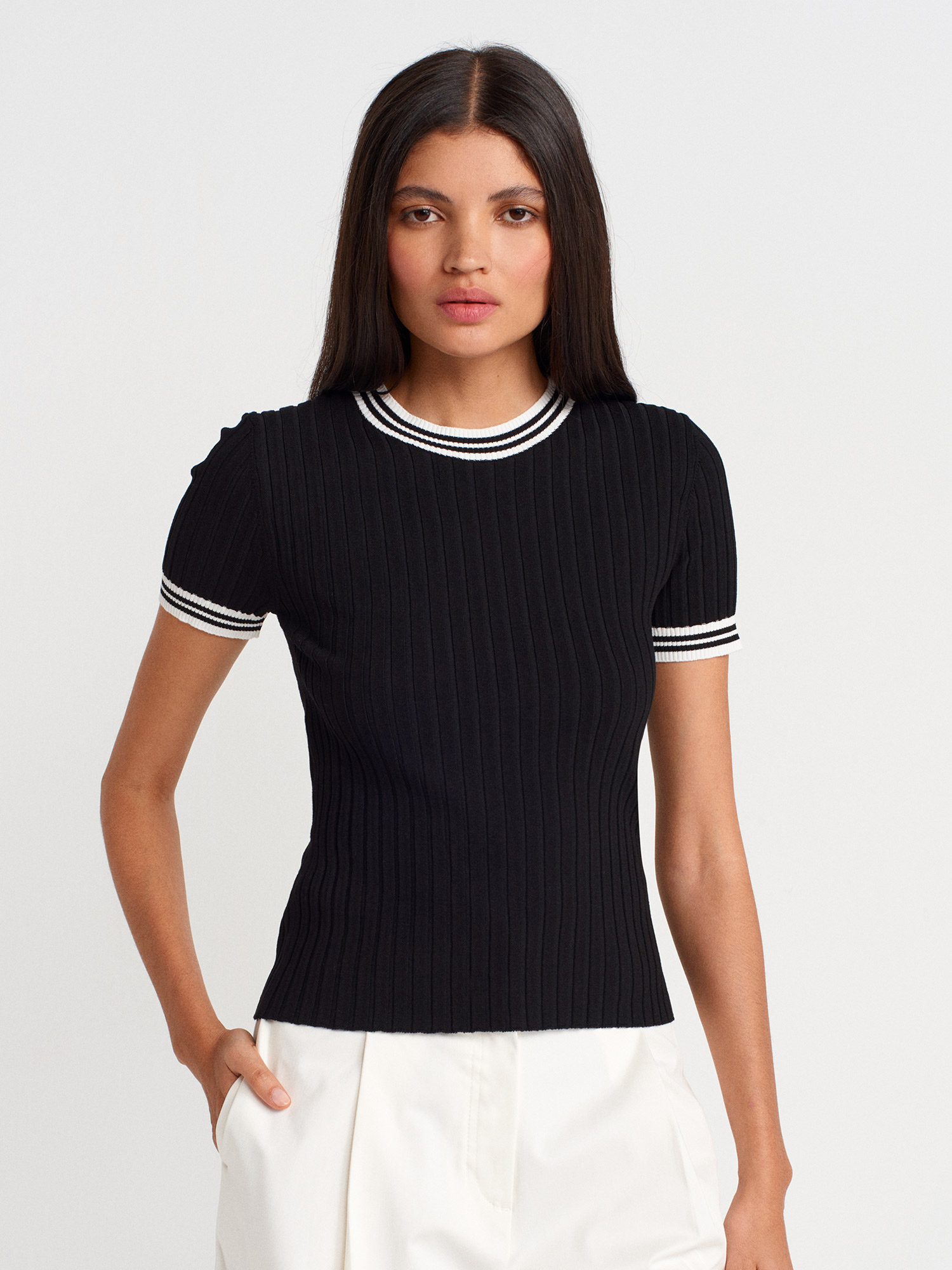 10765 Bisiklet Yaka Çizgili Triko Bluz-Siyah-Ekru