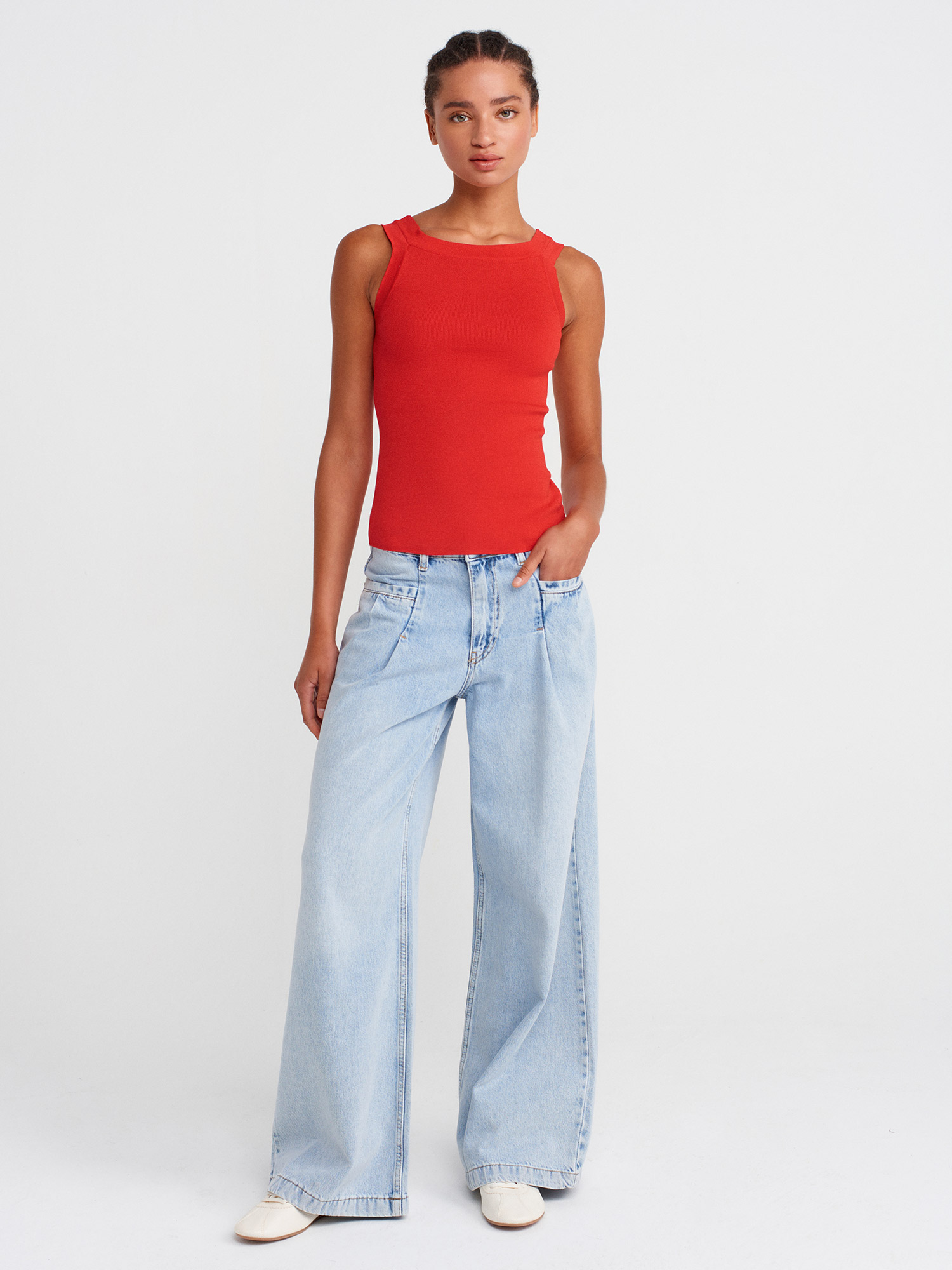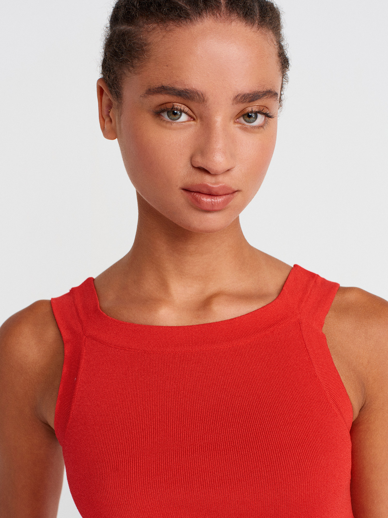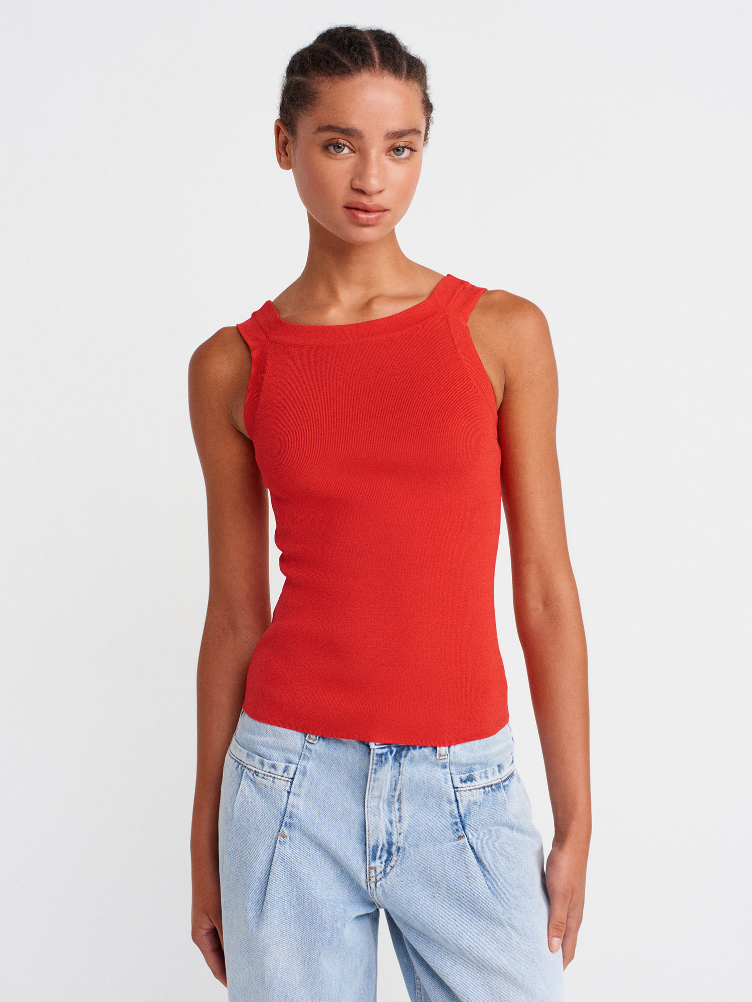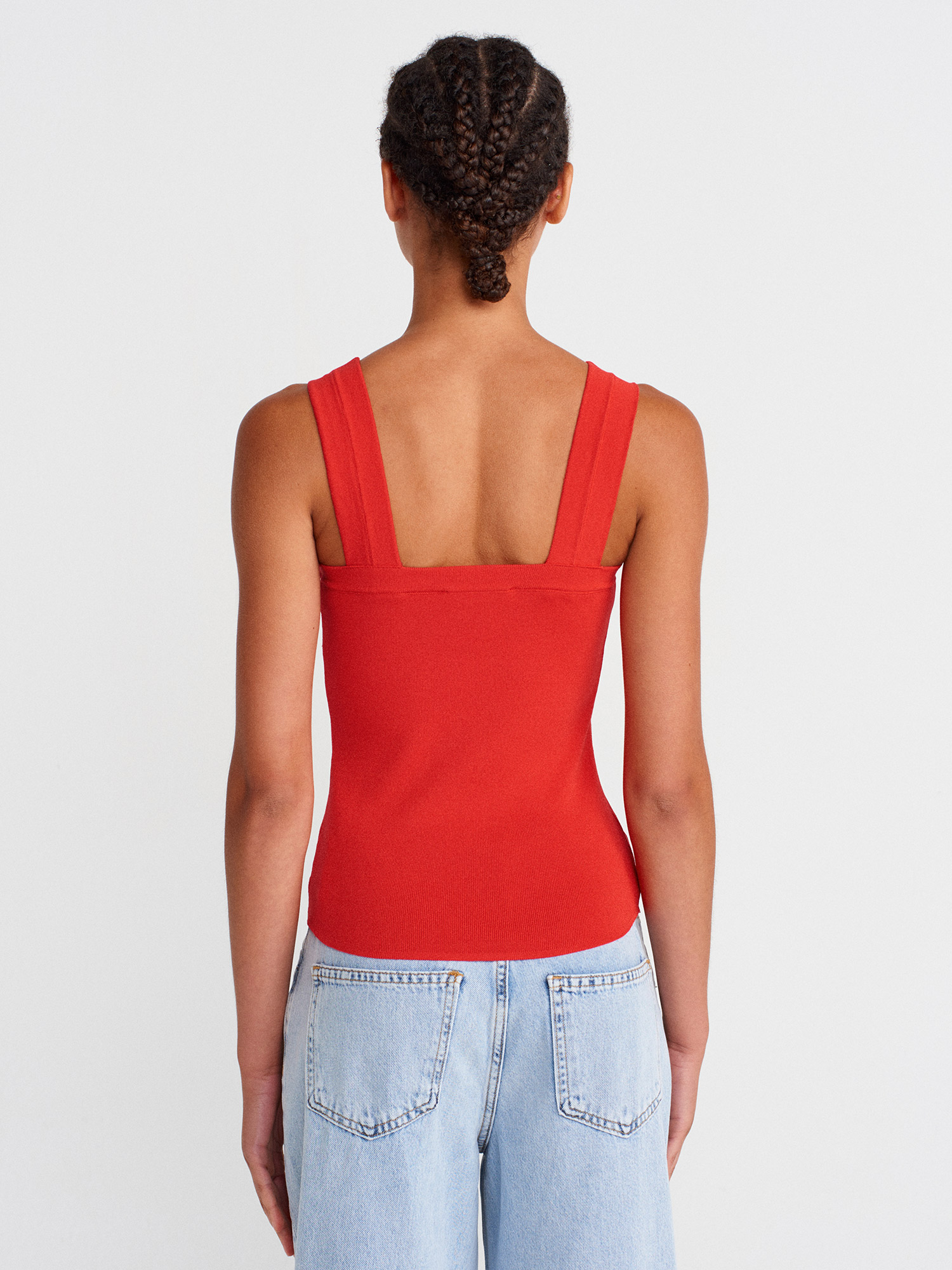 10770 Kare Yaka Askılı Triko Bluz-Kırmızı