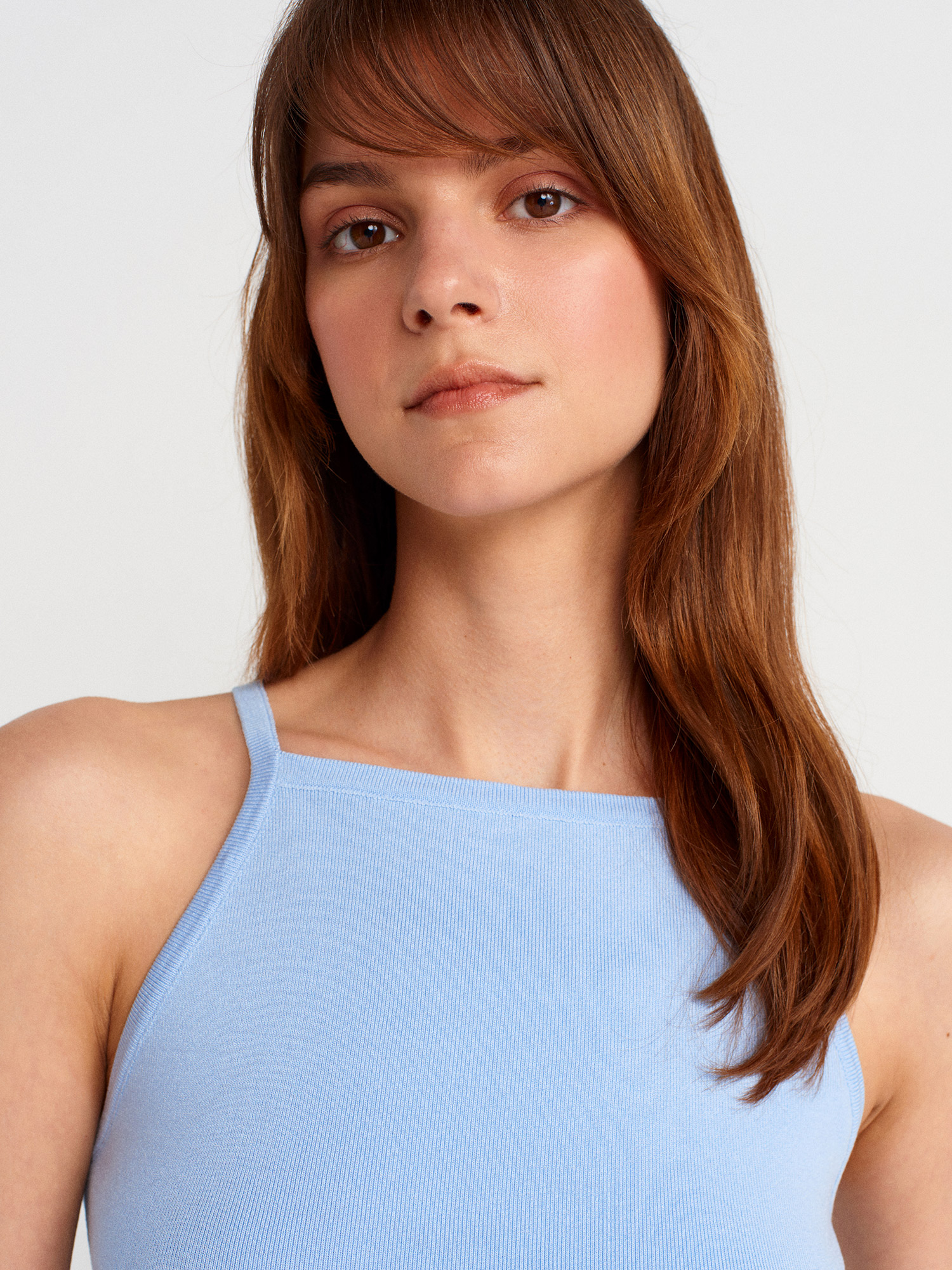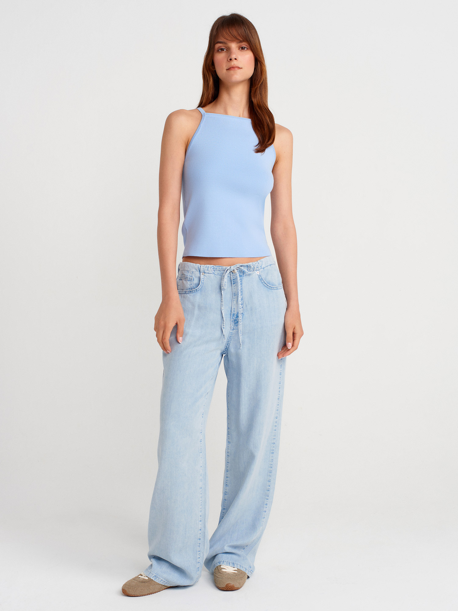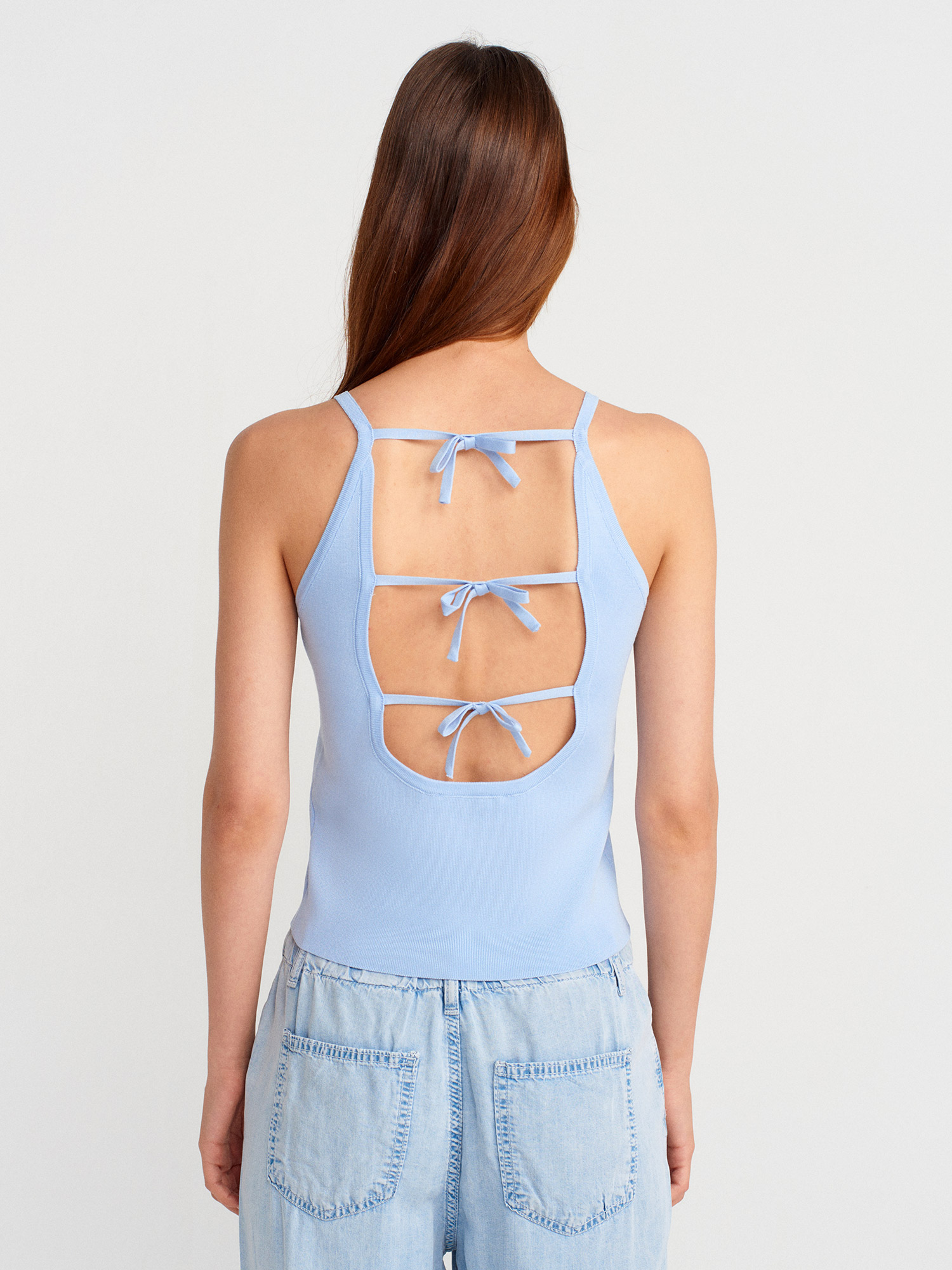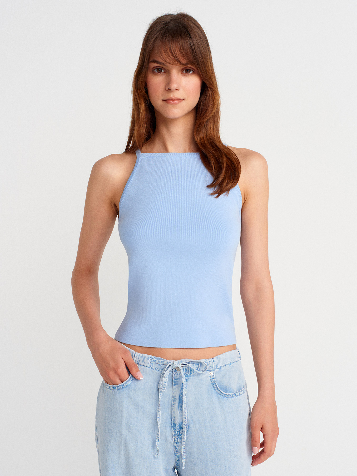 10772 Askılı Fiyonk Detaylı Triko Bluz-Mavi