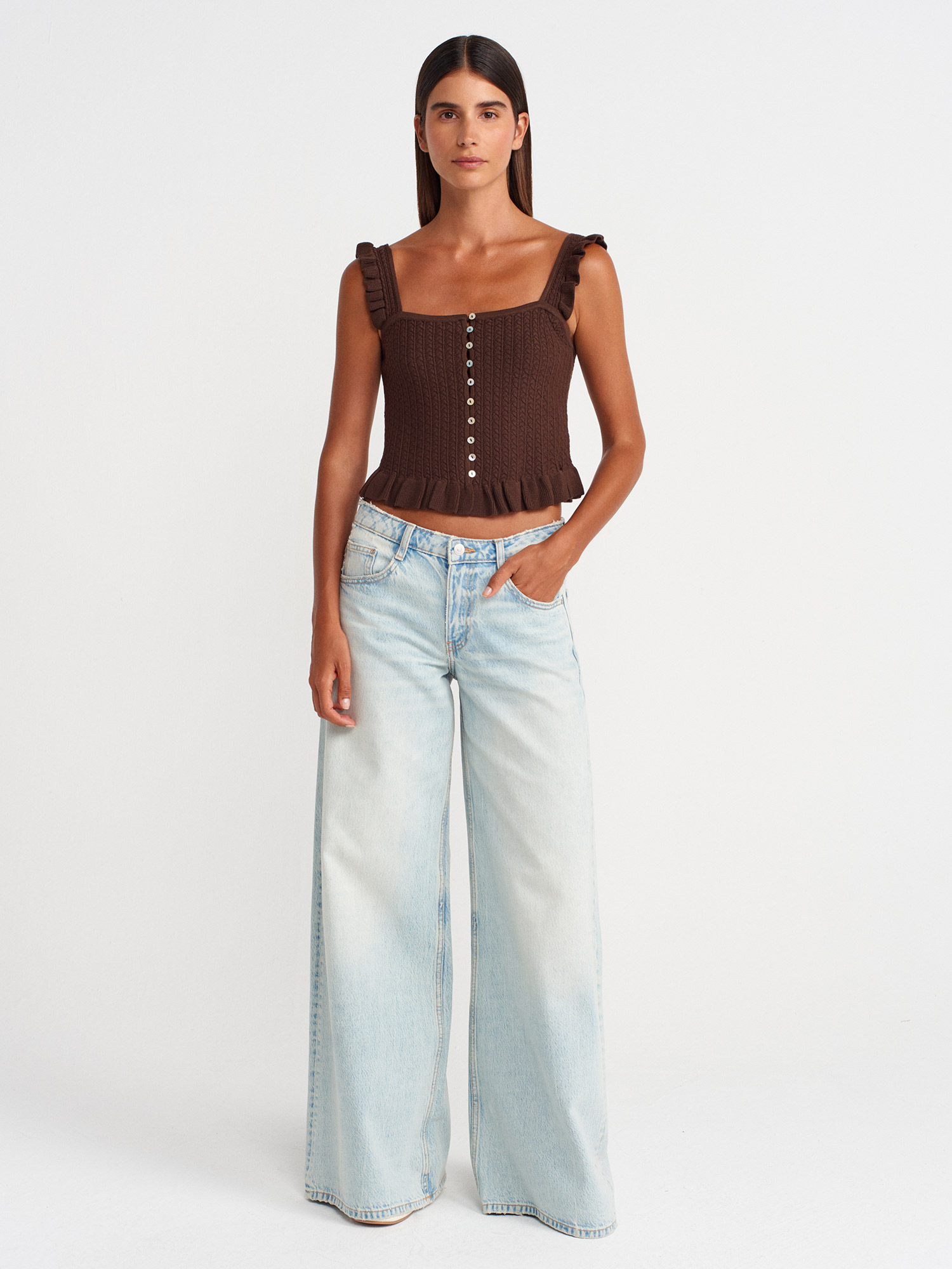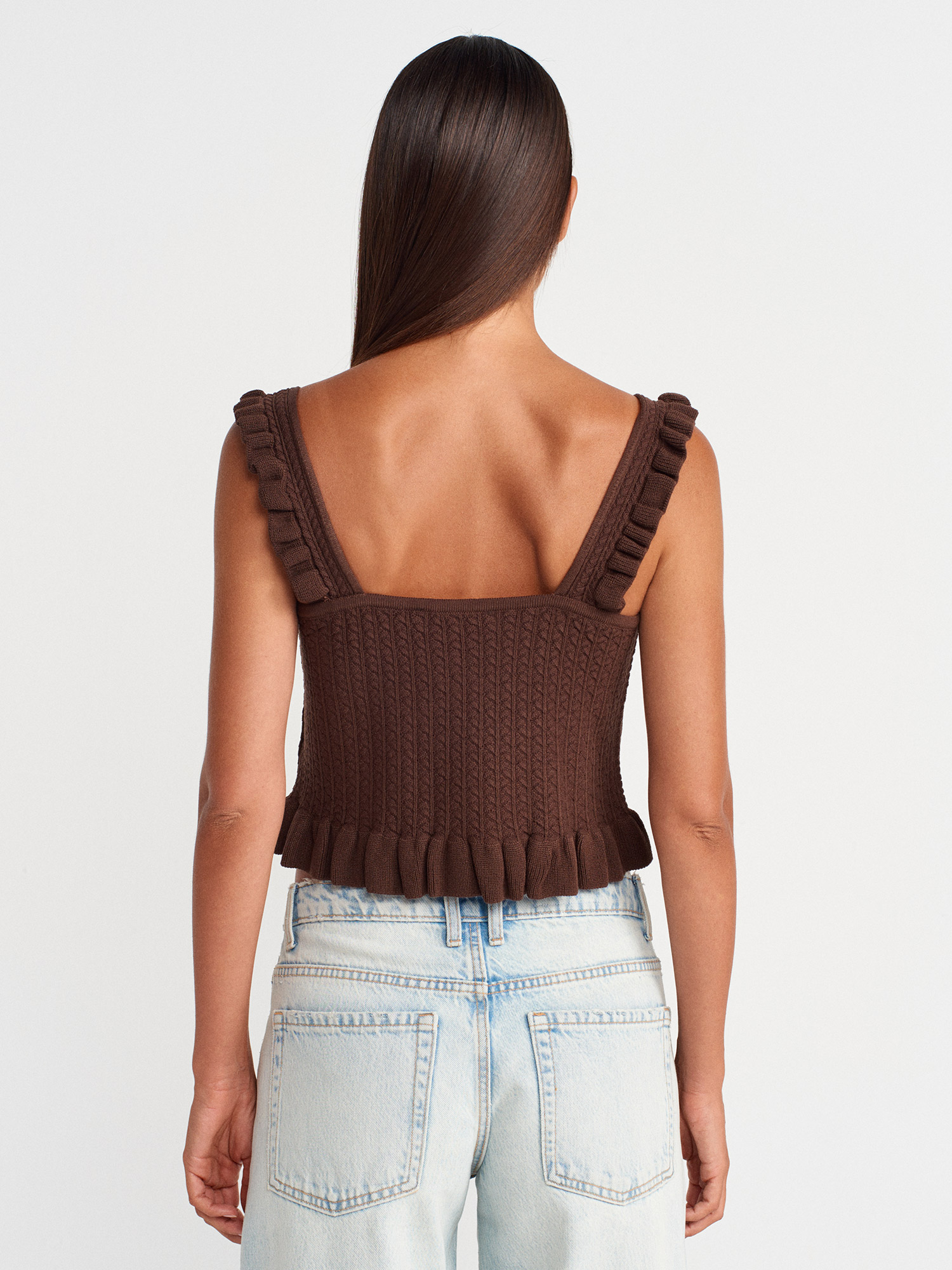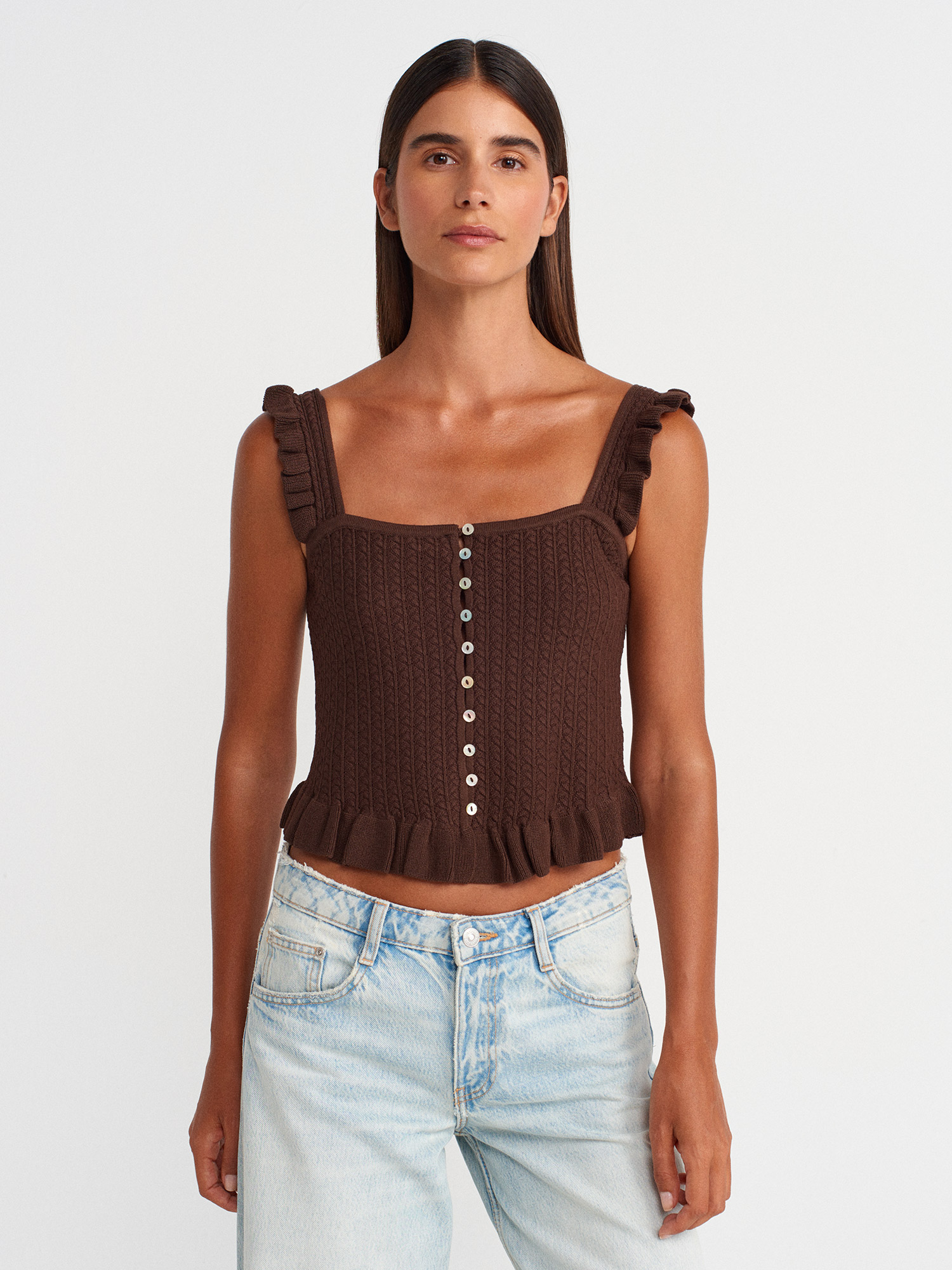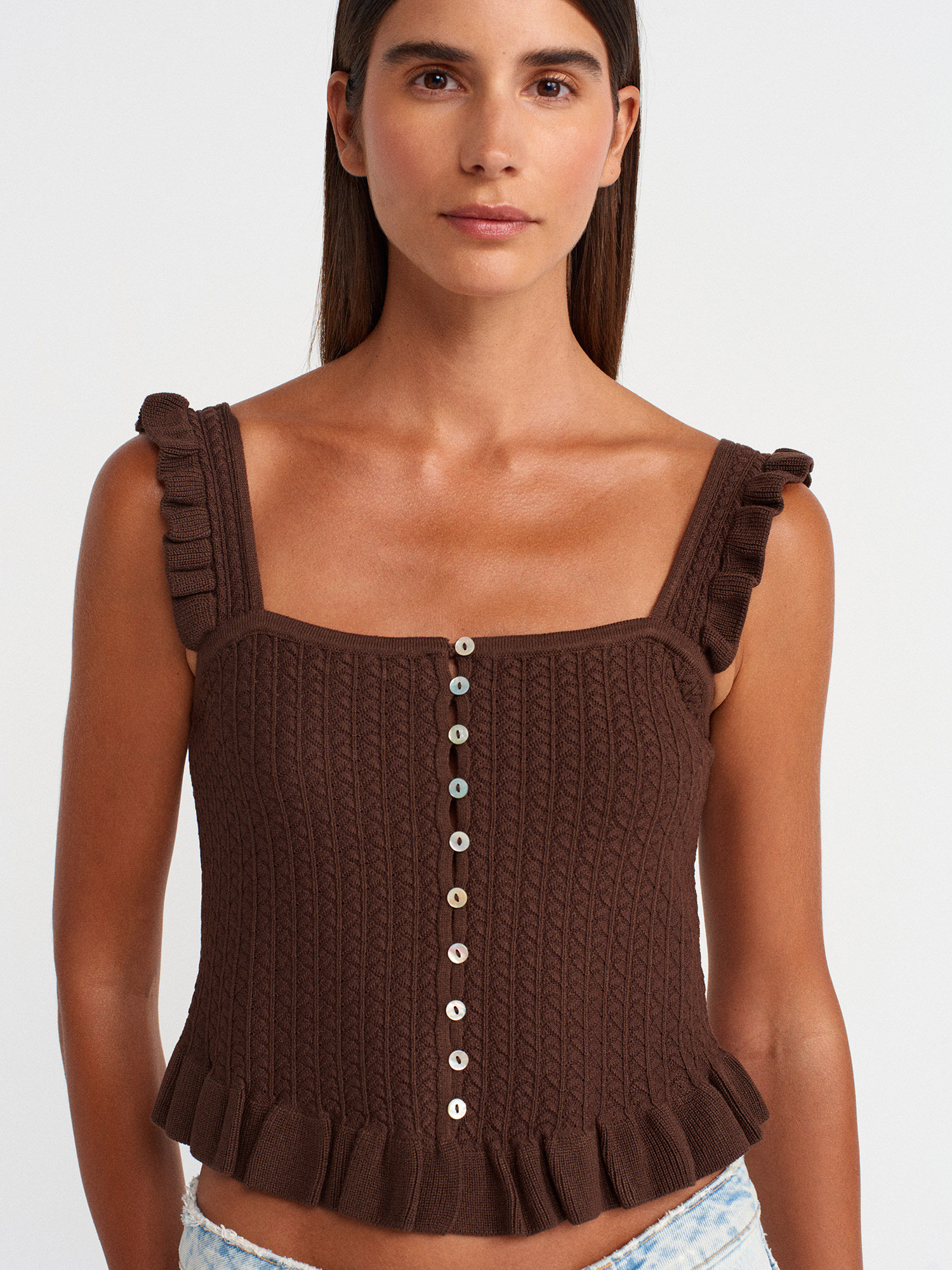 10774 Askılı Fırfırlı Düğmeli Top Bluz-Kahve