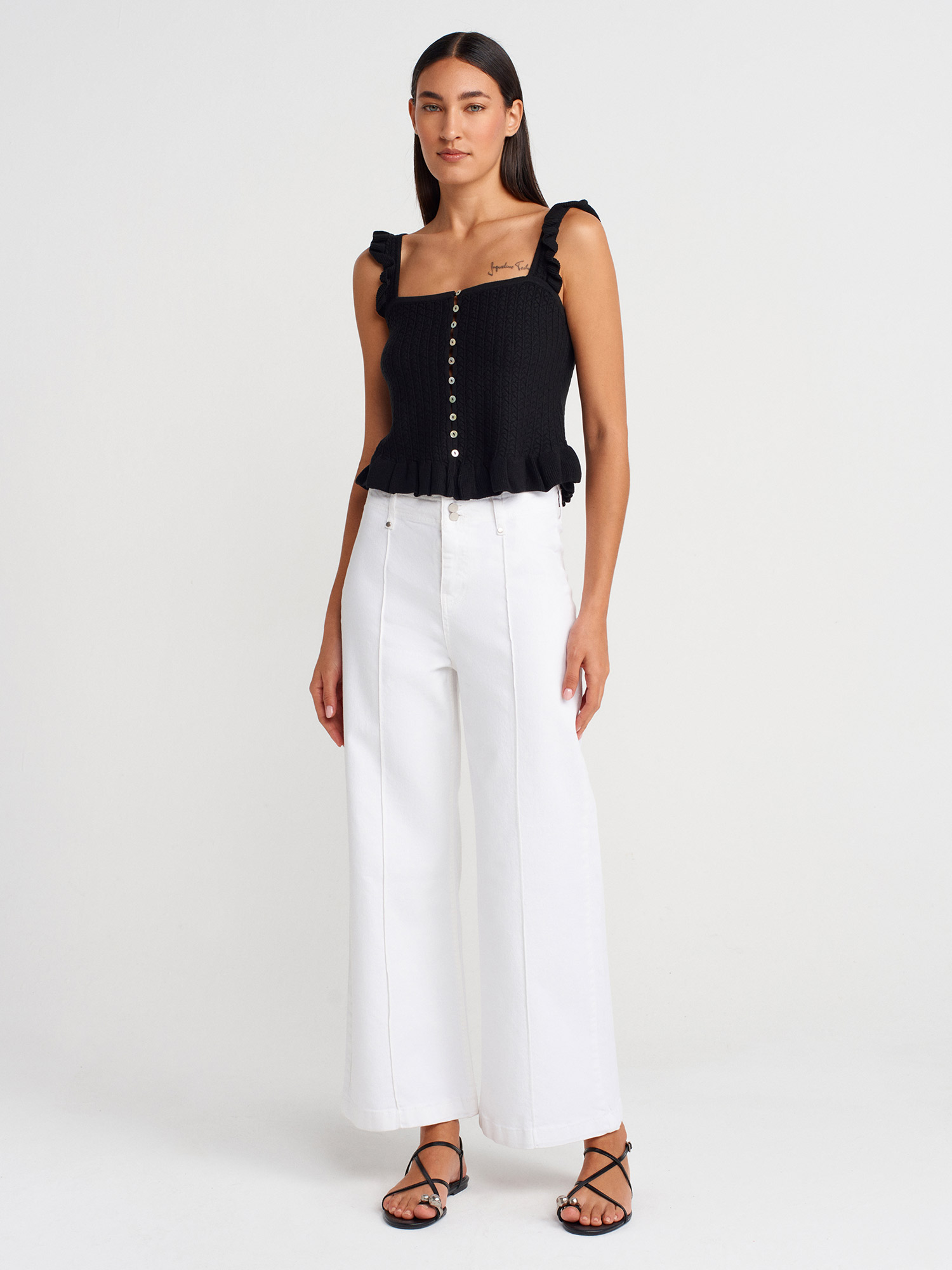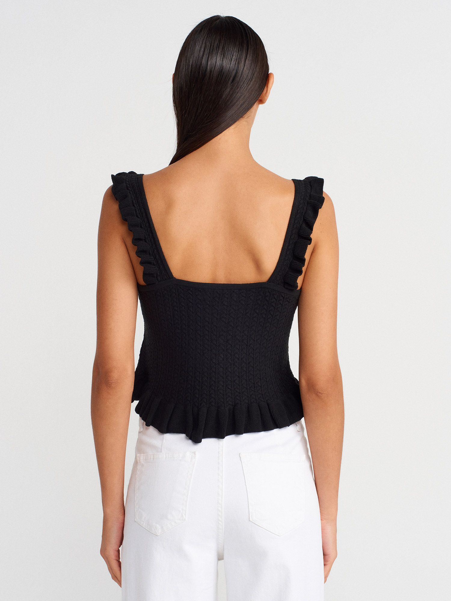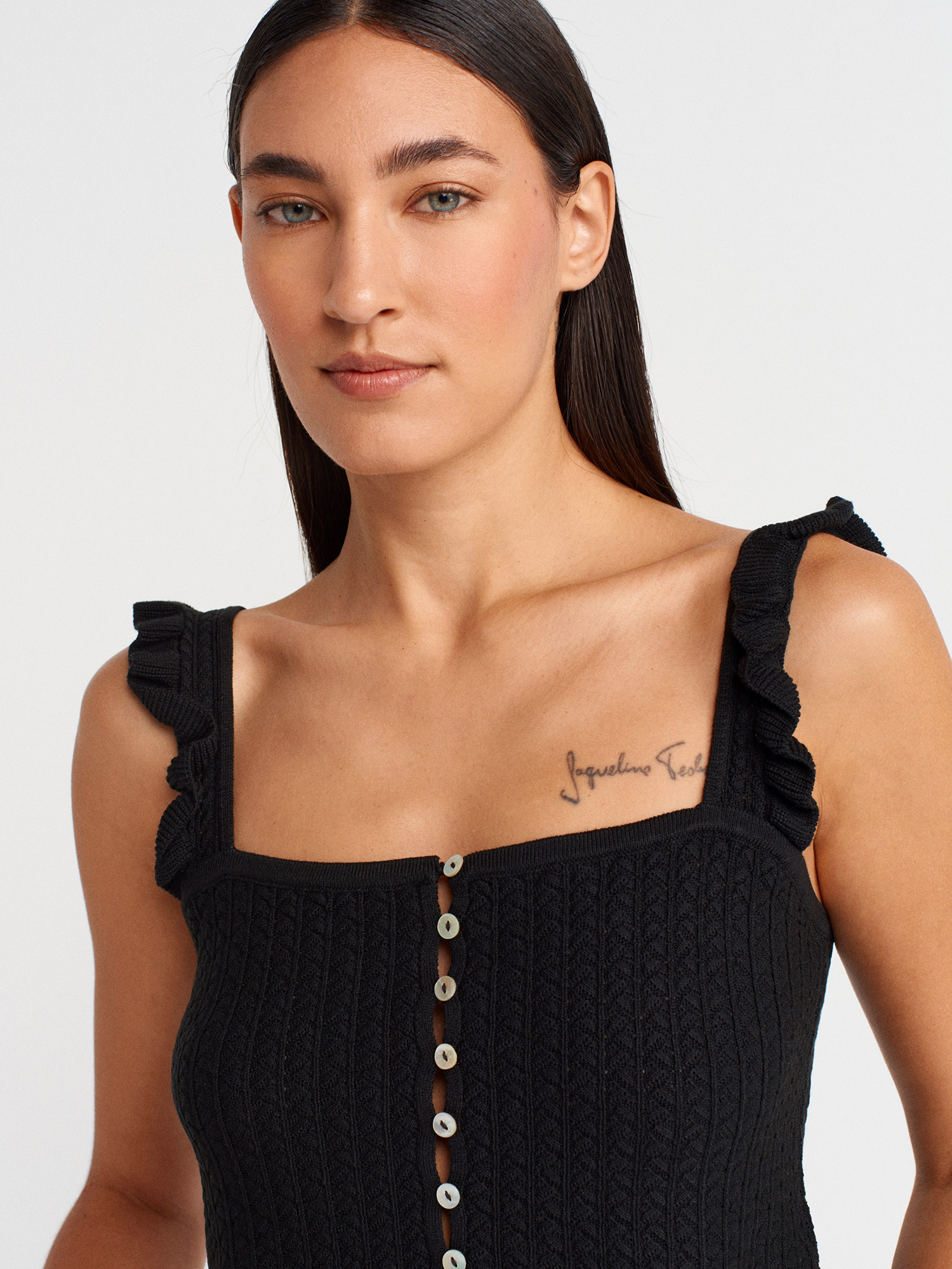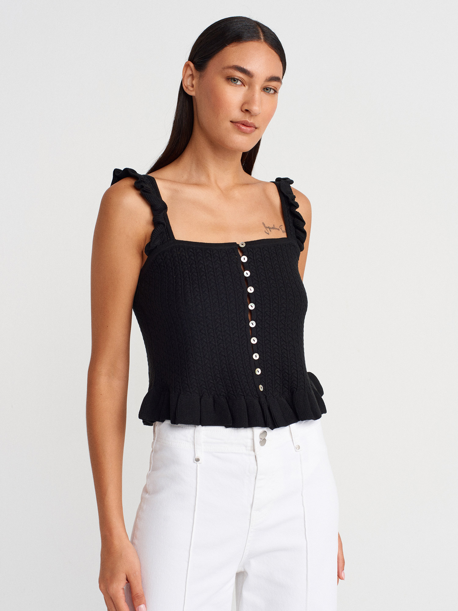 10774 Askılı Fırfırlı Düğmeli Top Bluz-Siyah