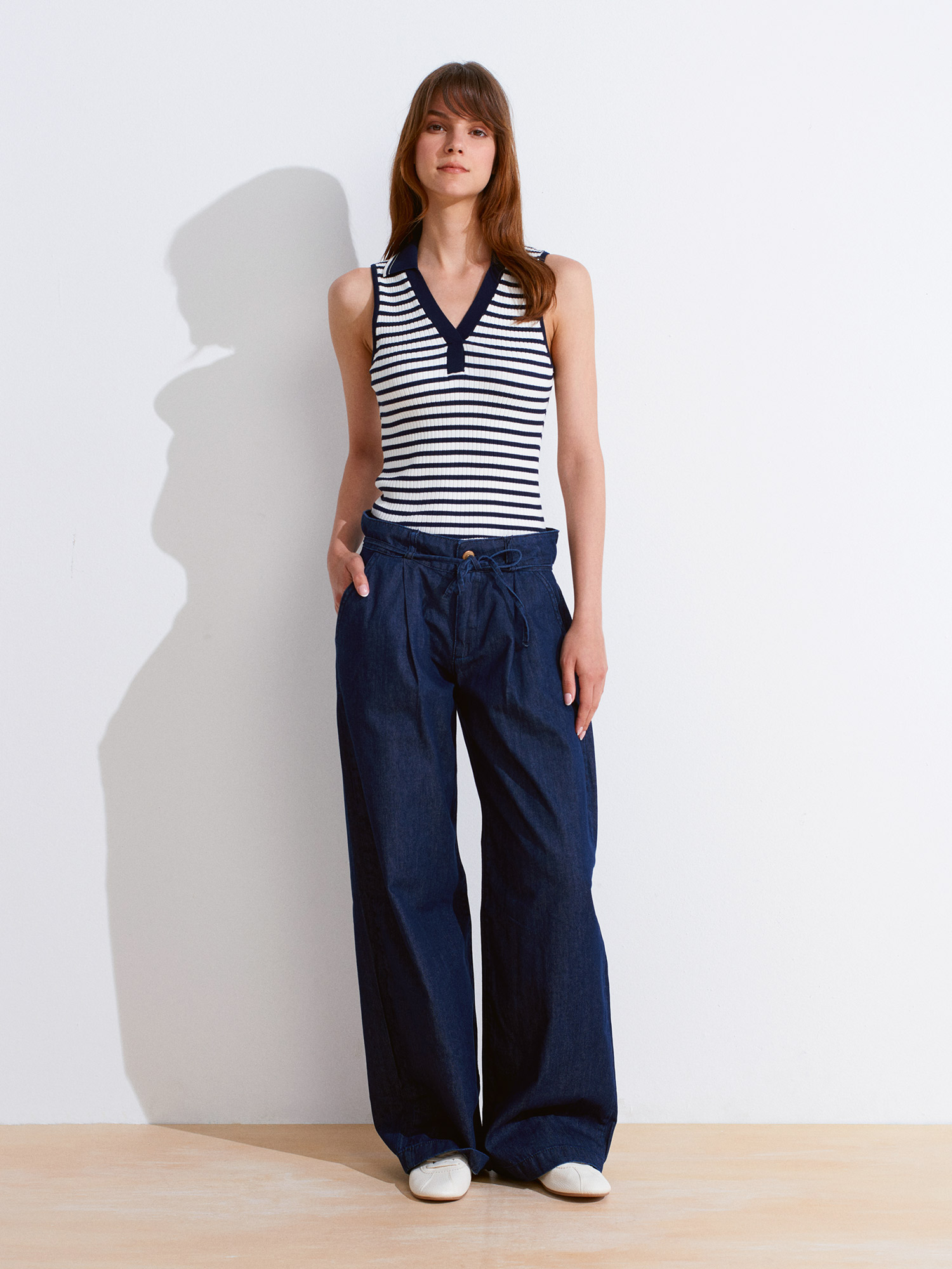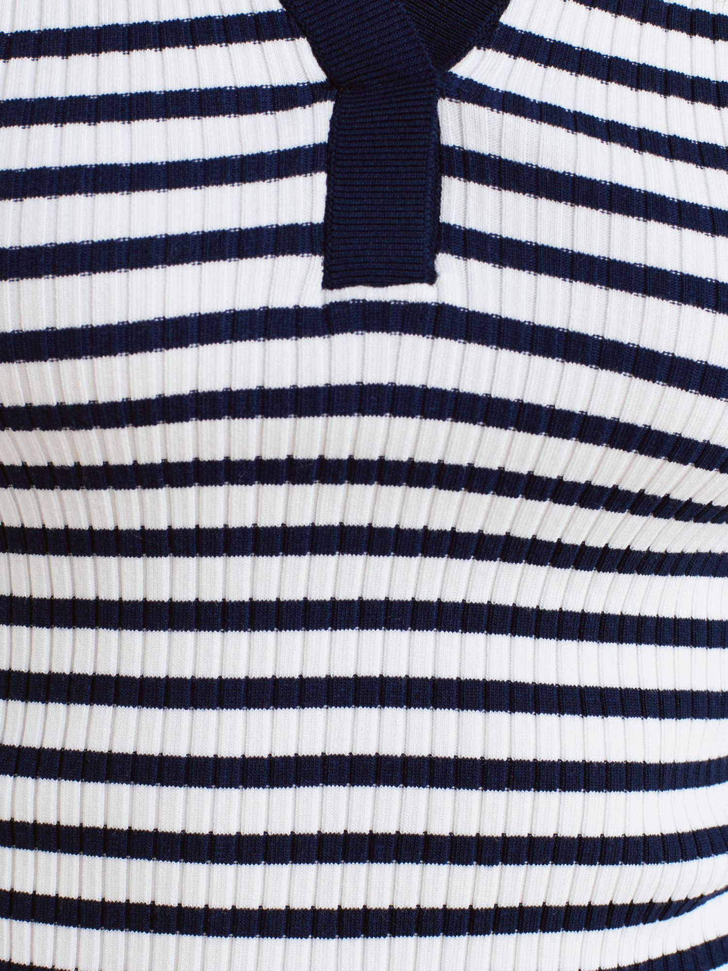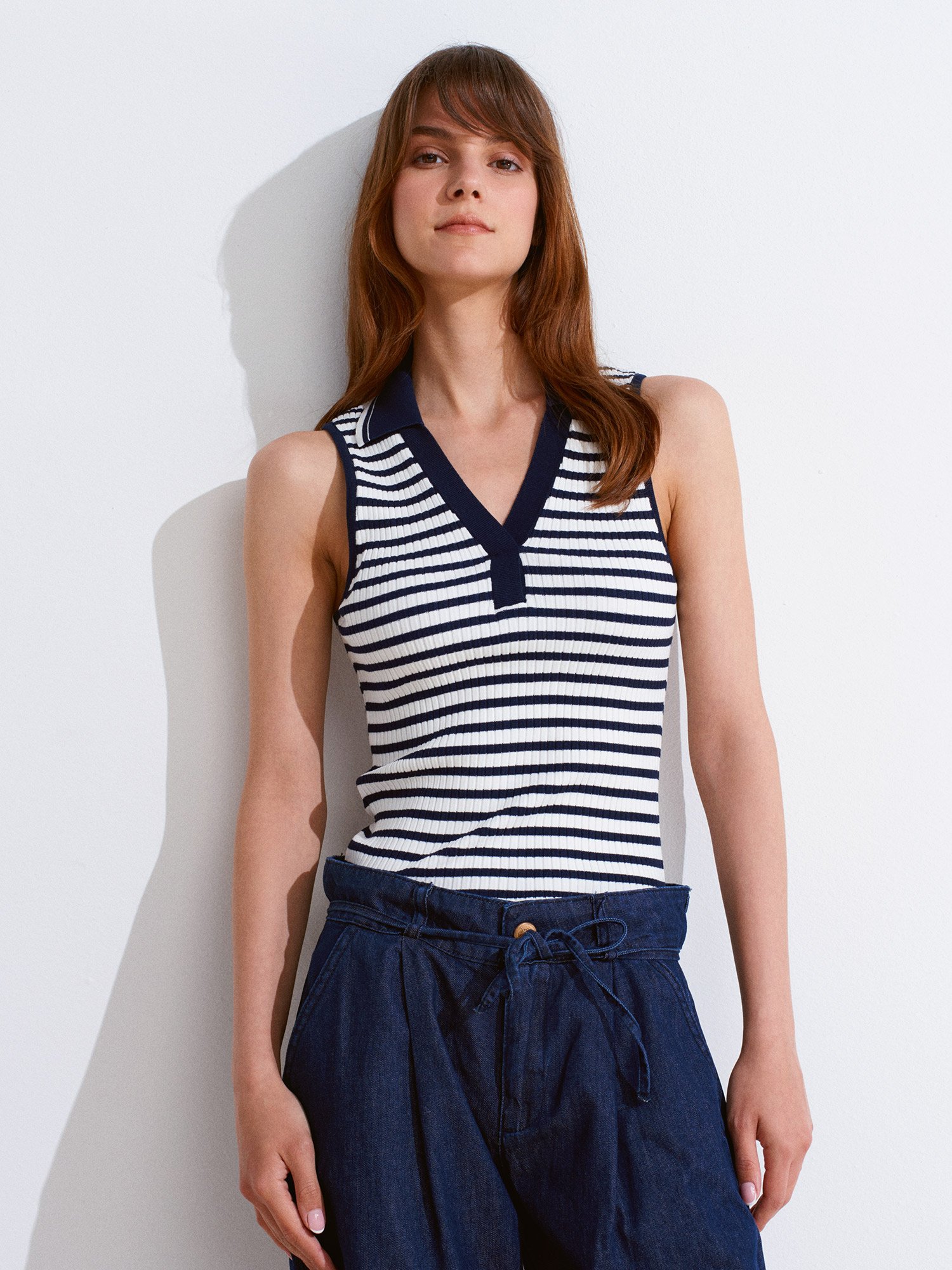 10777 V Polo Yaka Çizgili Fitilli Triko Bluz-Laci-Ekru