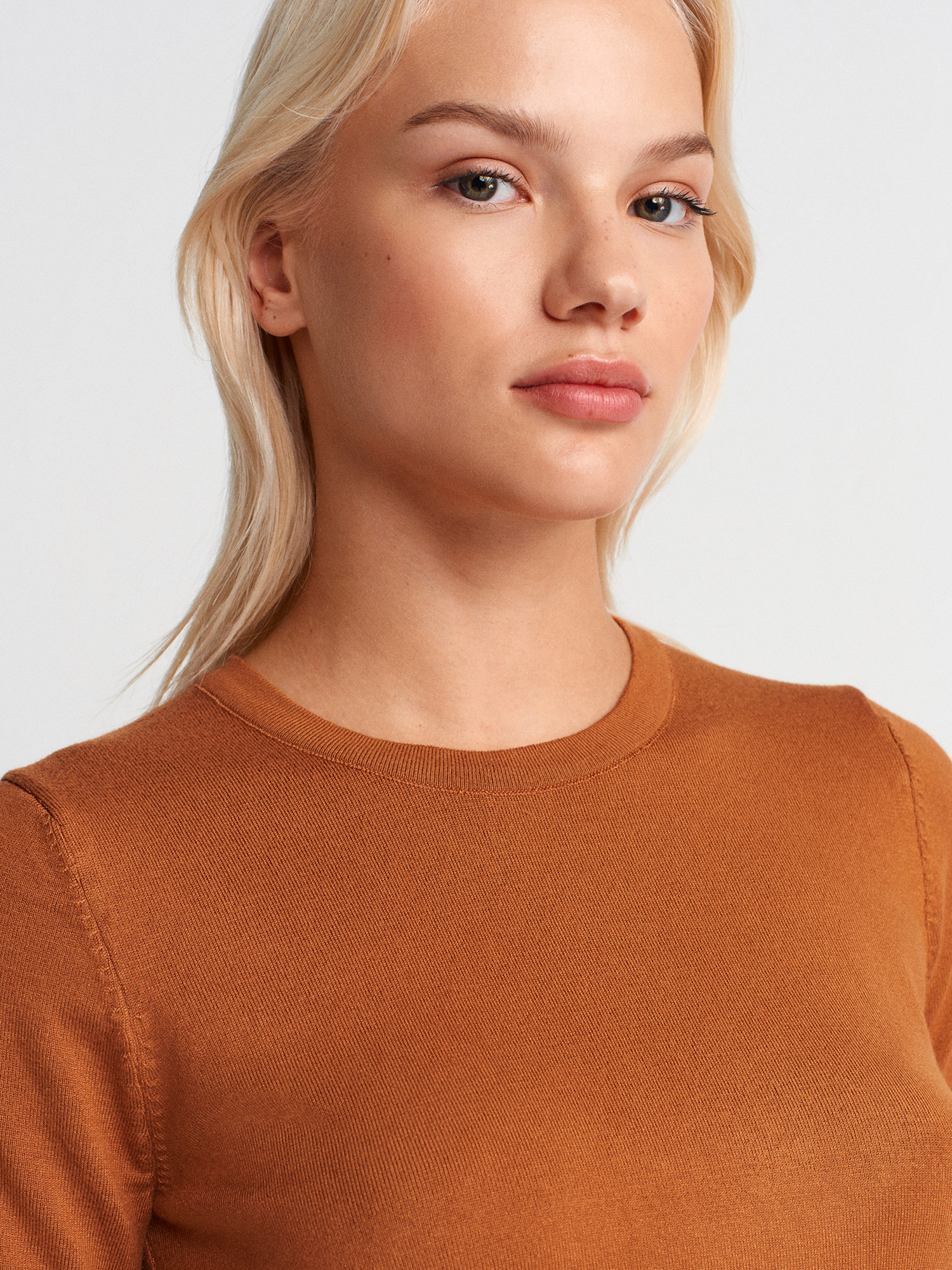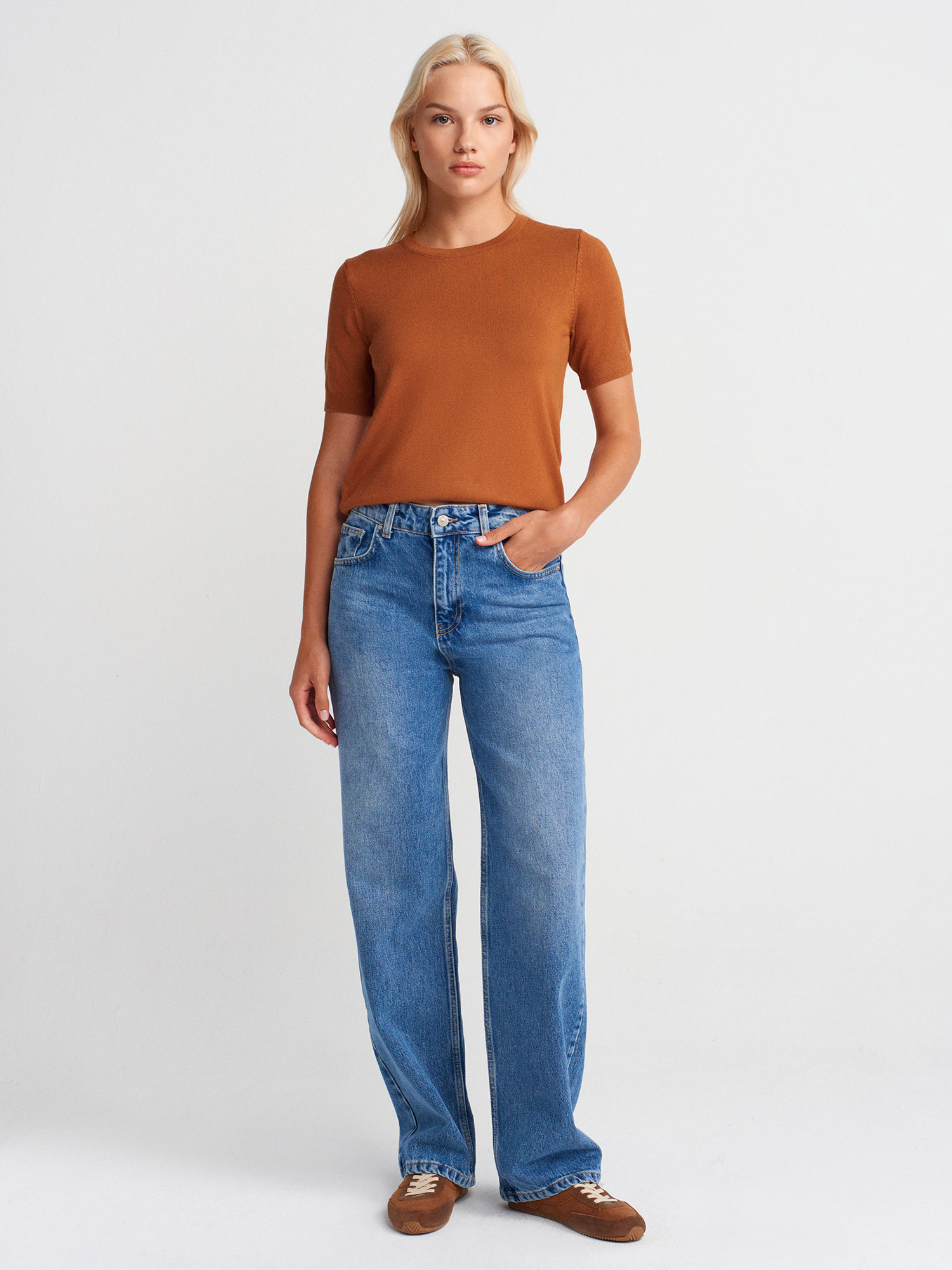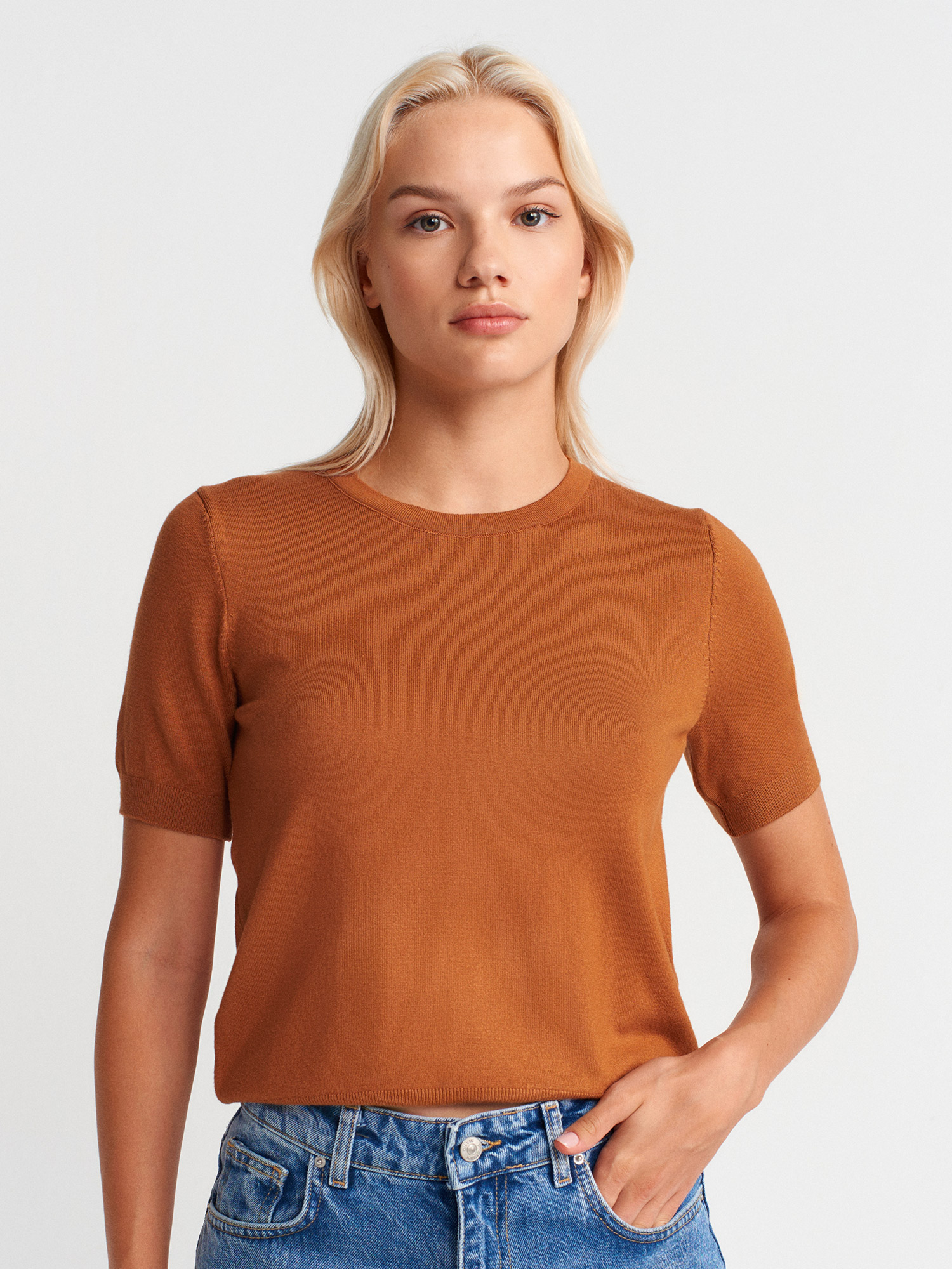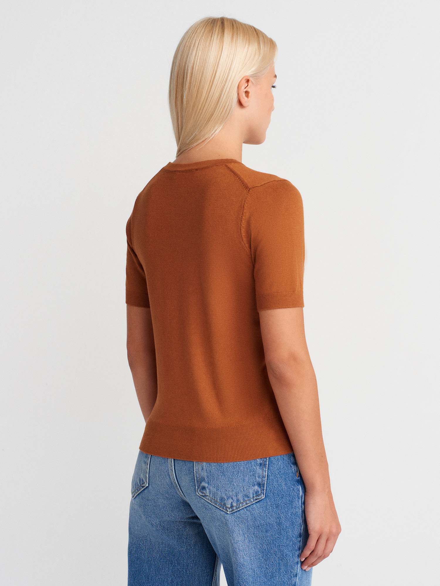 10779 Bisiklet Yaka Kısa Kollu Triko Bluz-Karamel