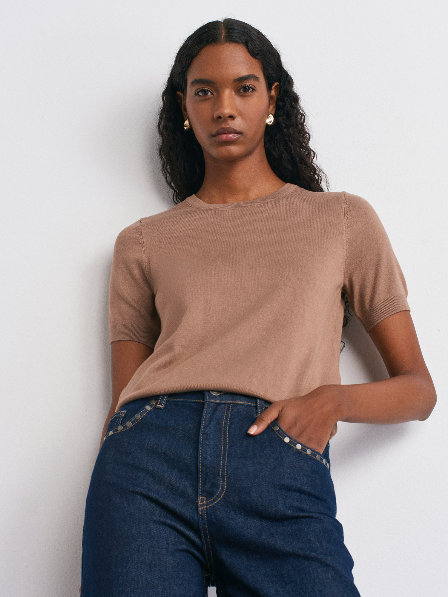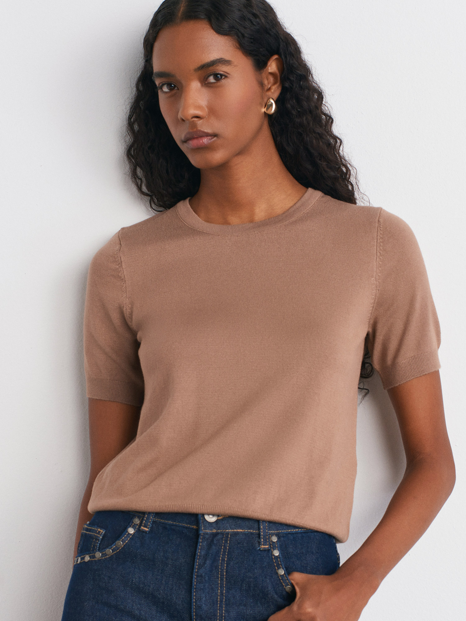 10779 Bisiklet Yaka Kısa Kollu Triko Bluz-Koyu Vizon