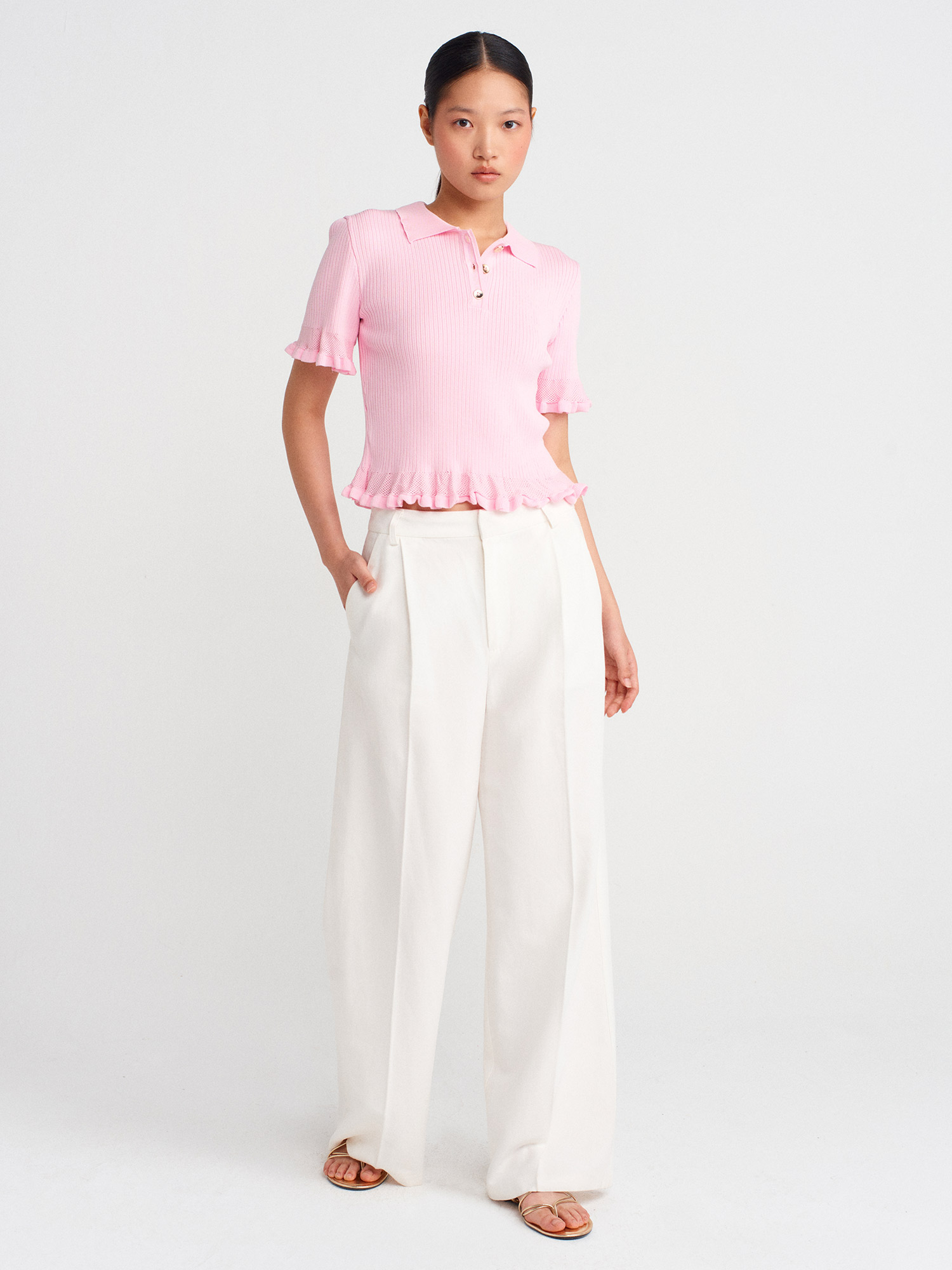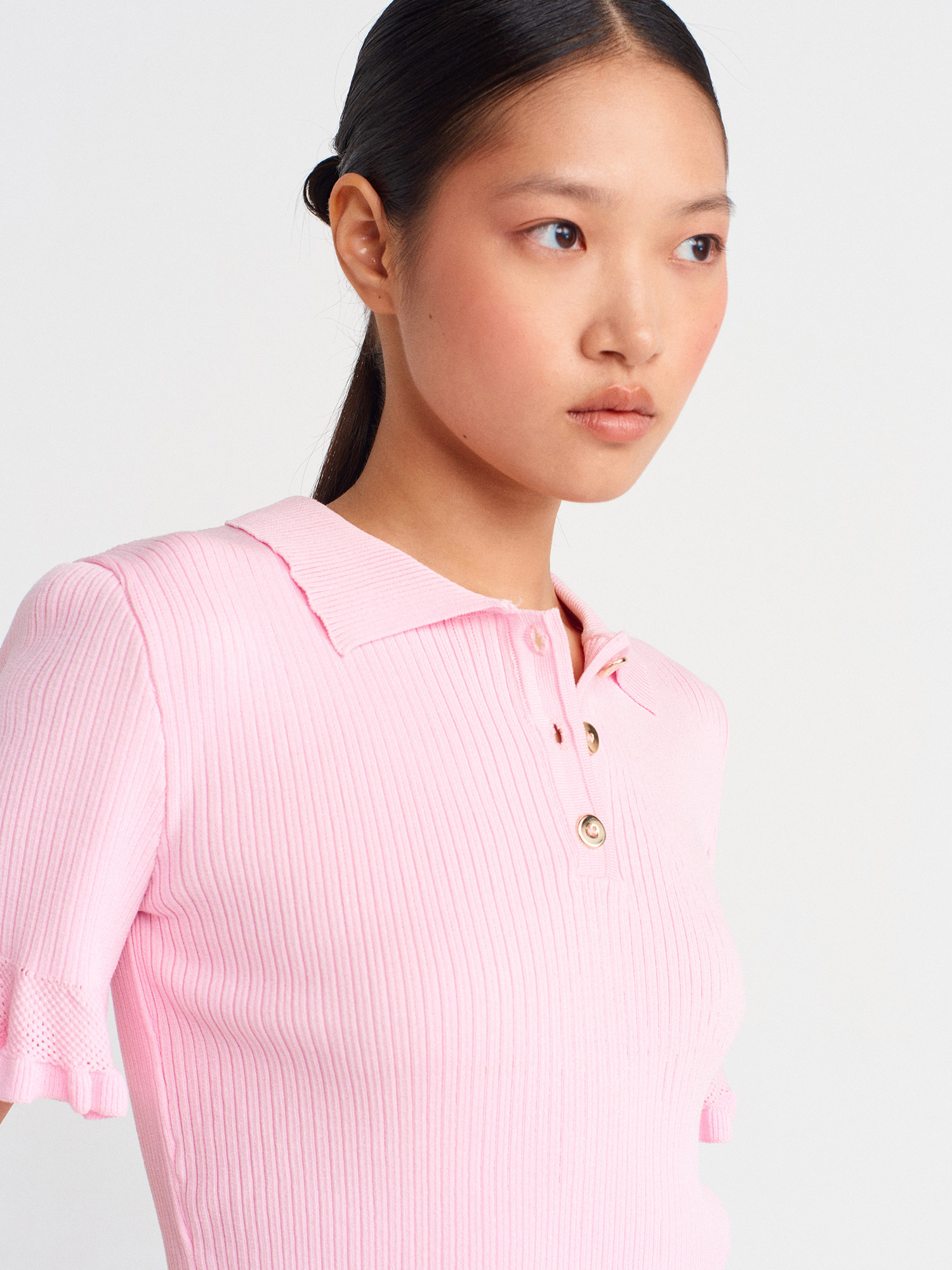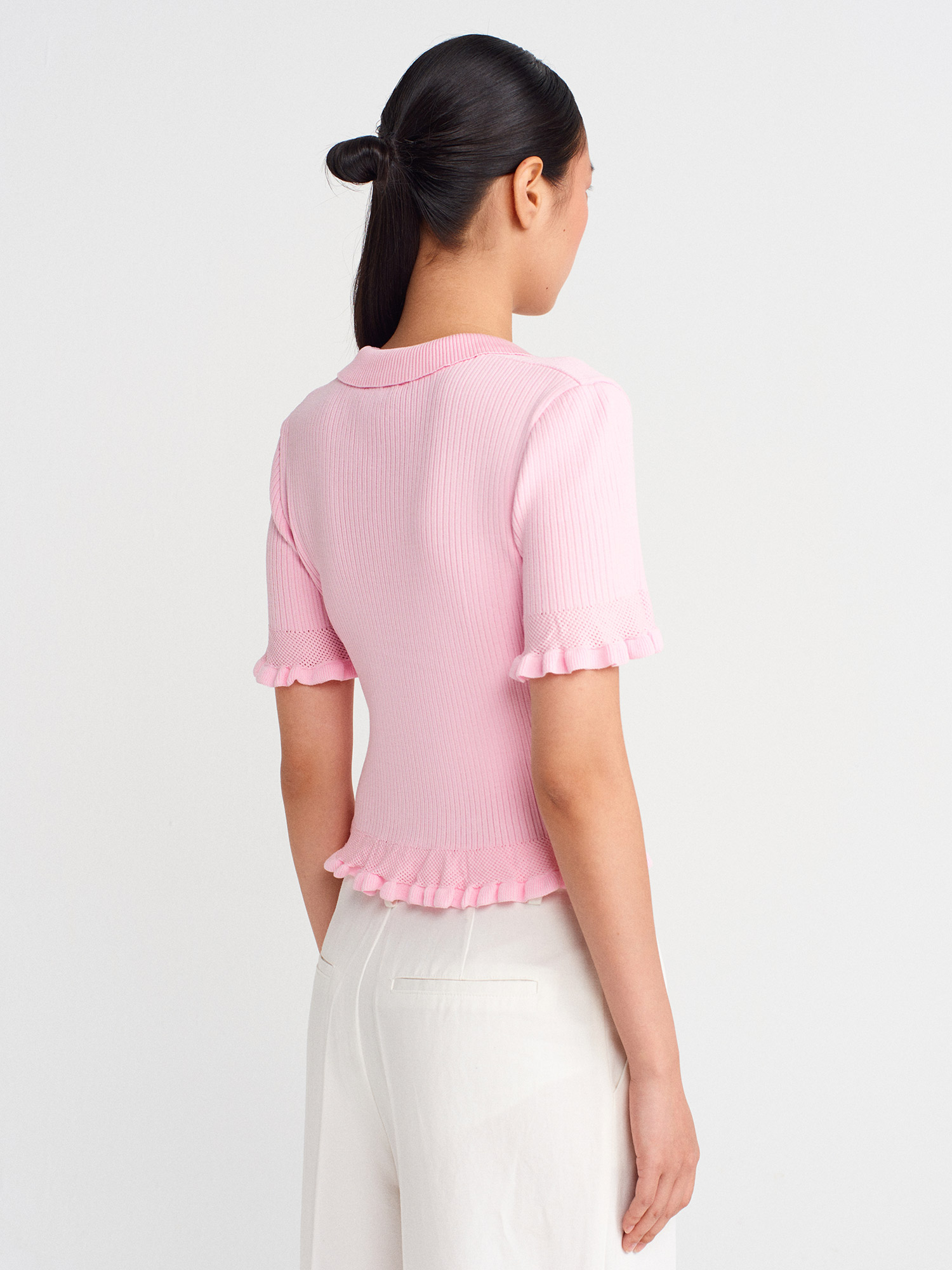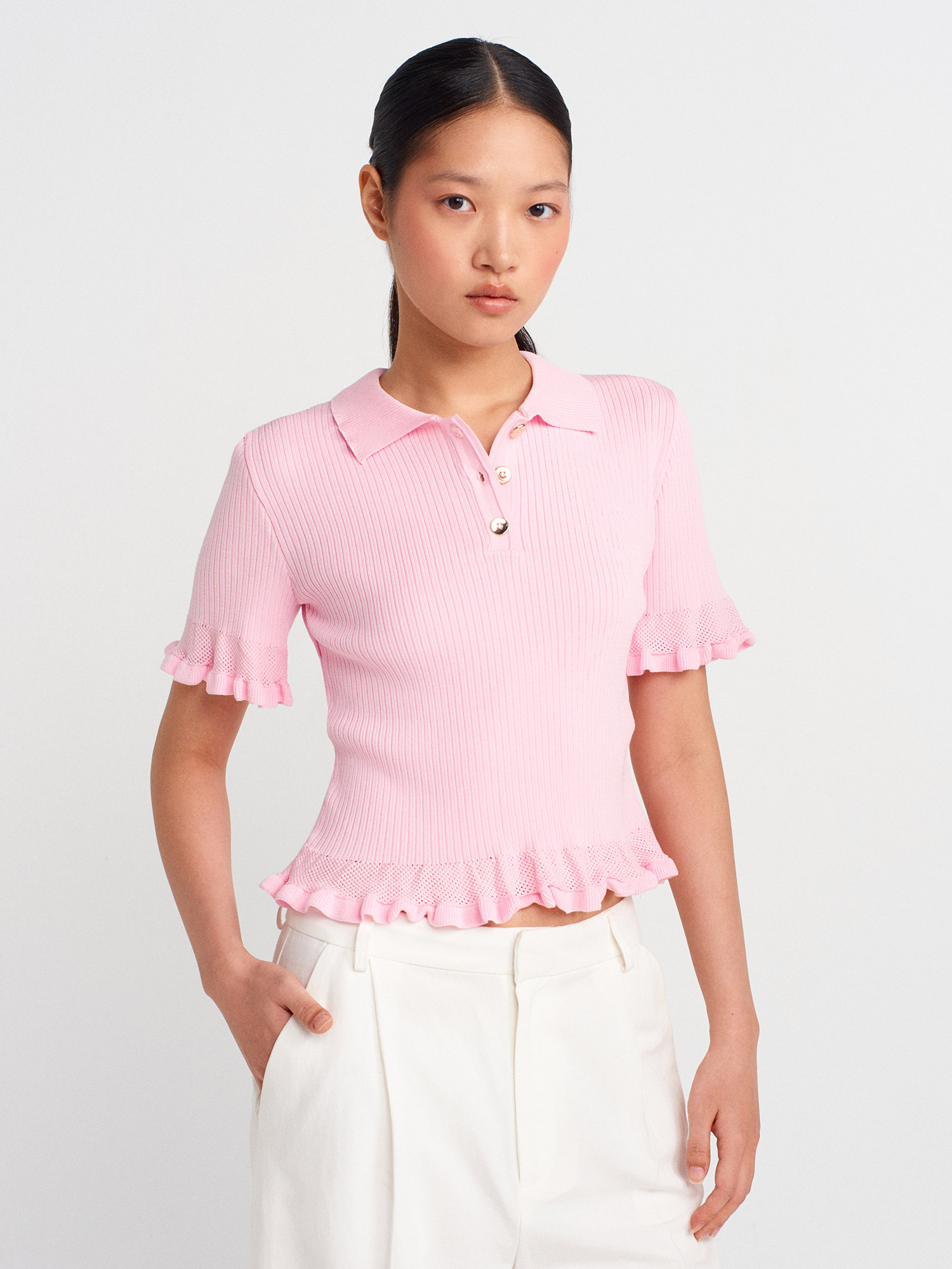 10780 Polo Yaka Düğmeli Fırfırlı Triko Bluz-Pembe