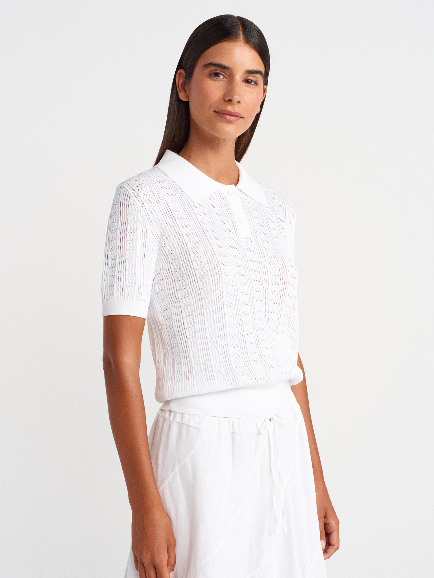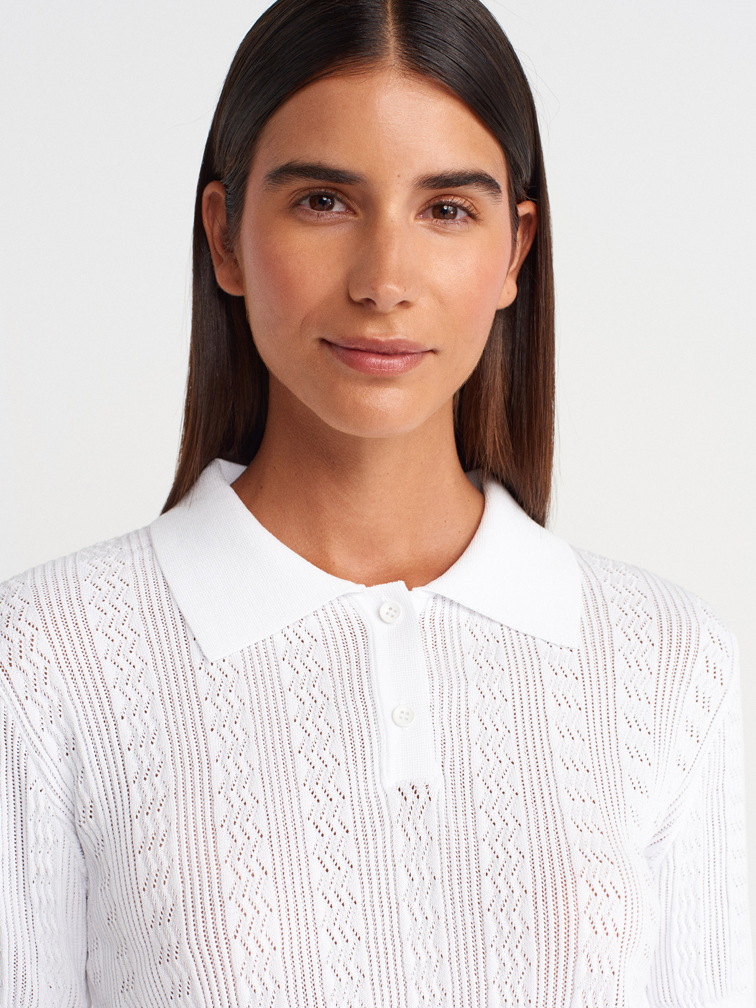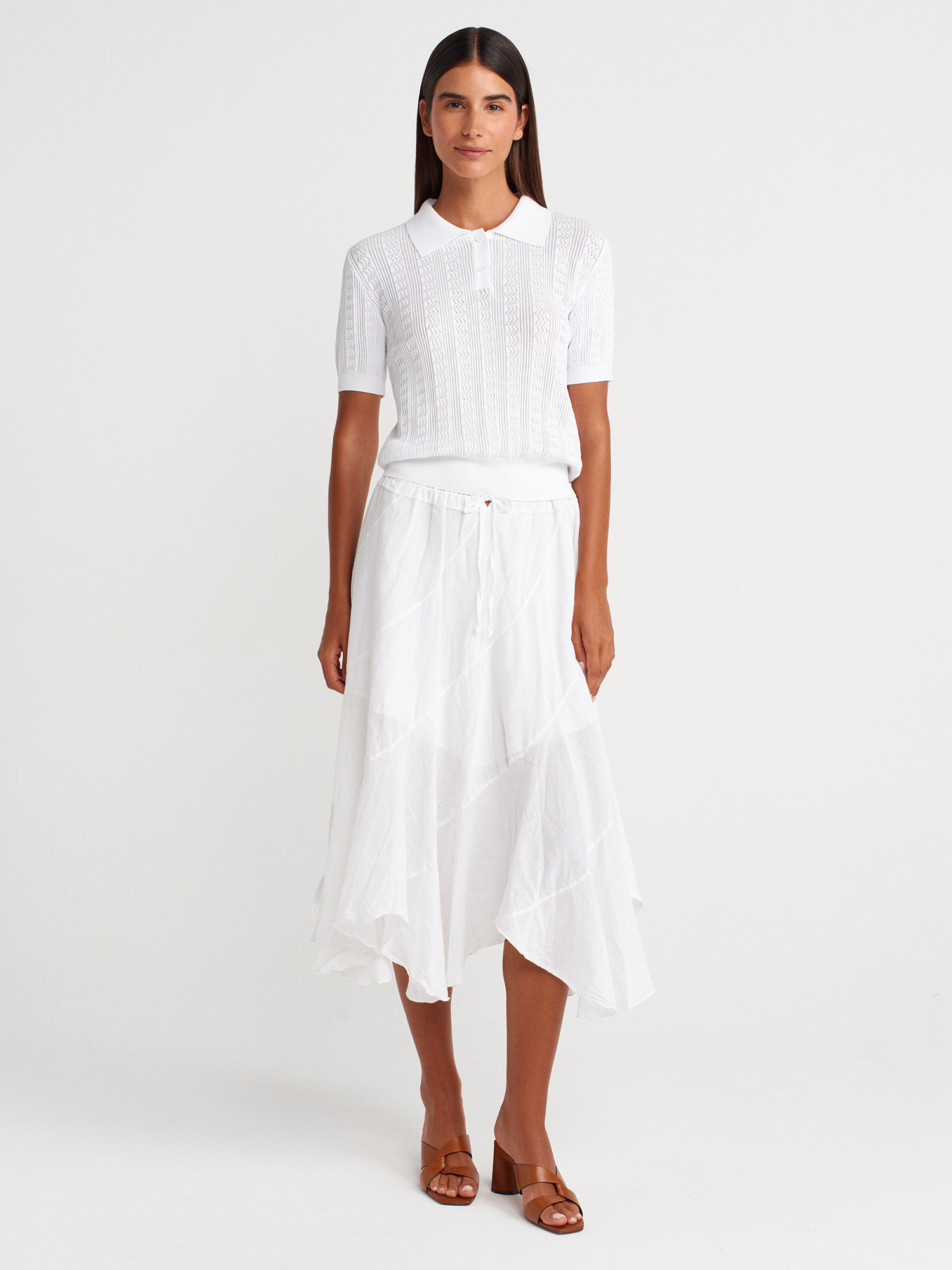 10781 Polo Yaka Düğmeli Ajurlu Triko Bluz-Beyaz