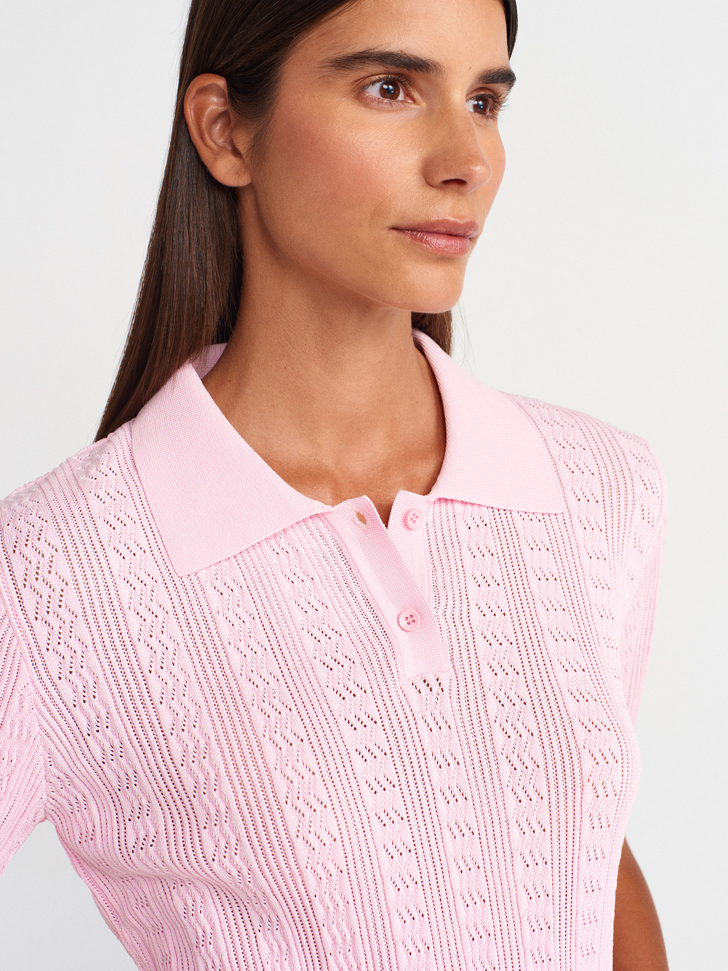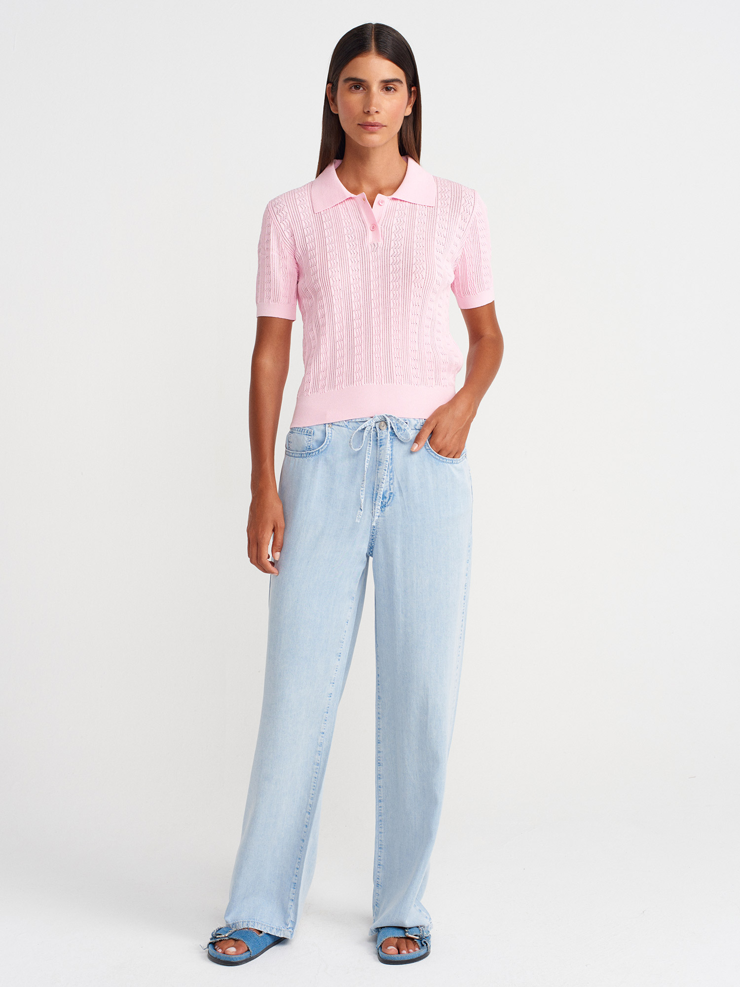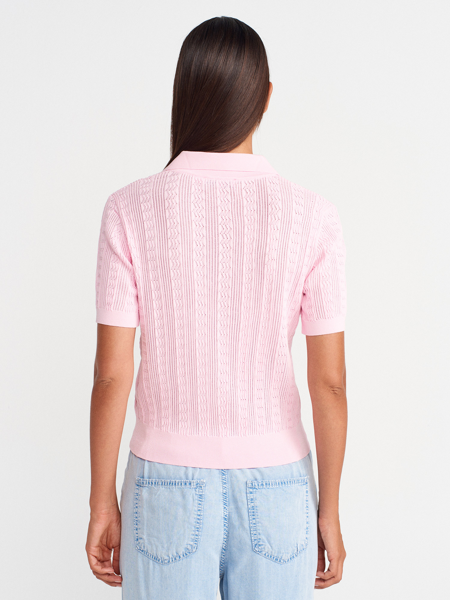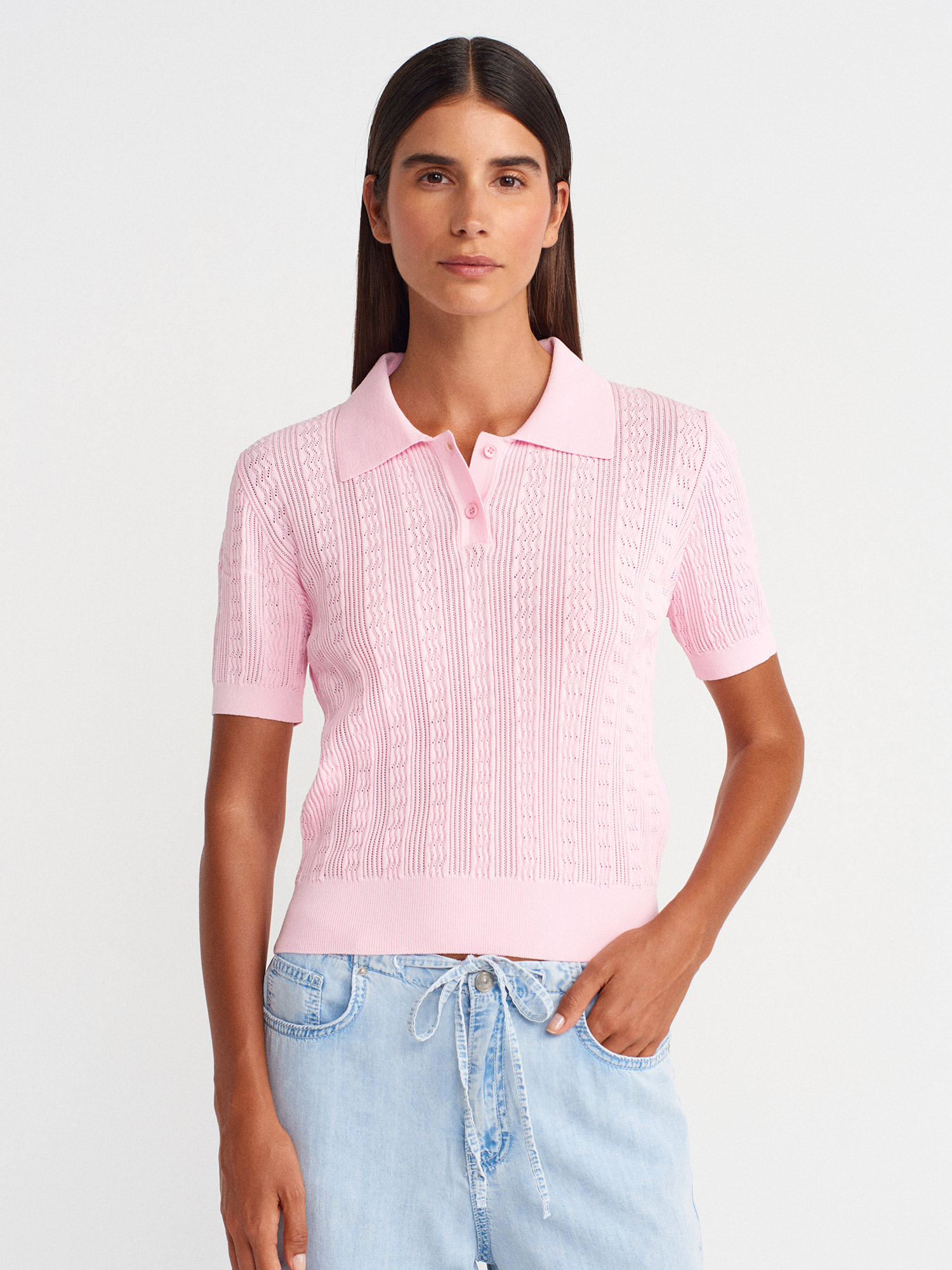 10781 Polo Yaka Düğmeli Ajurlu Triko Bluz-Pembe