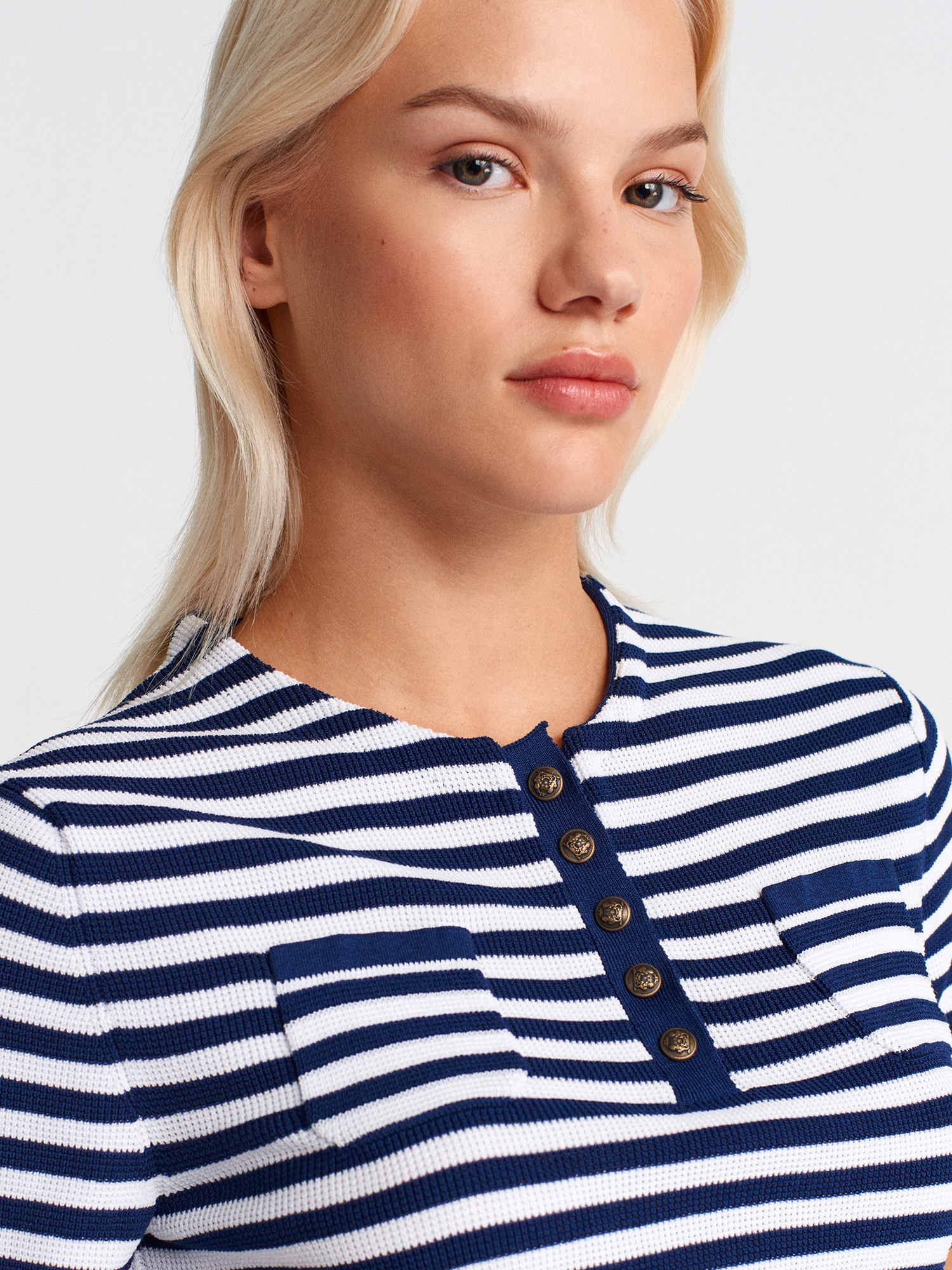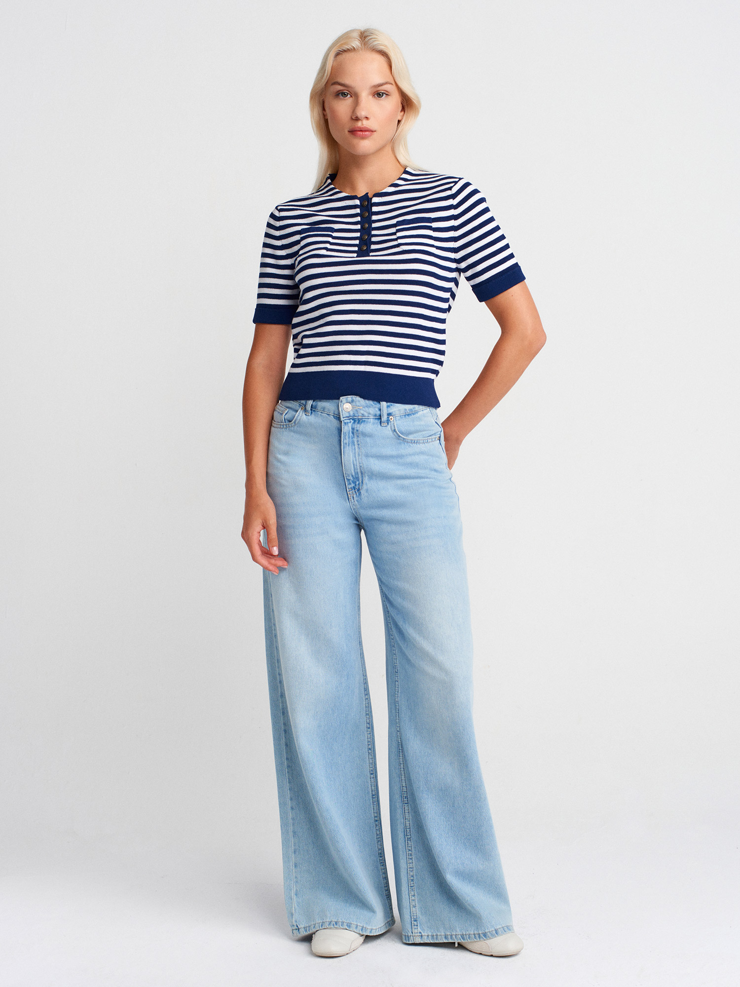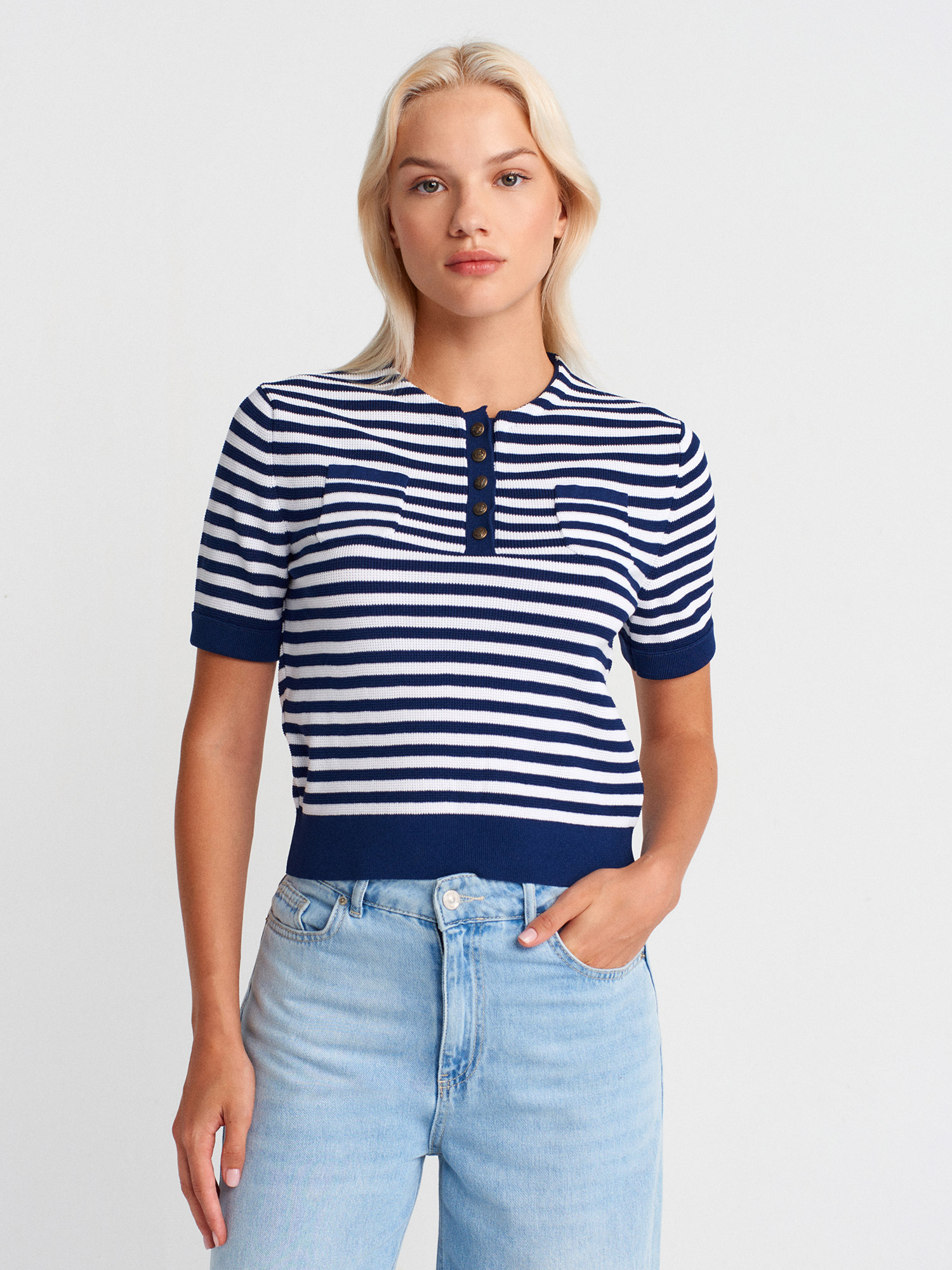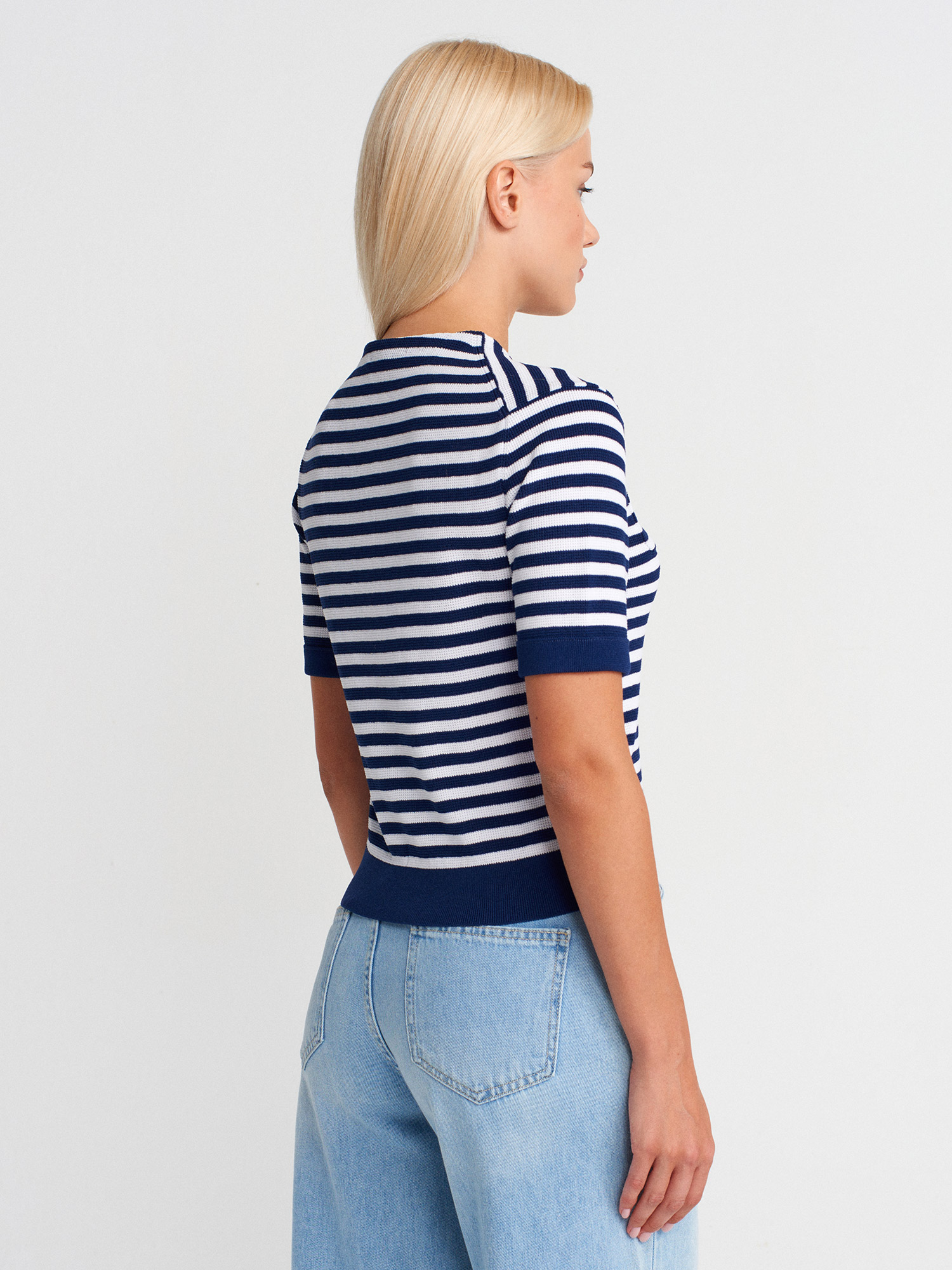 10782 Bisiklet Yaka Çizgili Düğmeli Triko Bluz-Laci-Beyaz