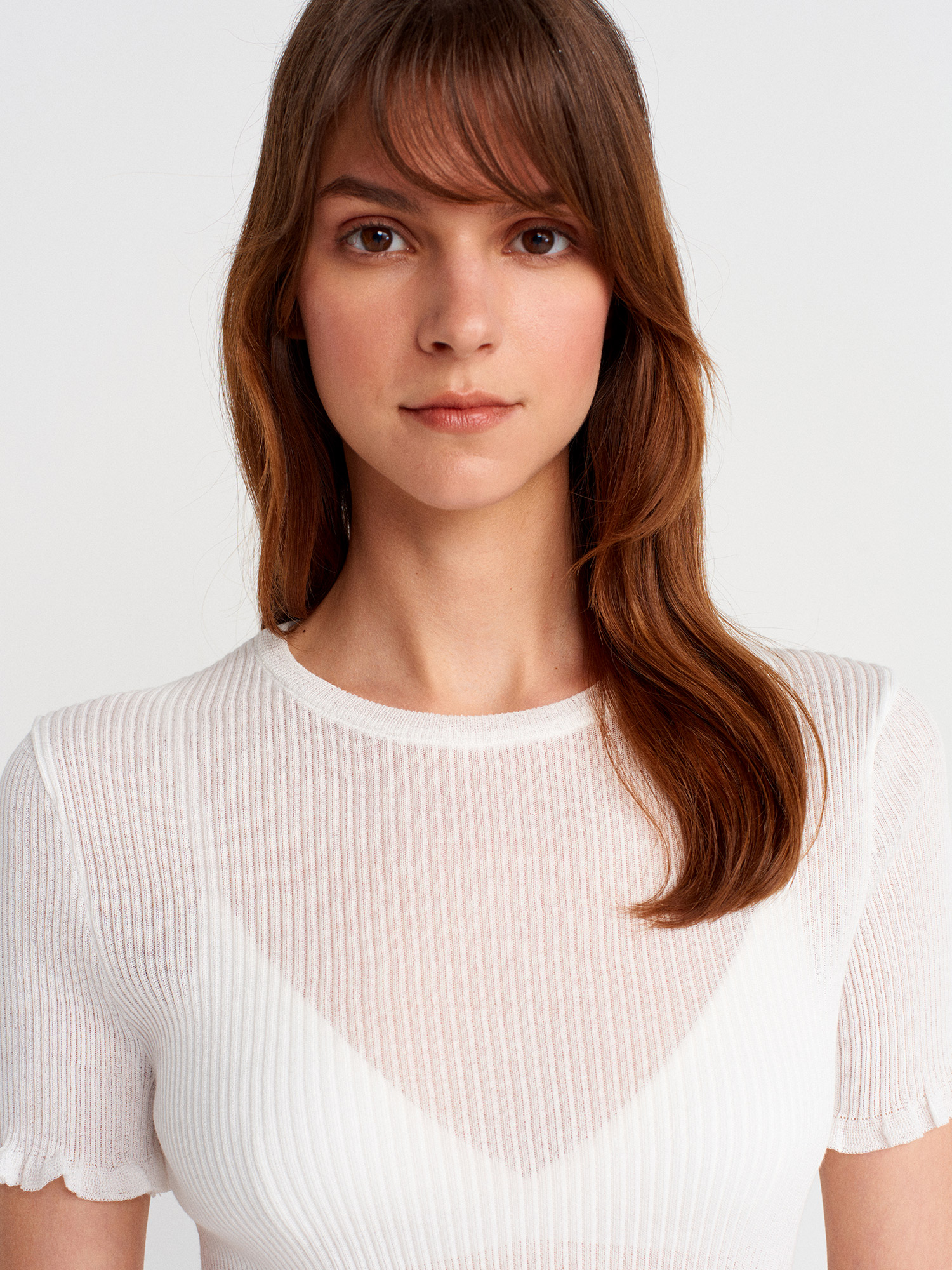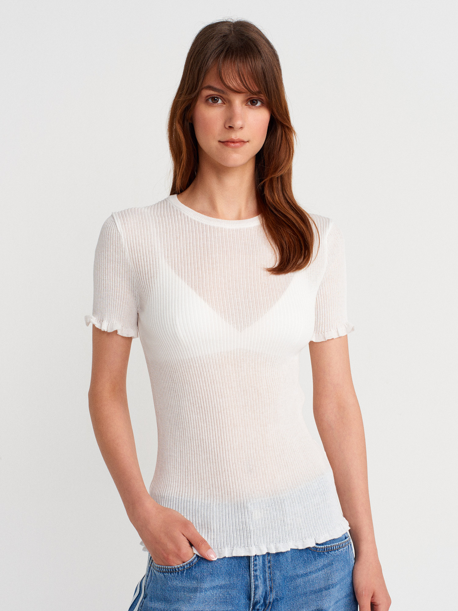 10783 Bisiklet Yaka Fırfırlı İnce Triko Bluz-Ekru