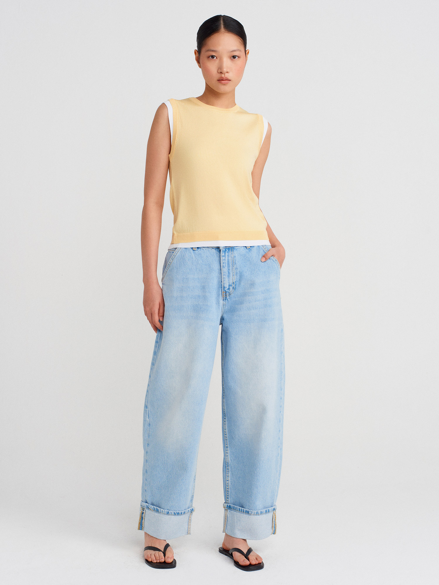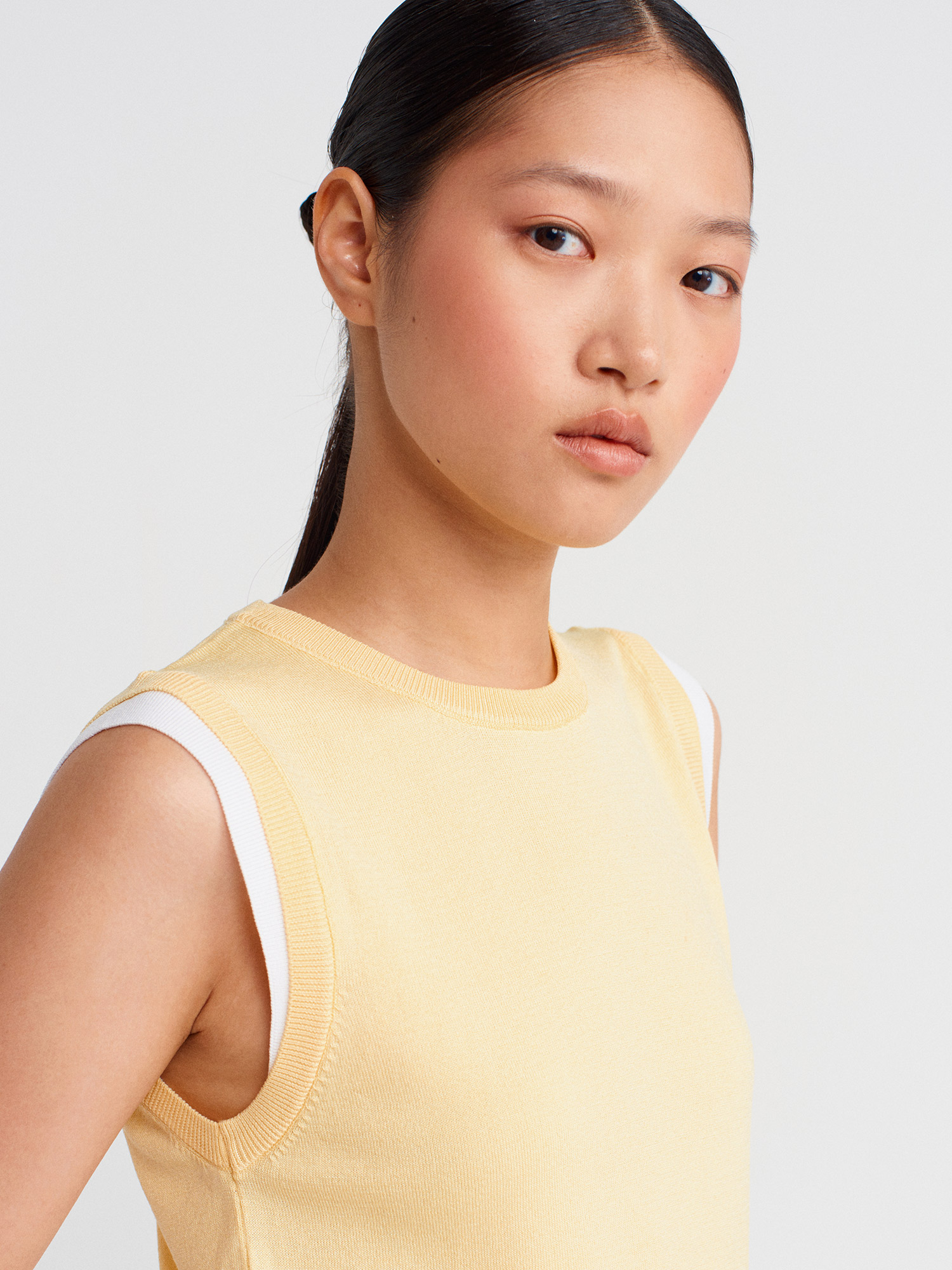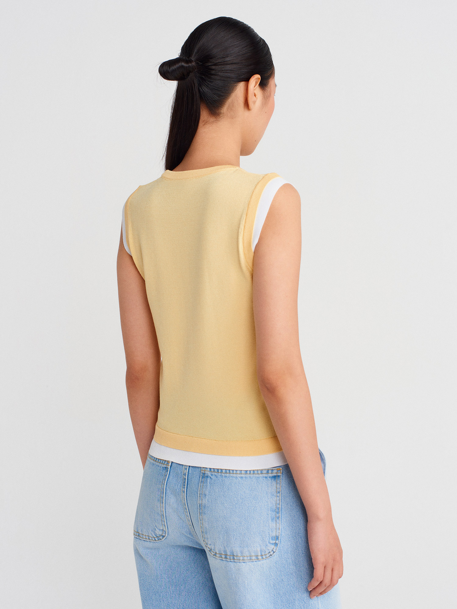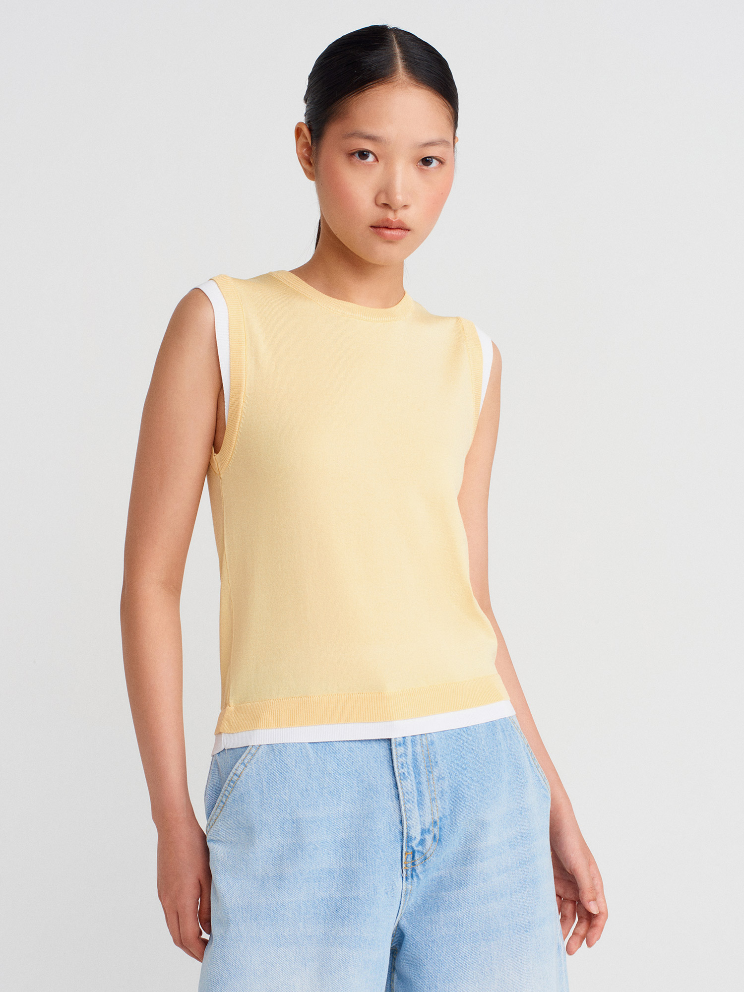 10784 Bisiklet Yaka Çift Görünümlü Triko Bluz-Sarı-Beyaz