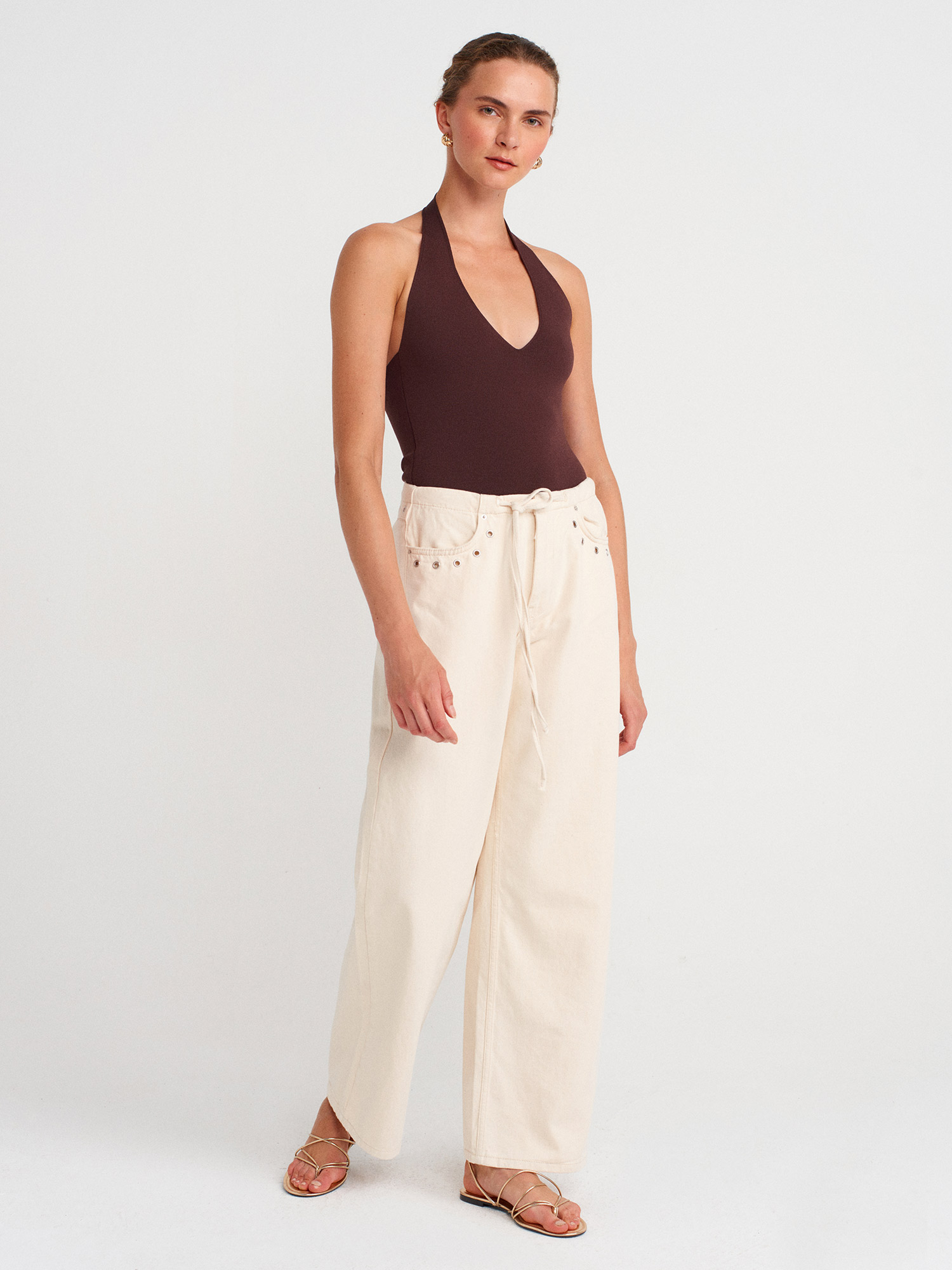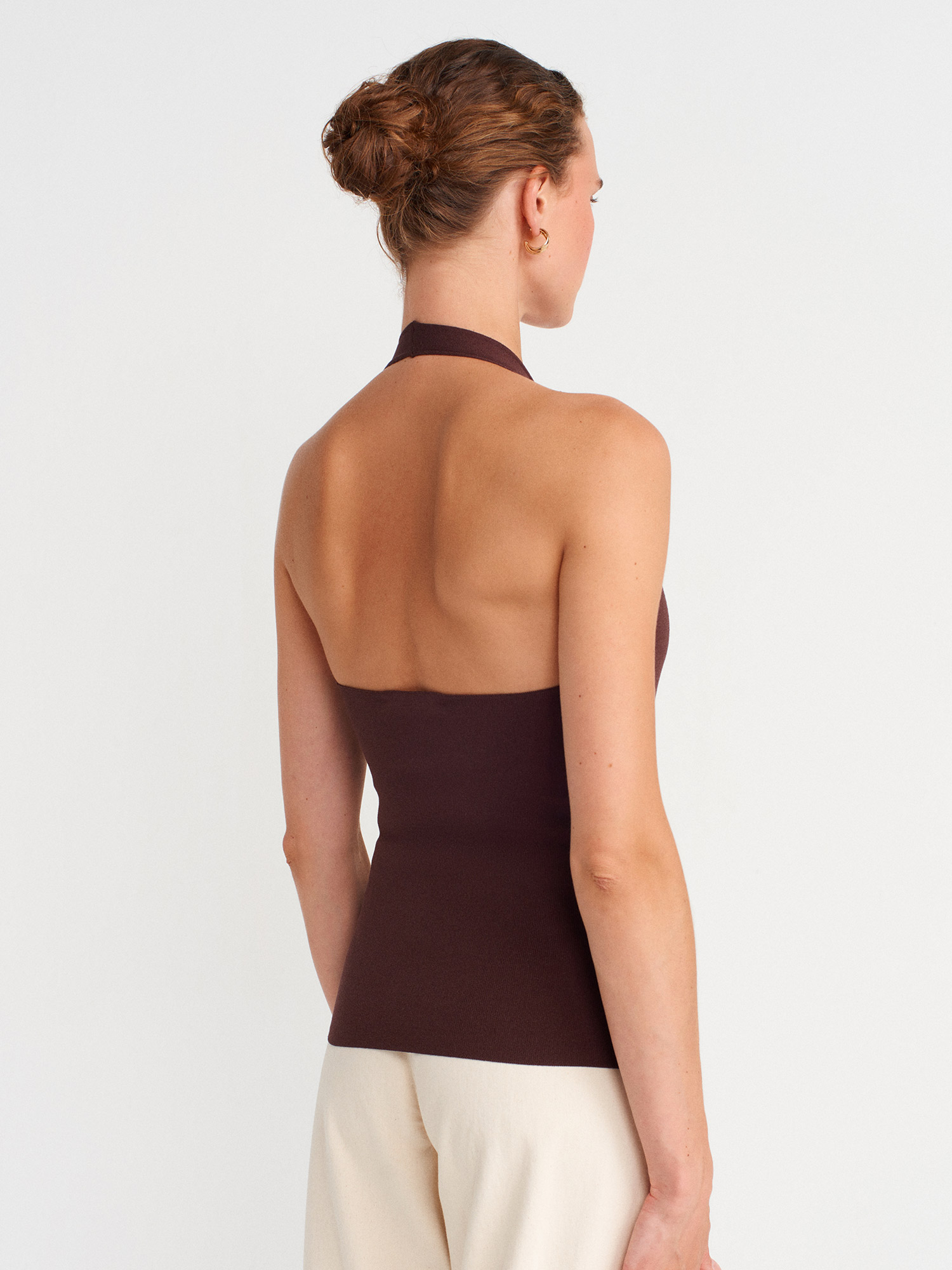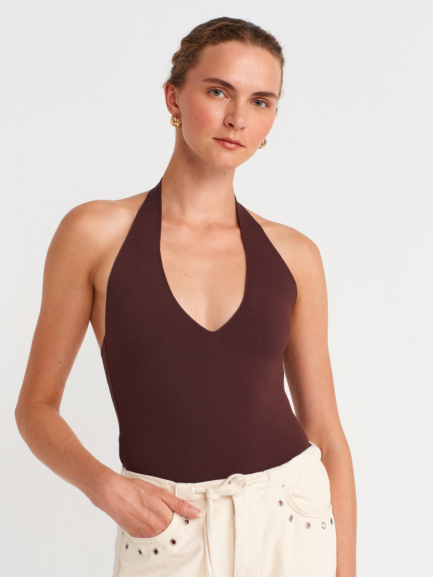10794 Halter V Yaka Basıc Bluz-Kahve