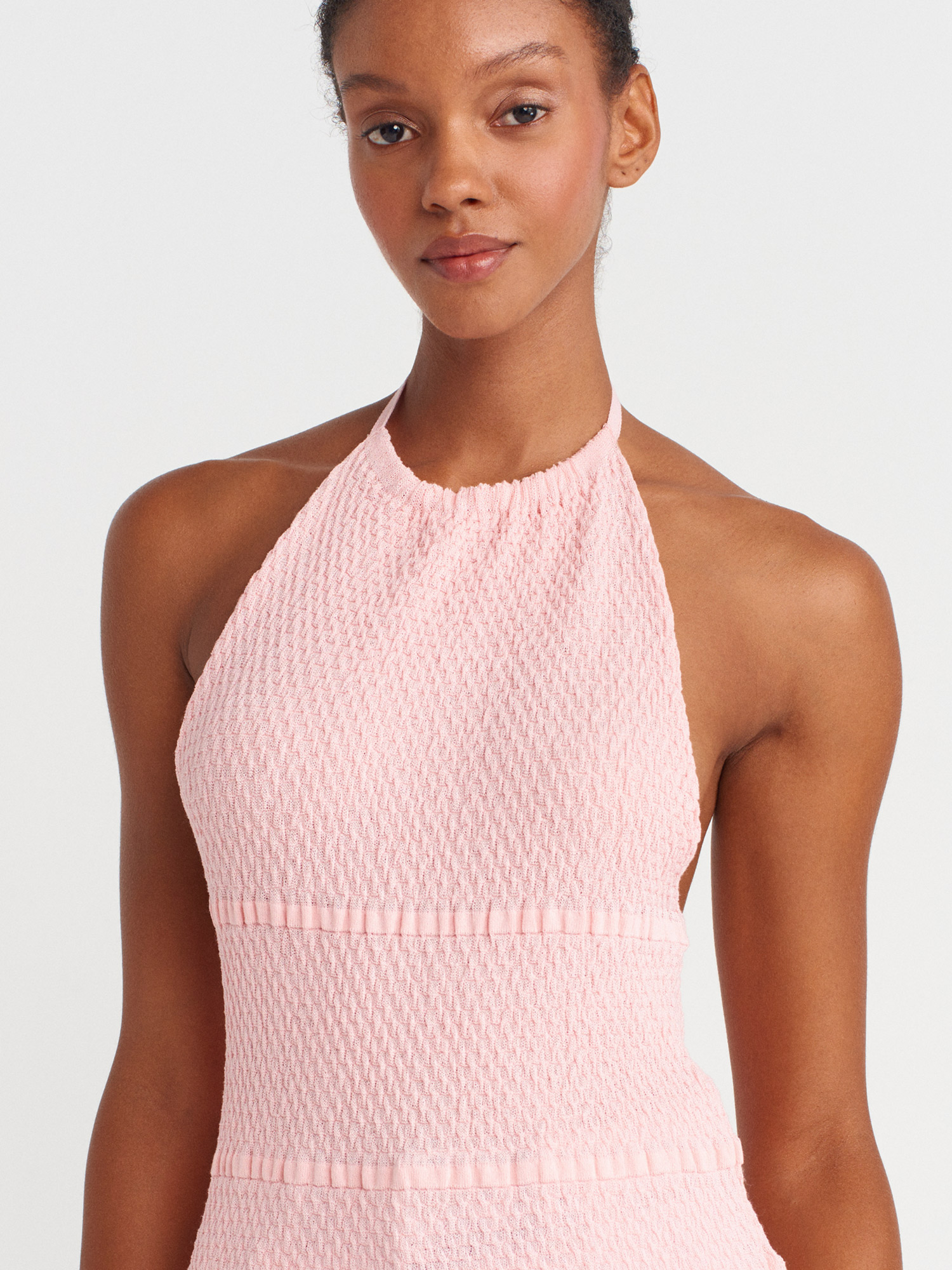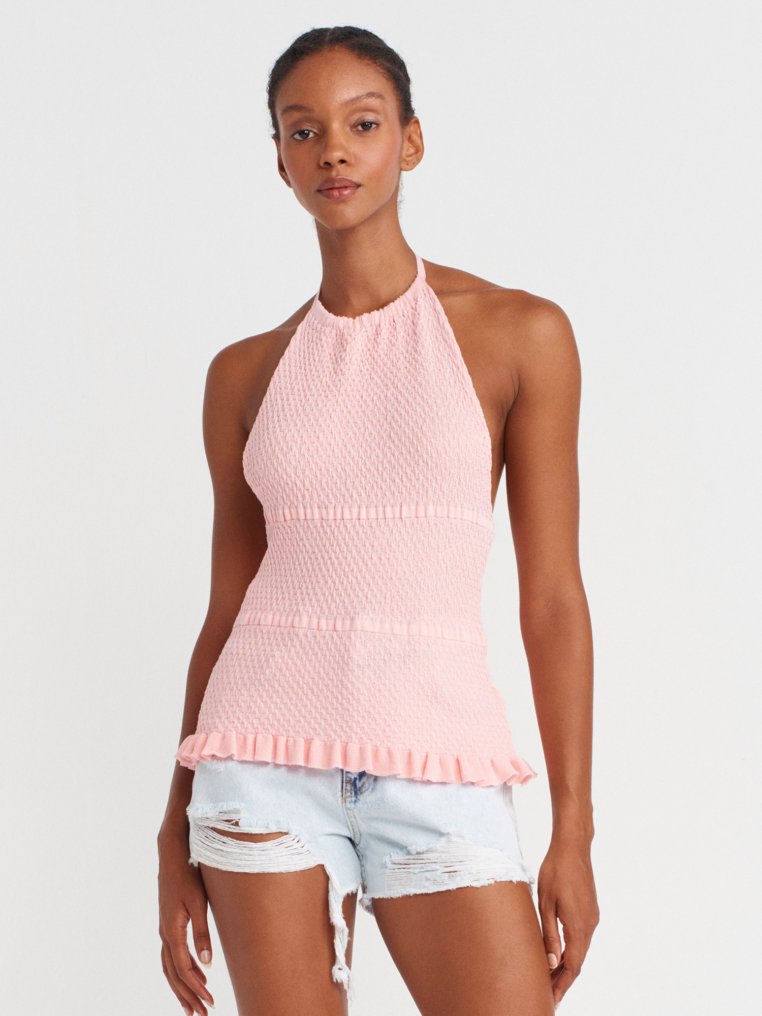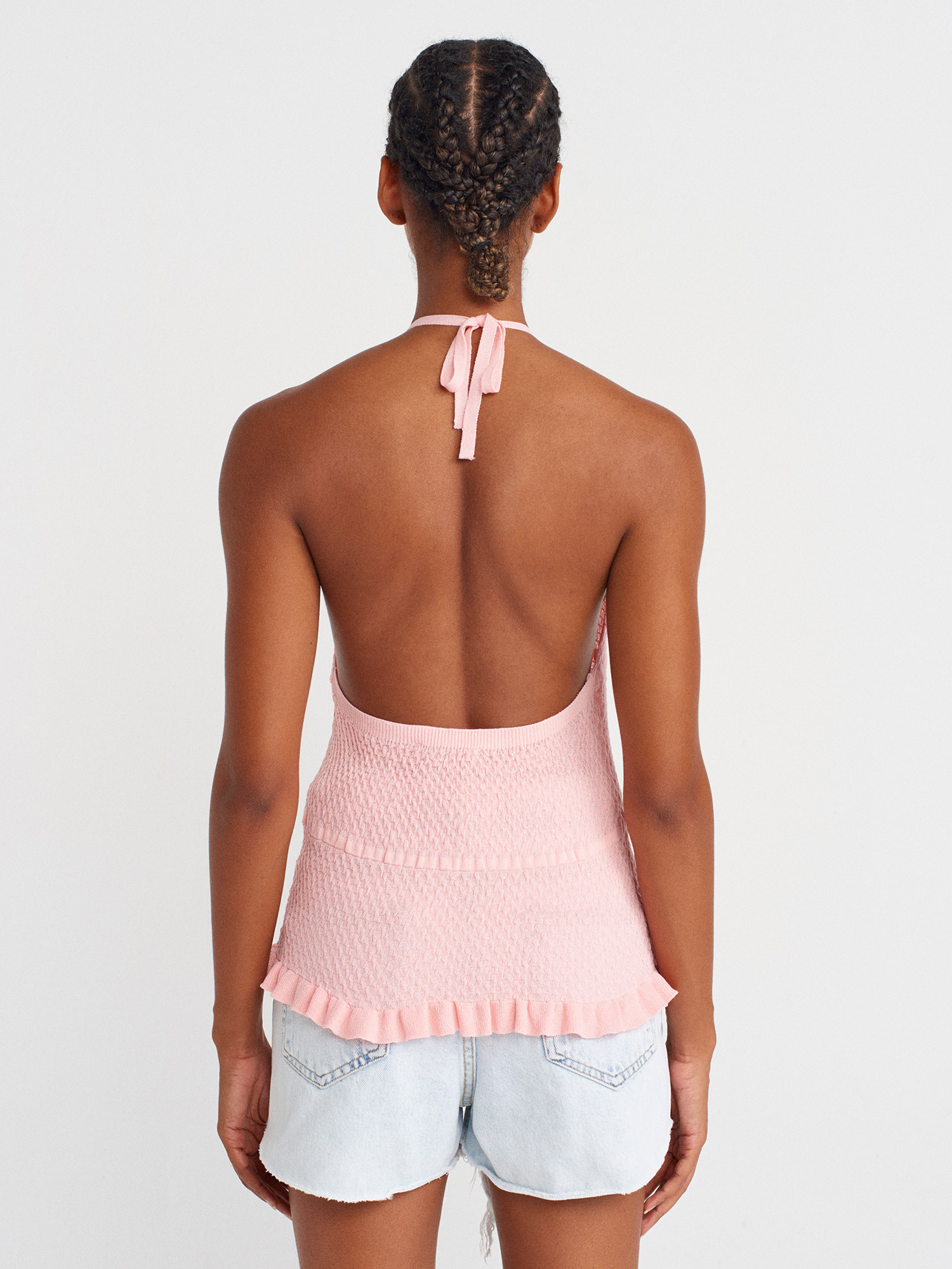 10796 Halter Bağlamalı Yaka Fırfır Dokulu Triko Bluz-Açık Pembe