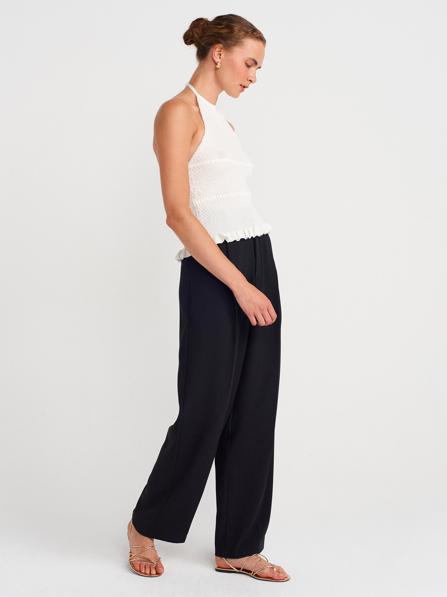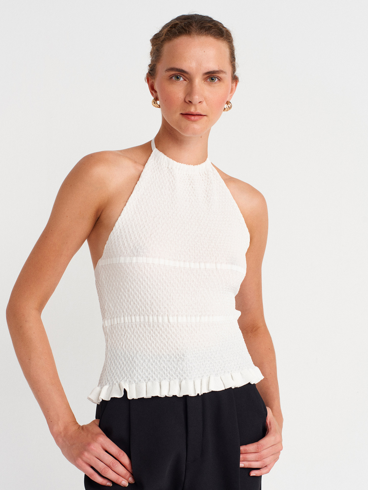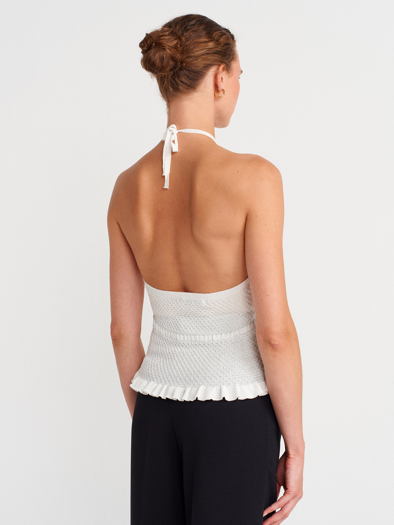 10796 Halter Bağlamalı Yaka Fırfır Dokulu Triko Bluz-Ekru