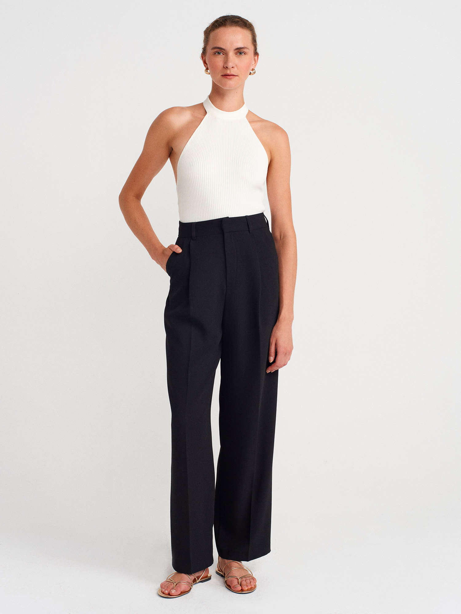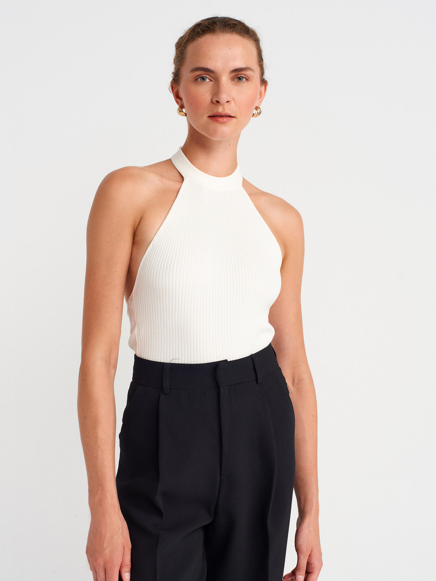 10798 Halter Bağlamalı Yaka Fitilli Triko Bluz-Ekru