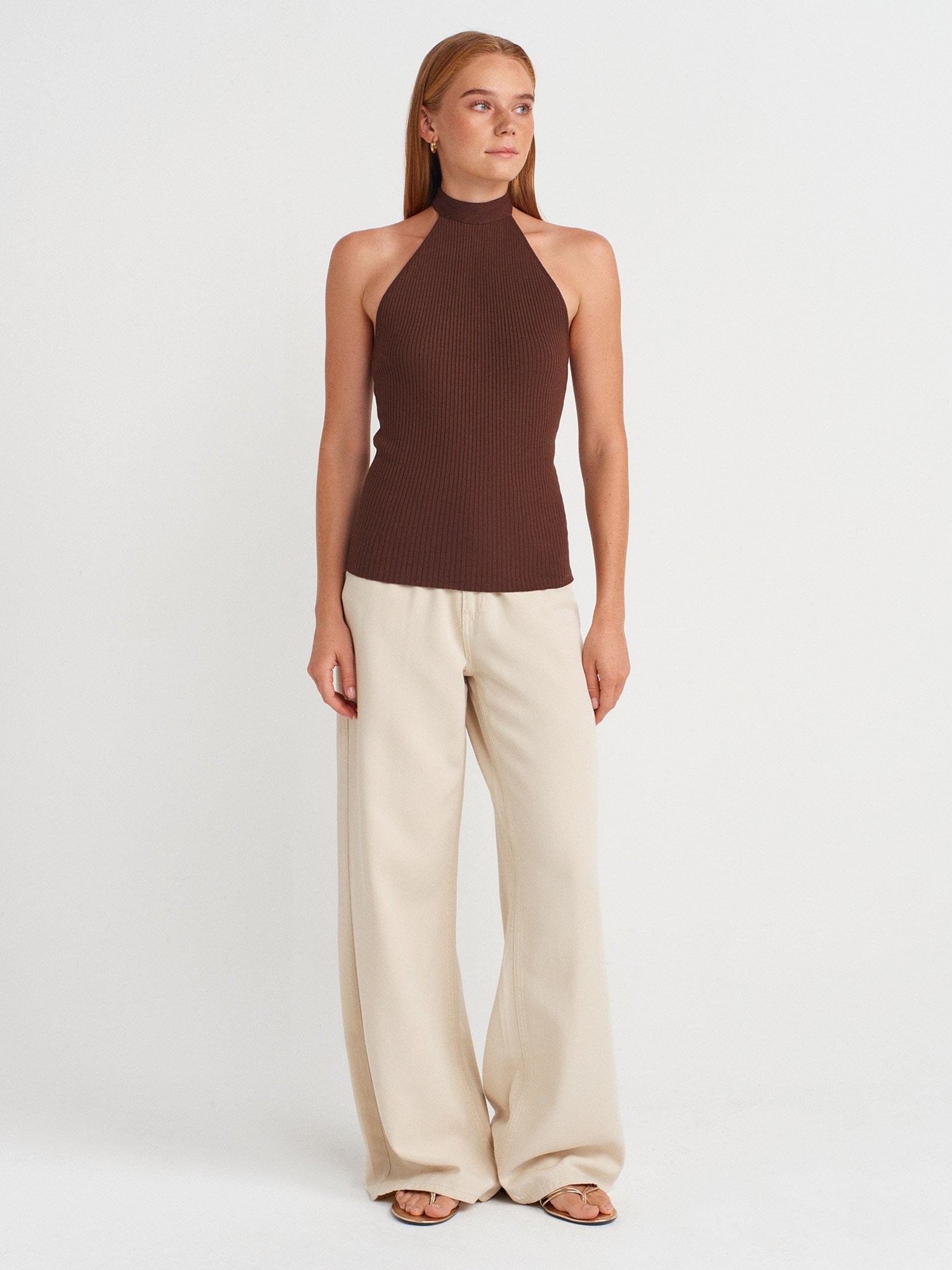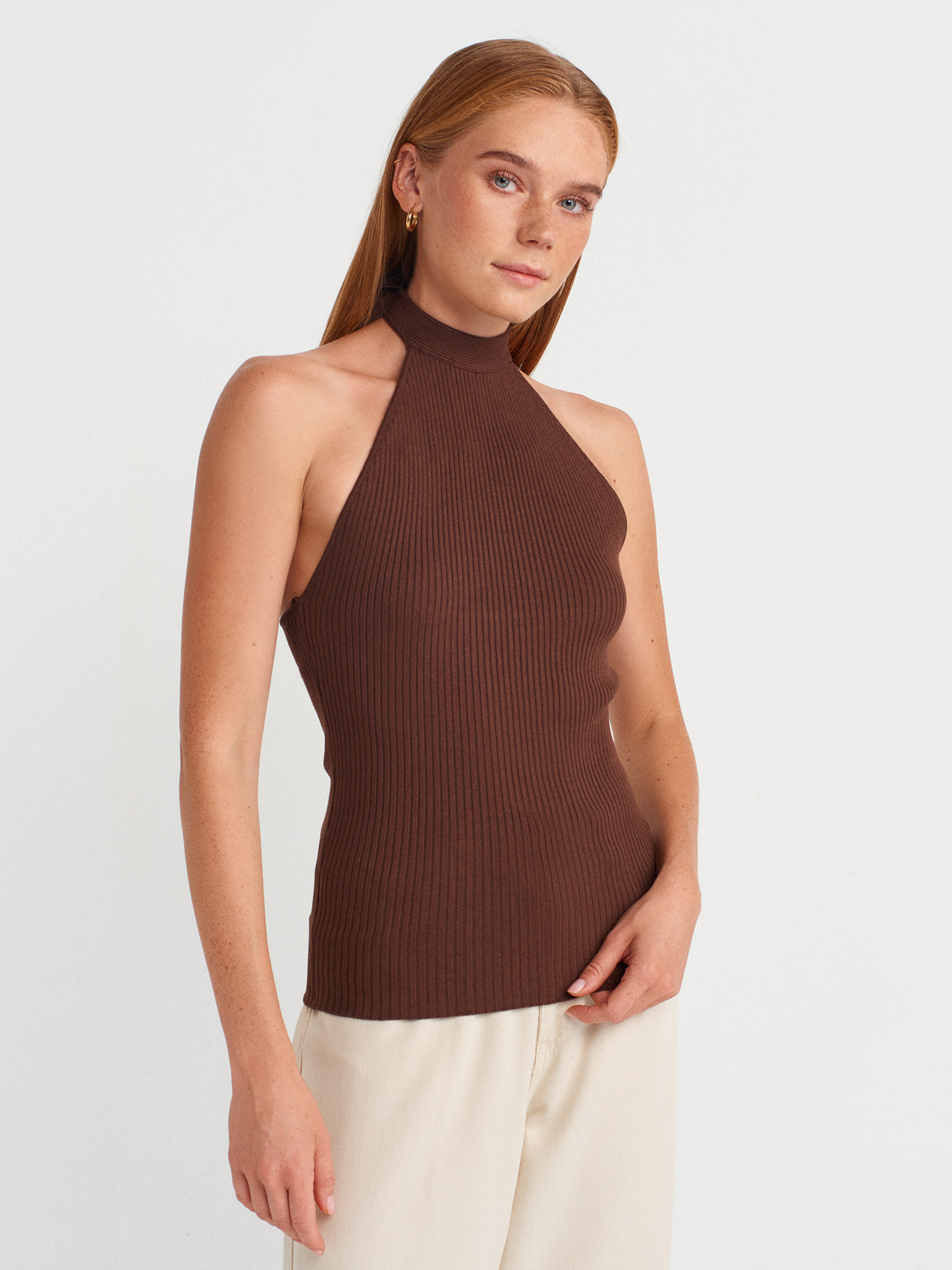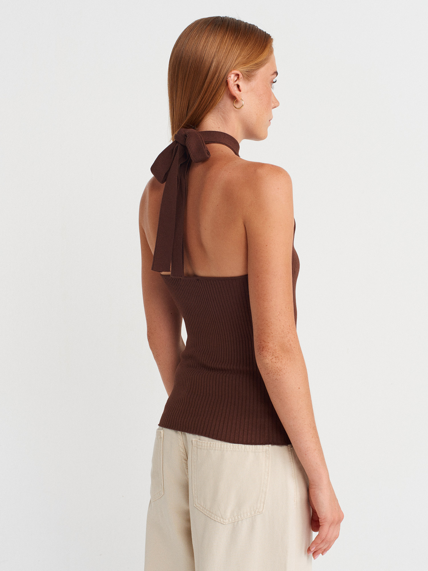 10798 Halter Bağlamalı Yaka Fitilli Triko Bluz-Kahve