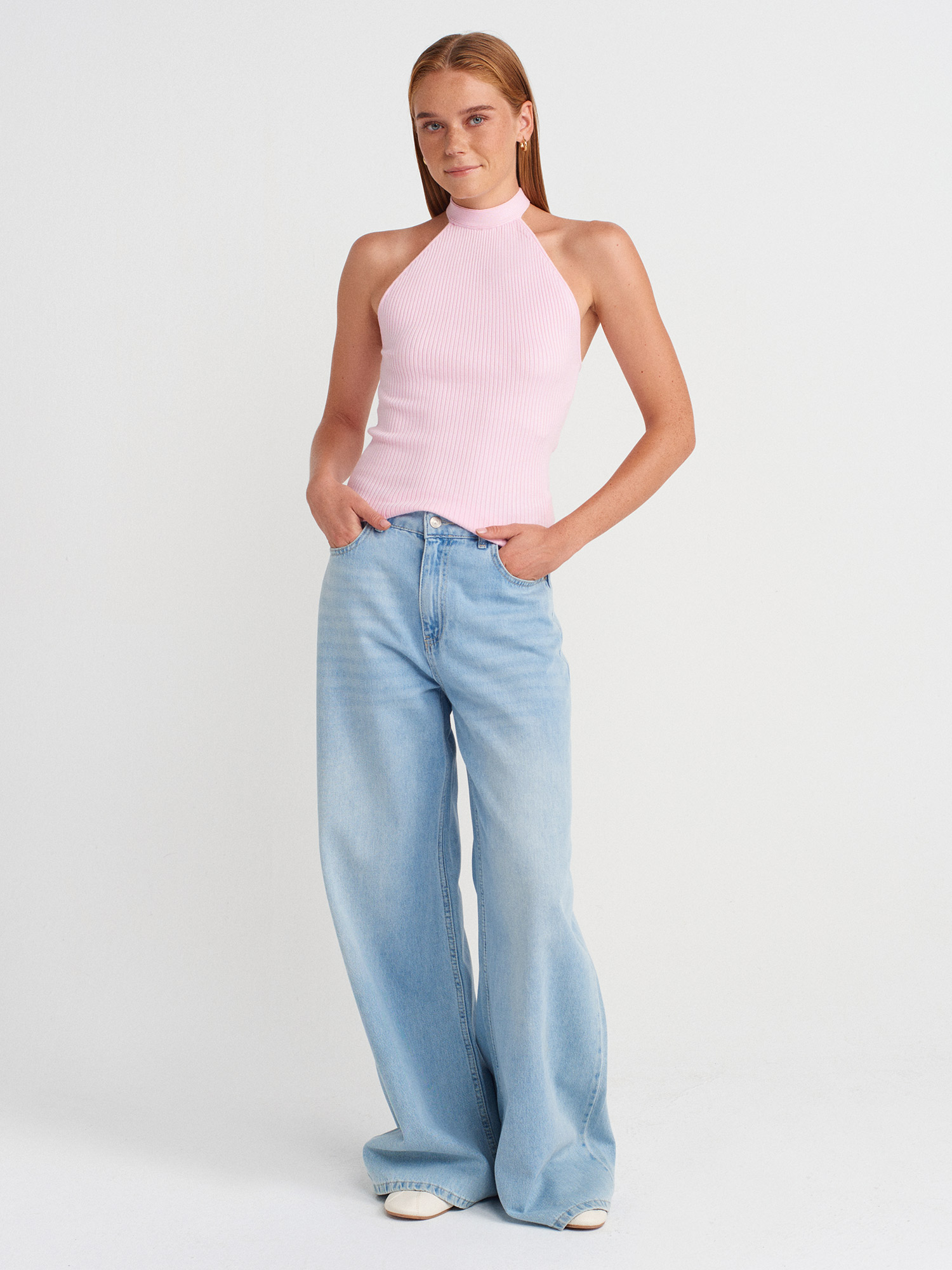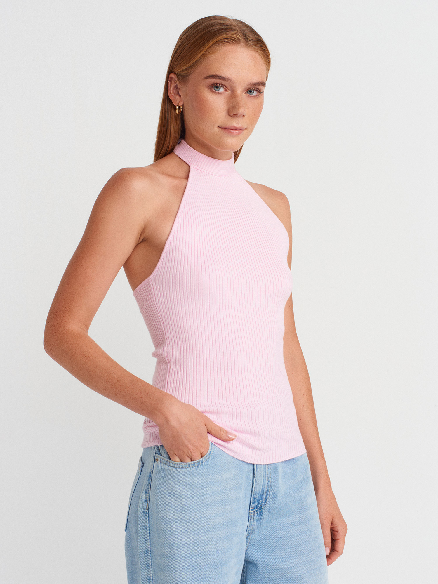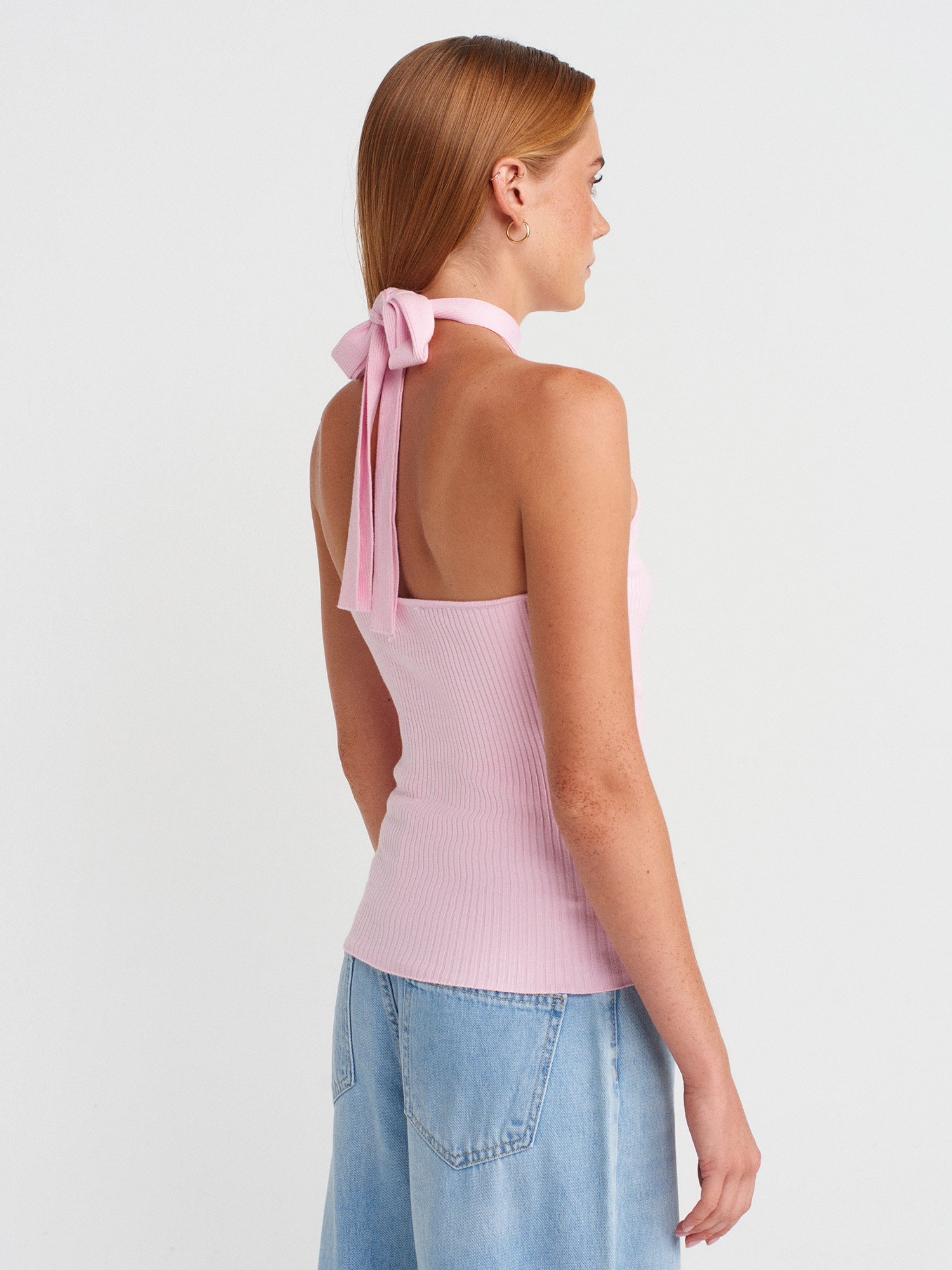 10798 Halter Bağlamalı Yaka Fitilli Triko Bluz-Pembe
