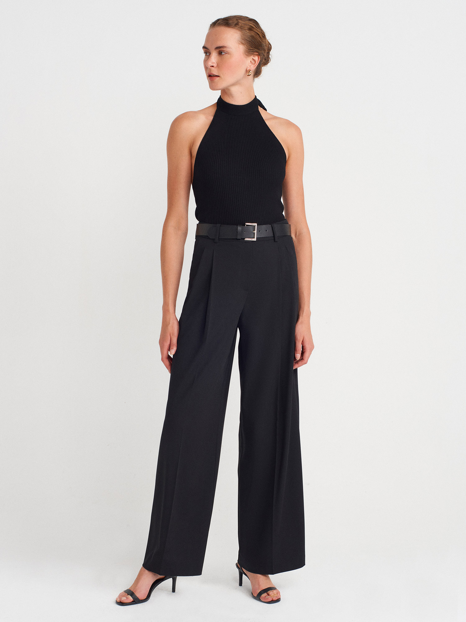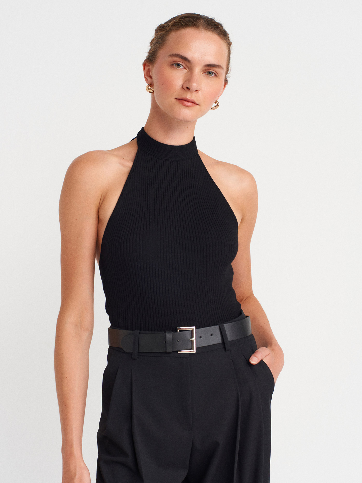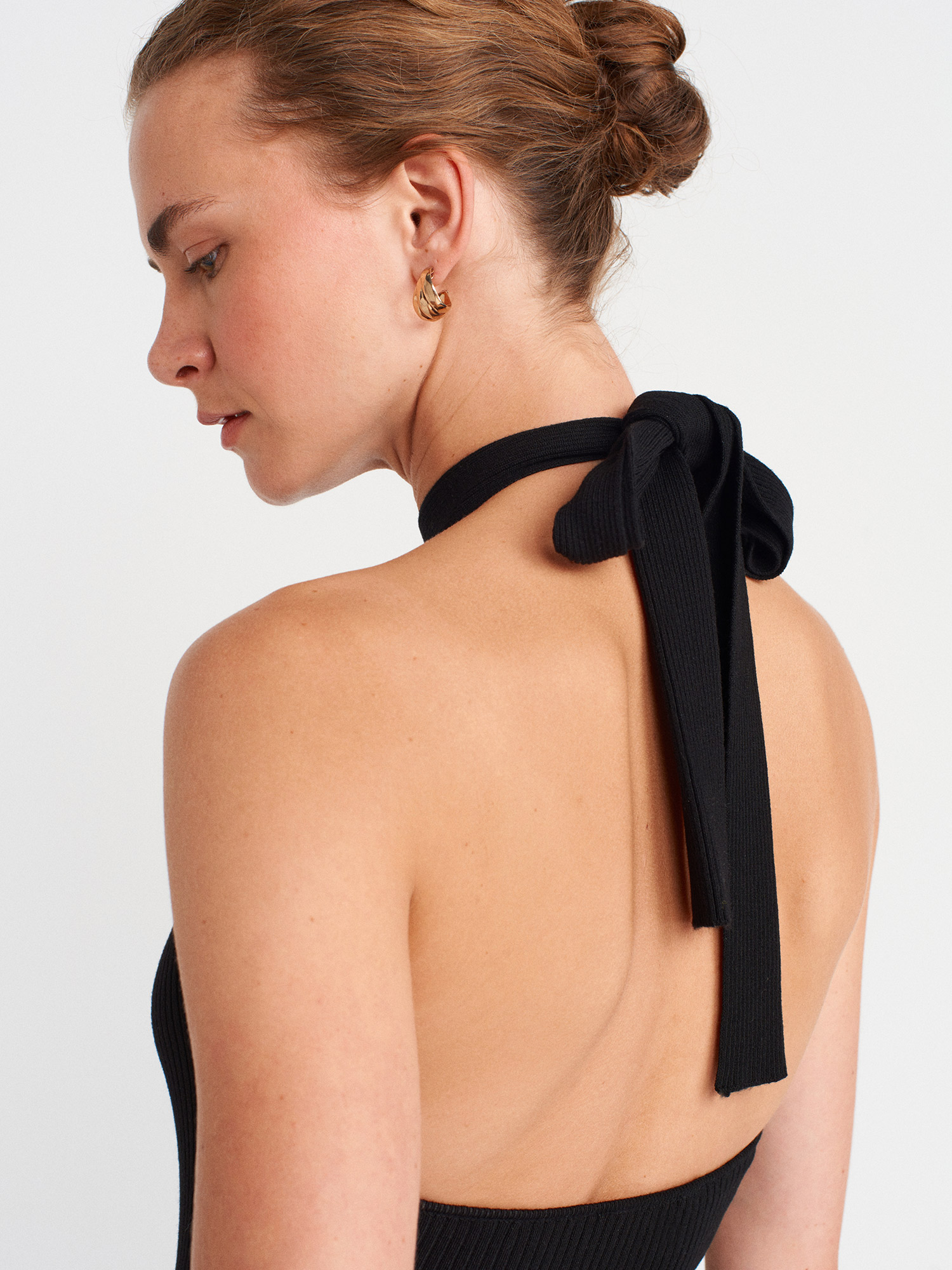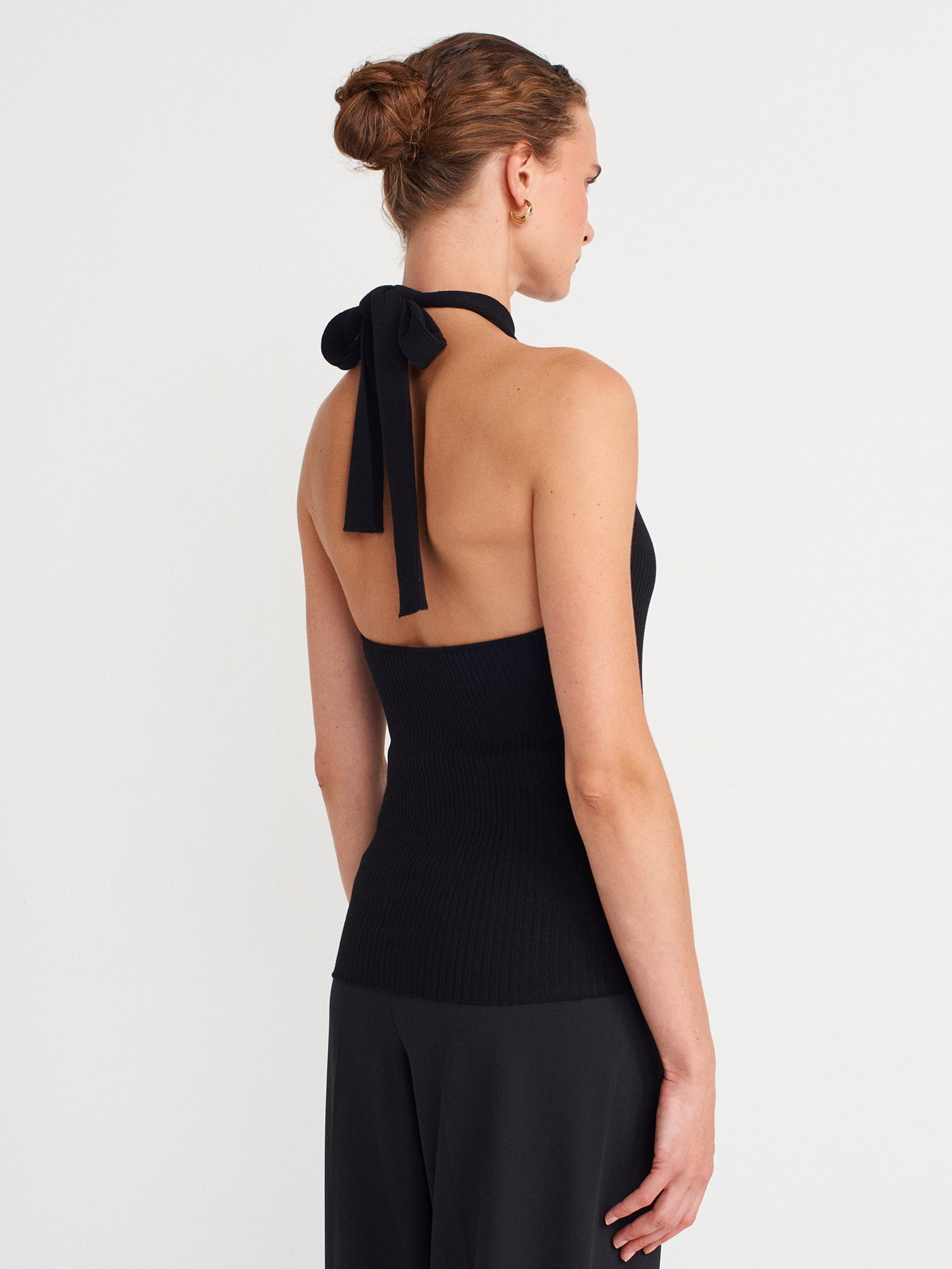 10798 Halter Bağlamalı Yaka Fitilli Triko Bluz-Siyah