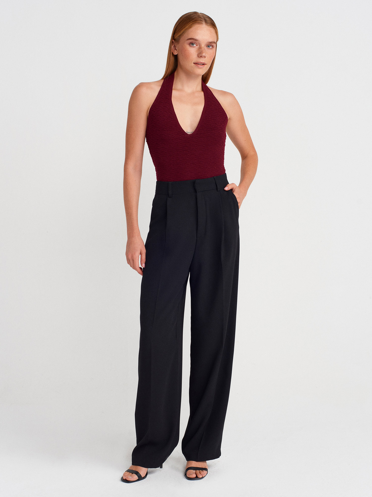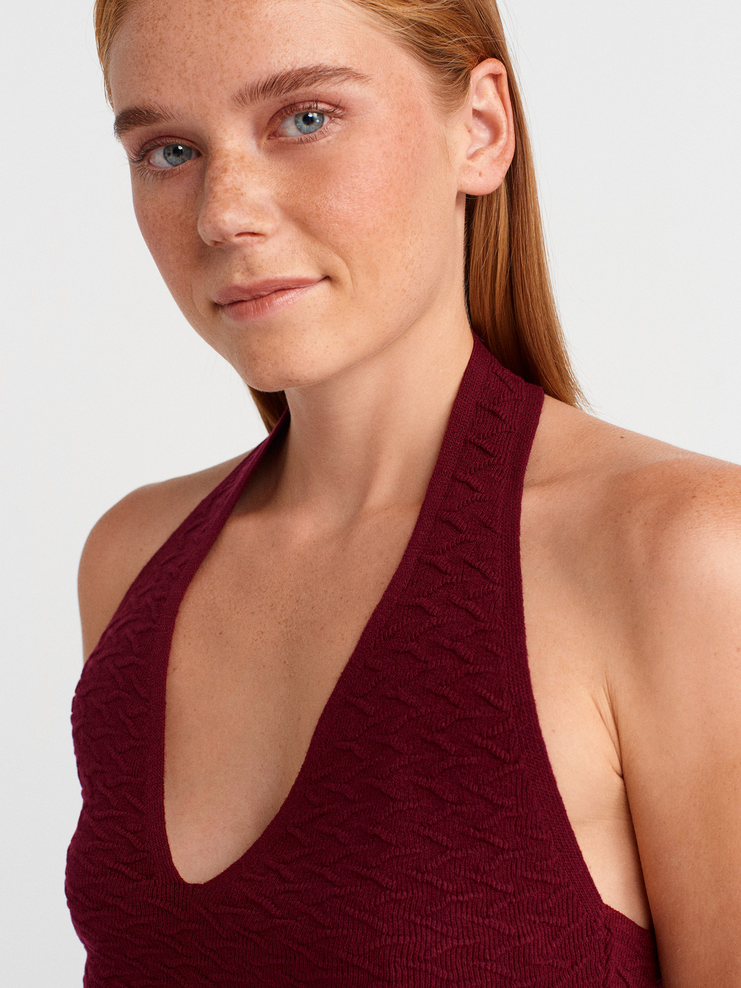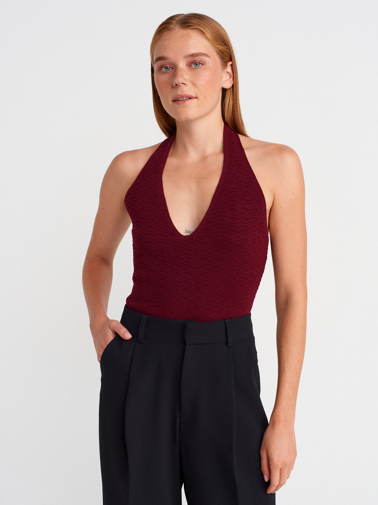 10799 Halter V Yaka Dokulu Triko Bluz-Bordo