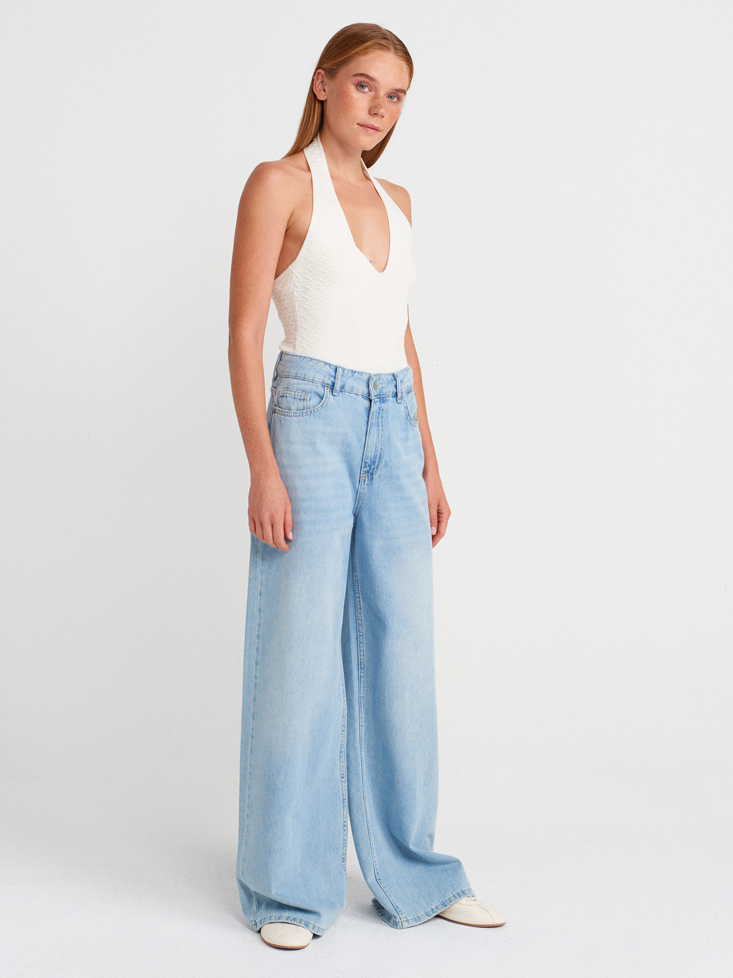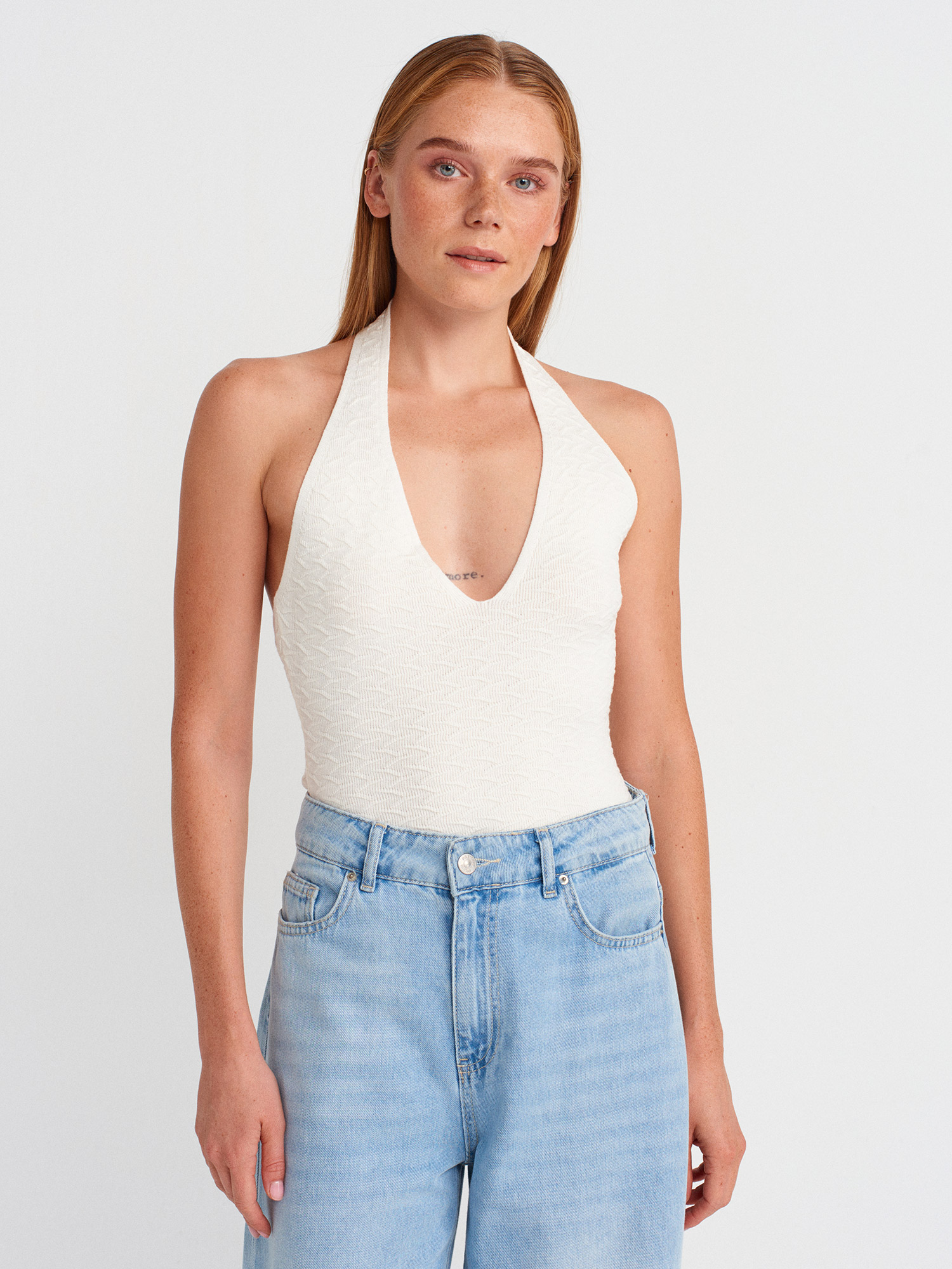 10799 Halter V Yaka Dokulu Triko Bluz-Ekru