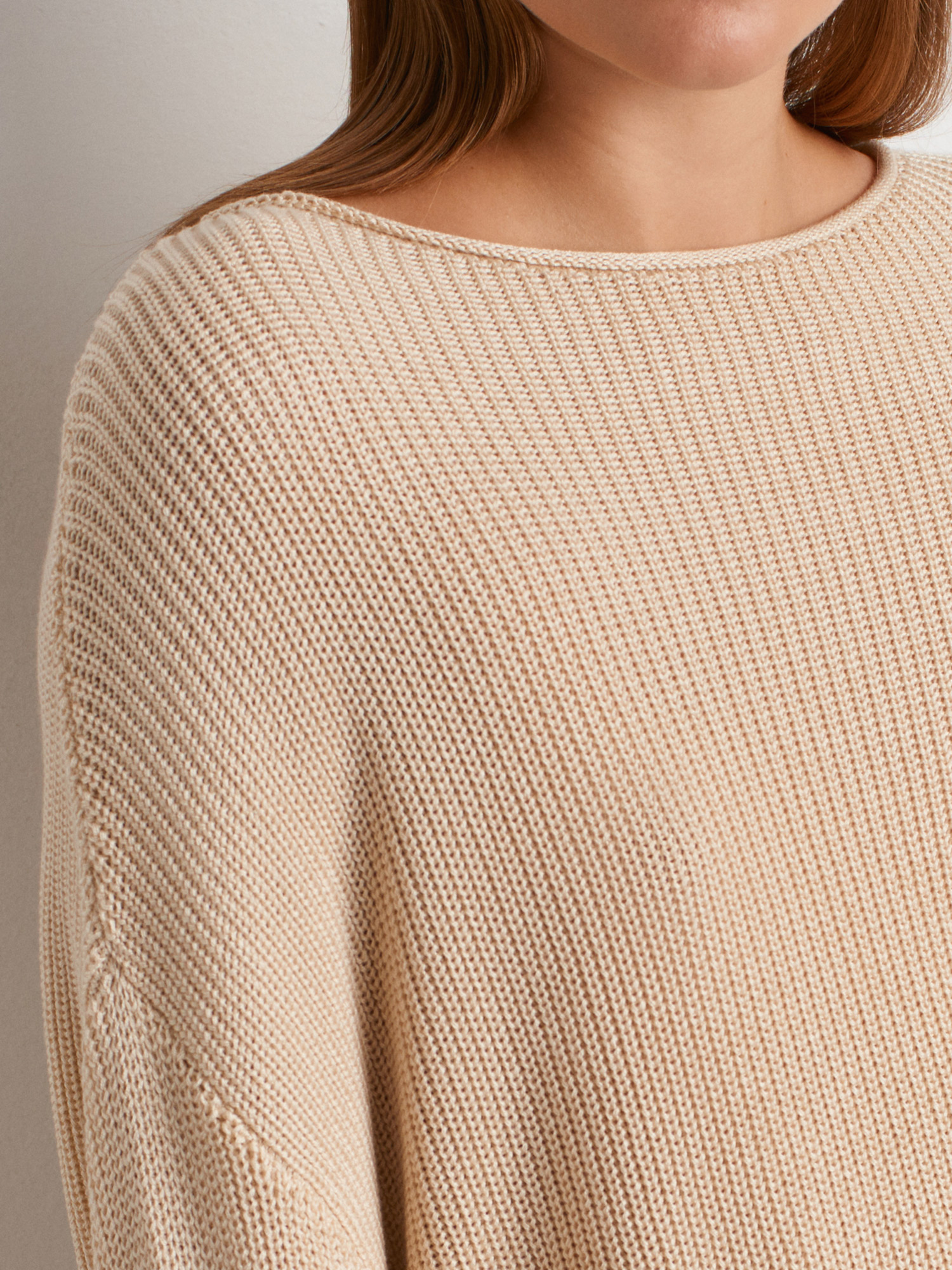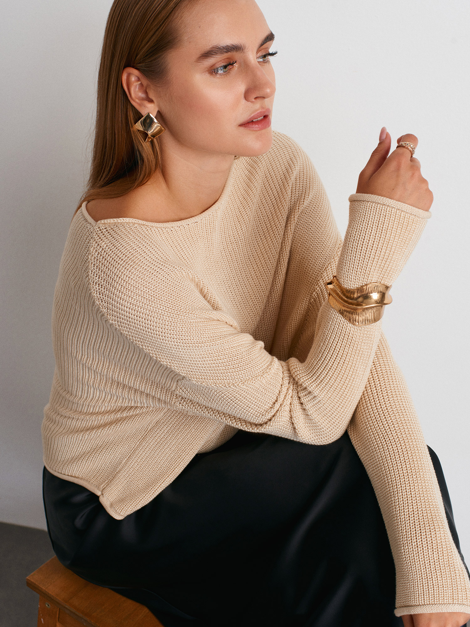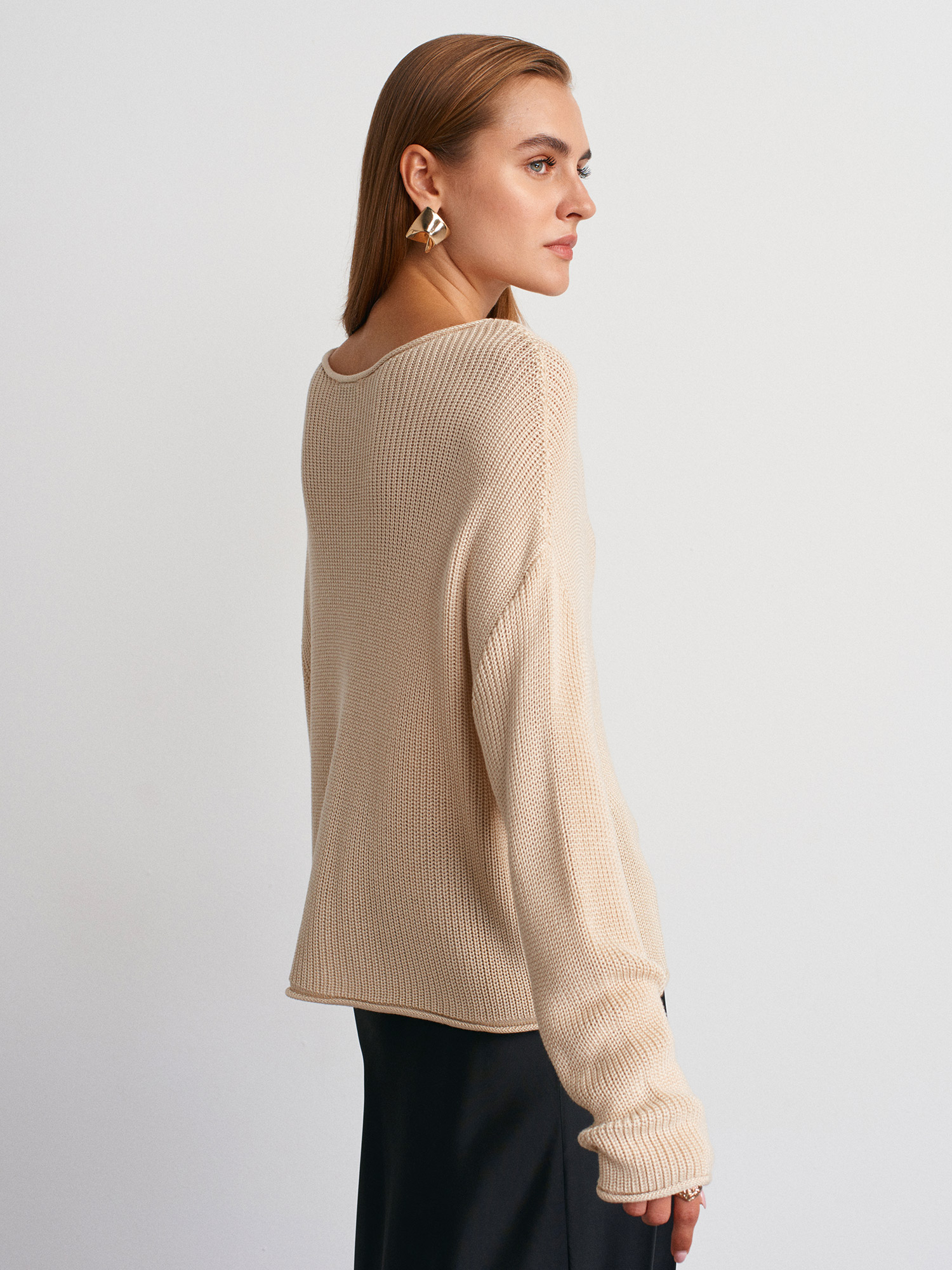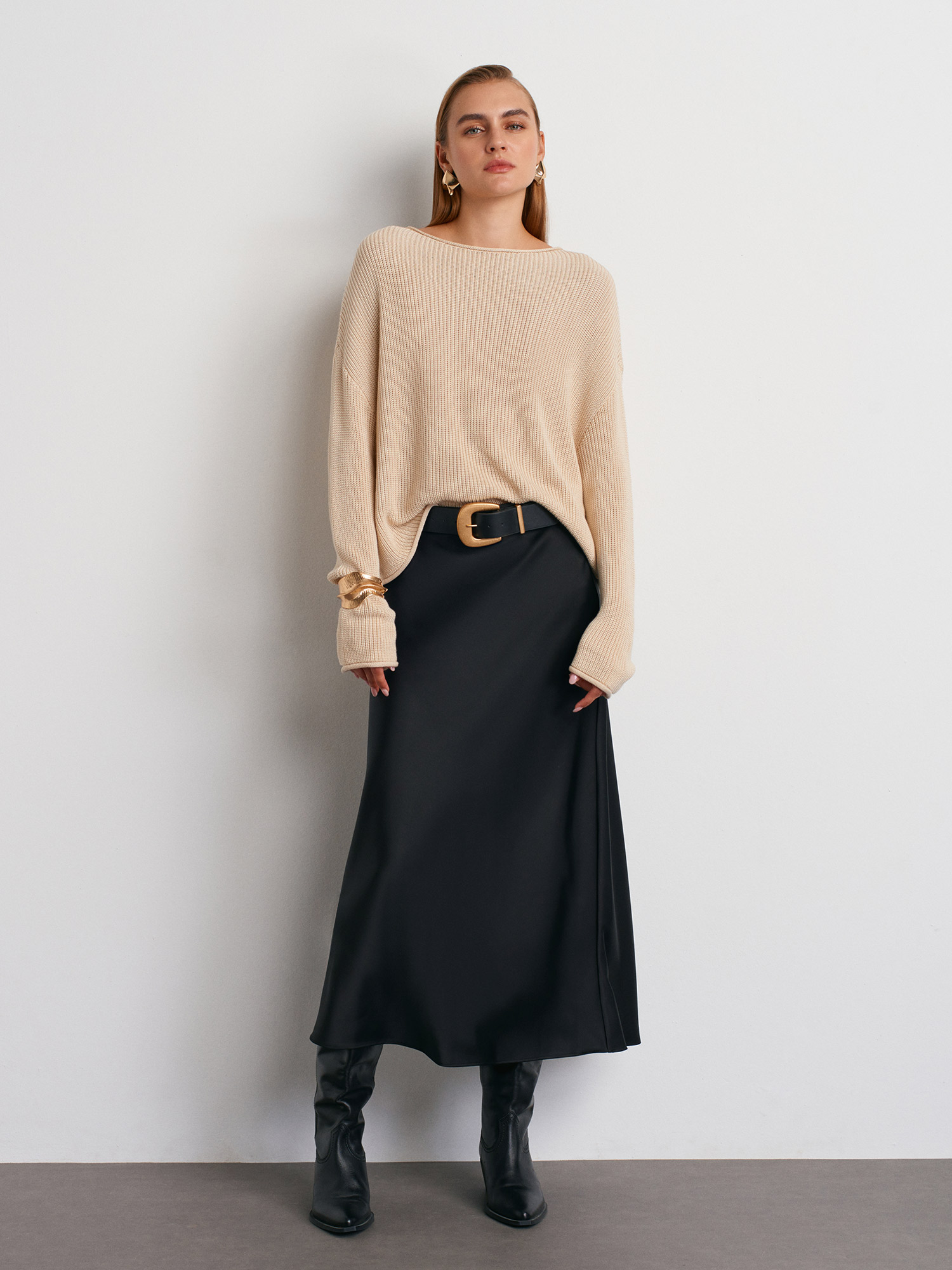 10804 Kayık Yaka Dökümlü Triko Kazak-Bej