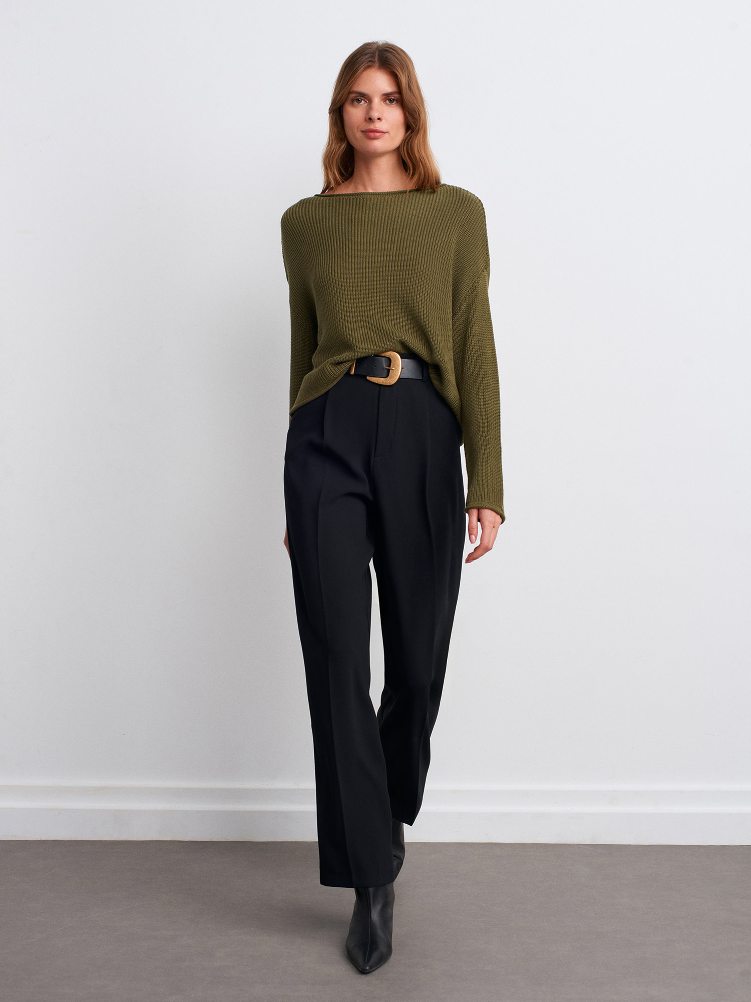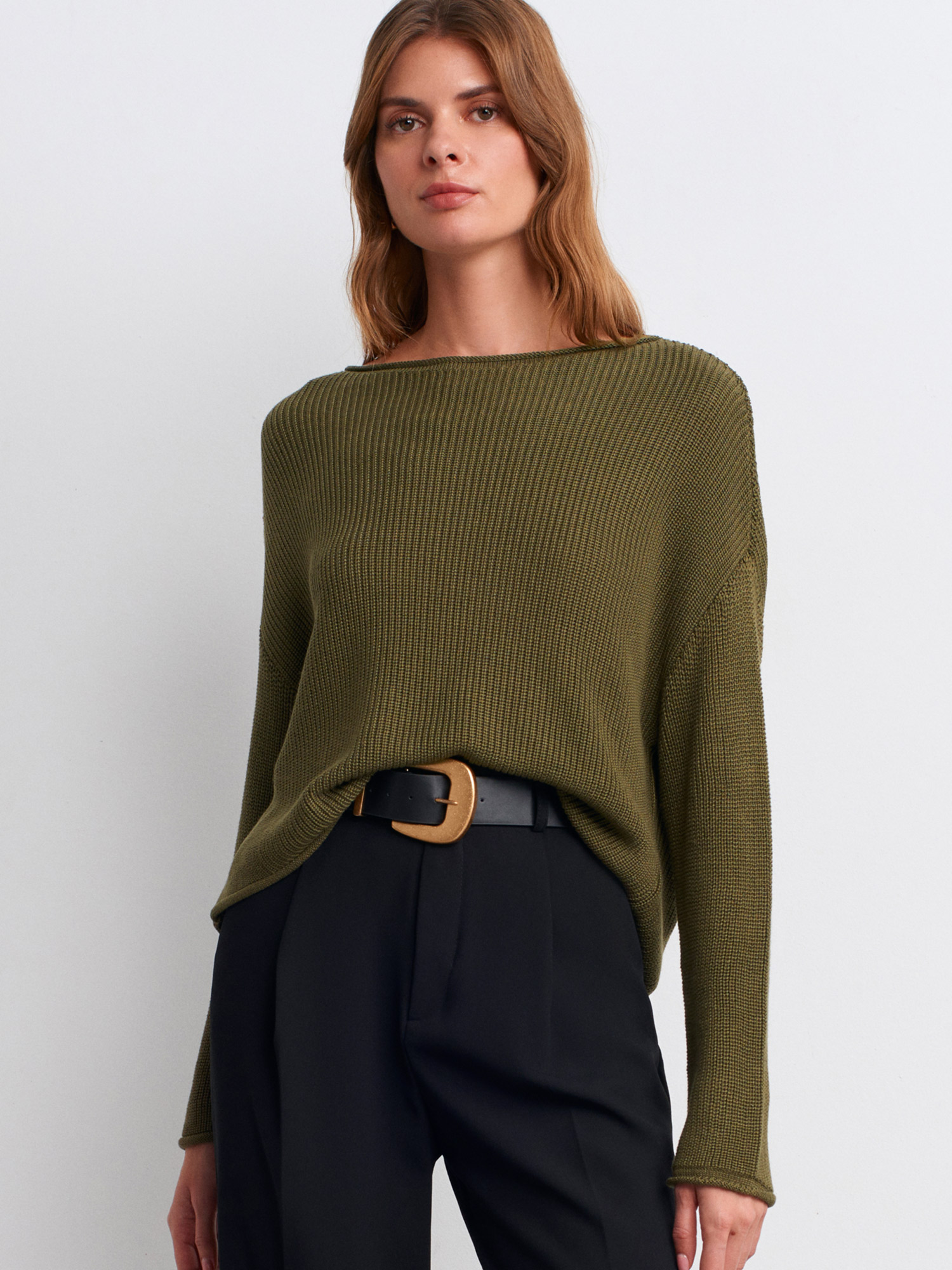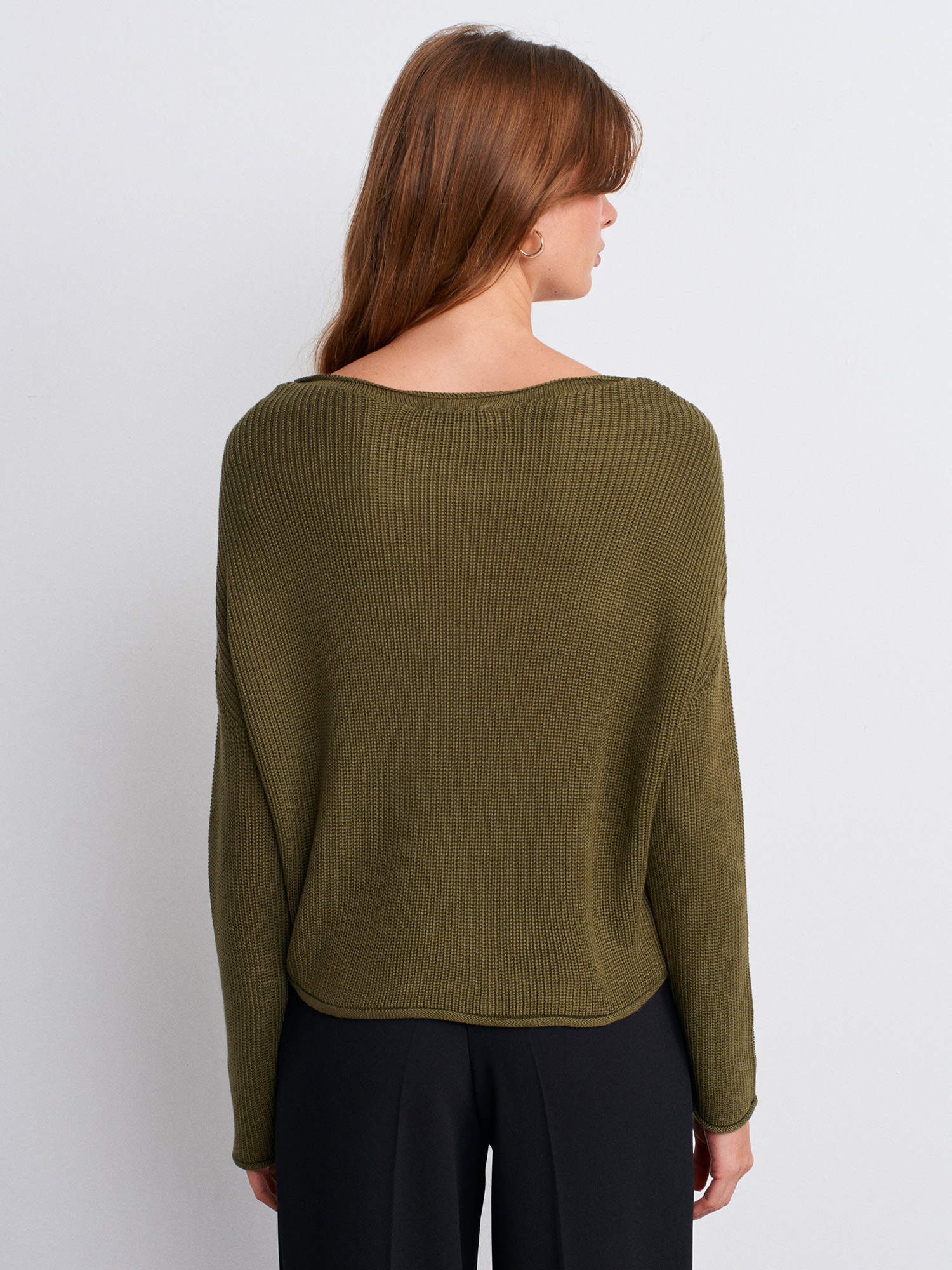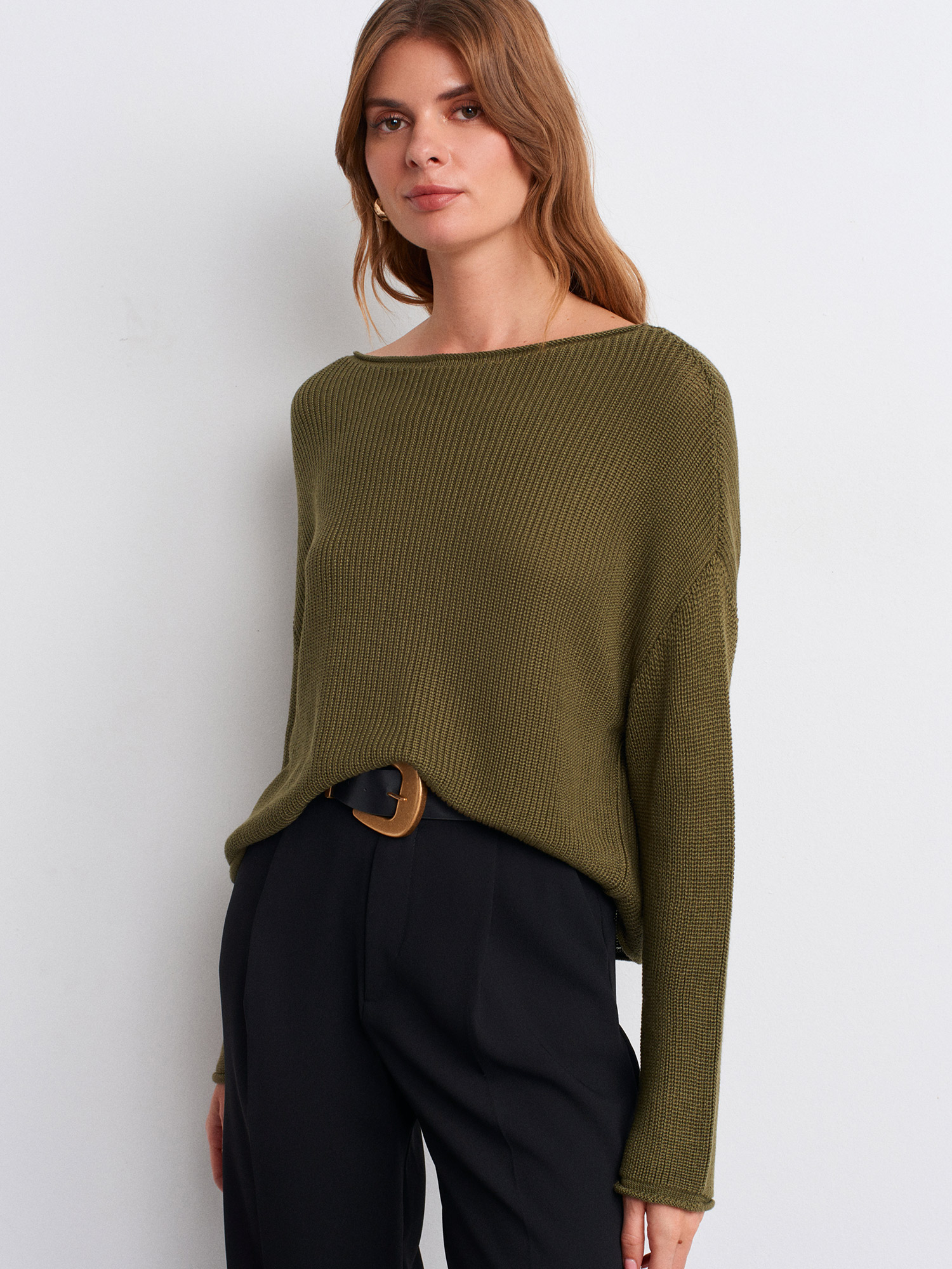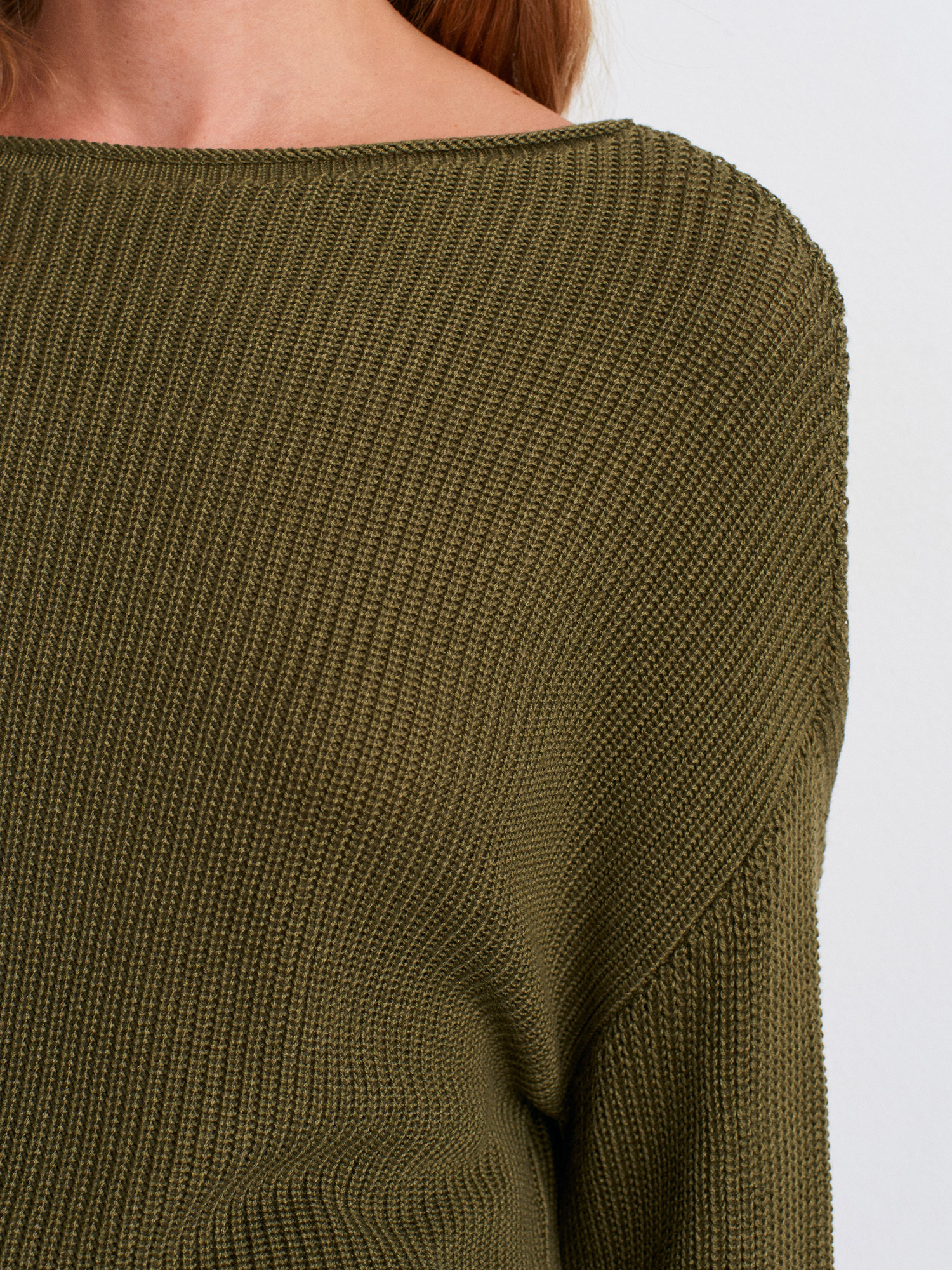 10804 Kayık Yaka Dökümlü Triko Kazak-Haki