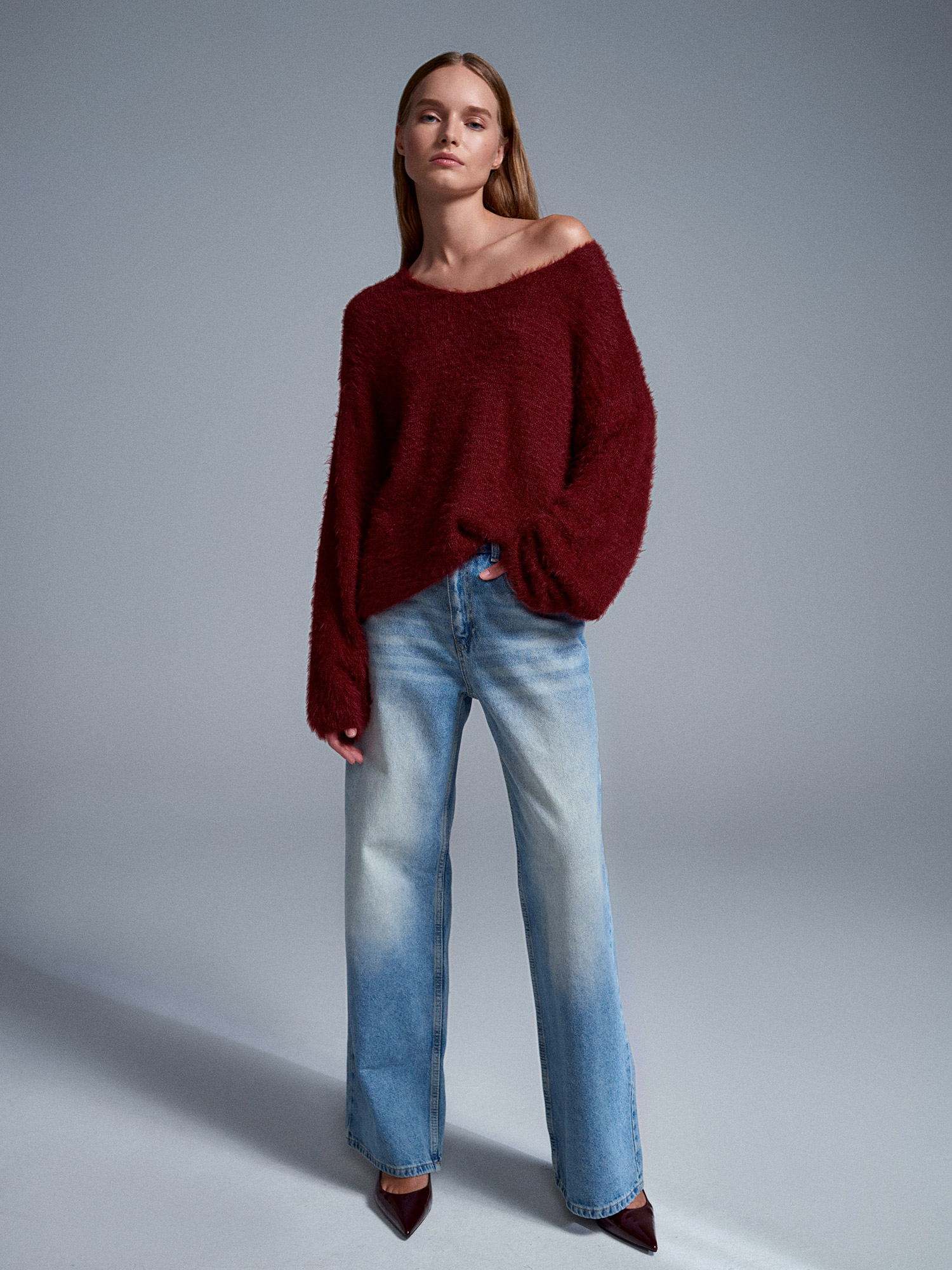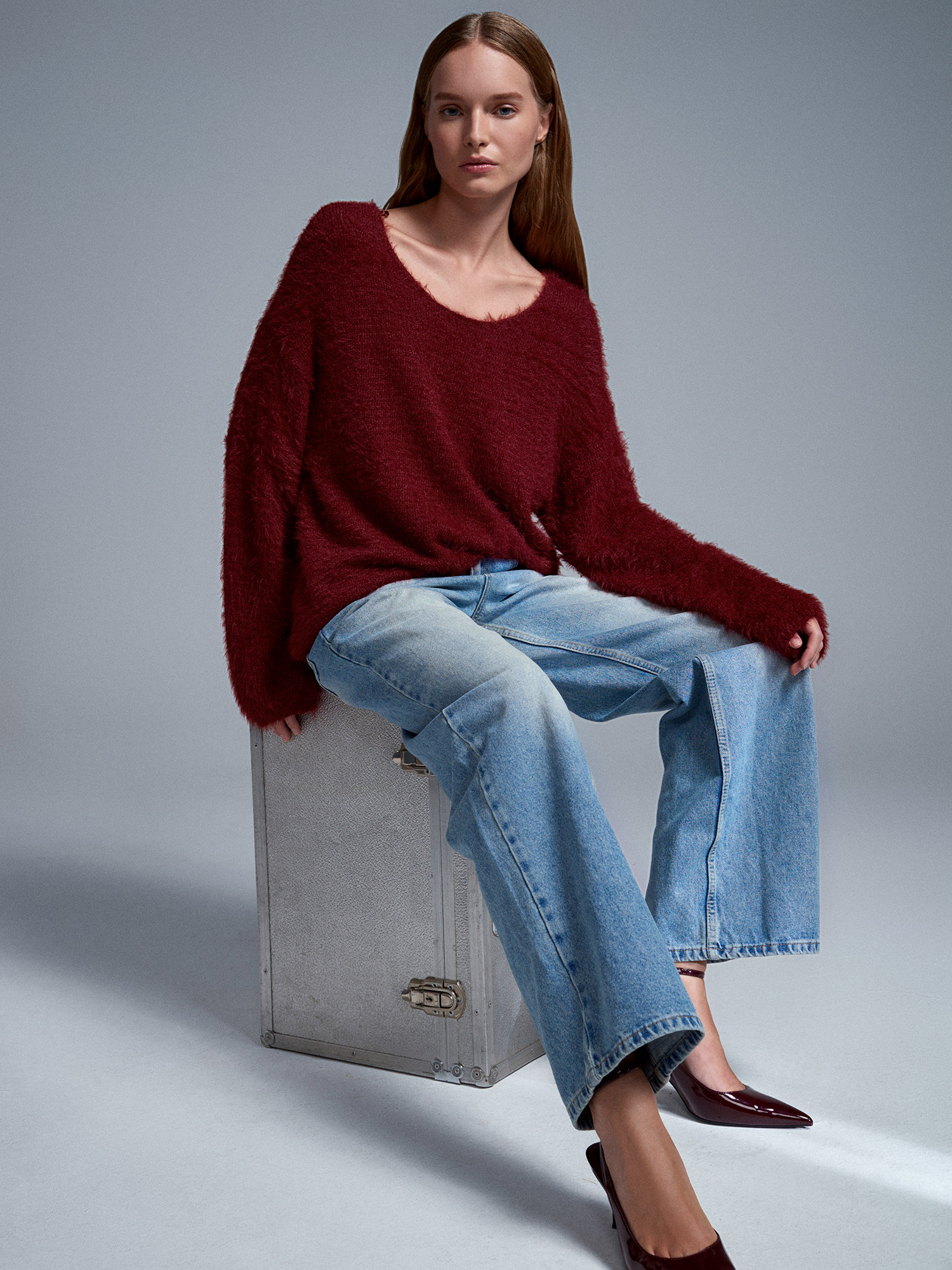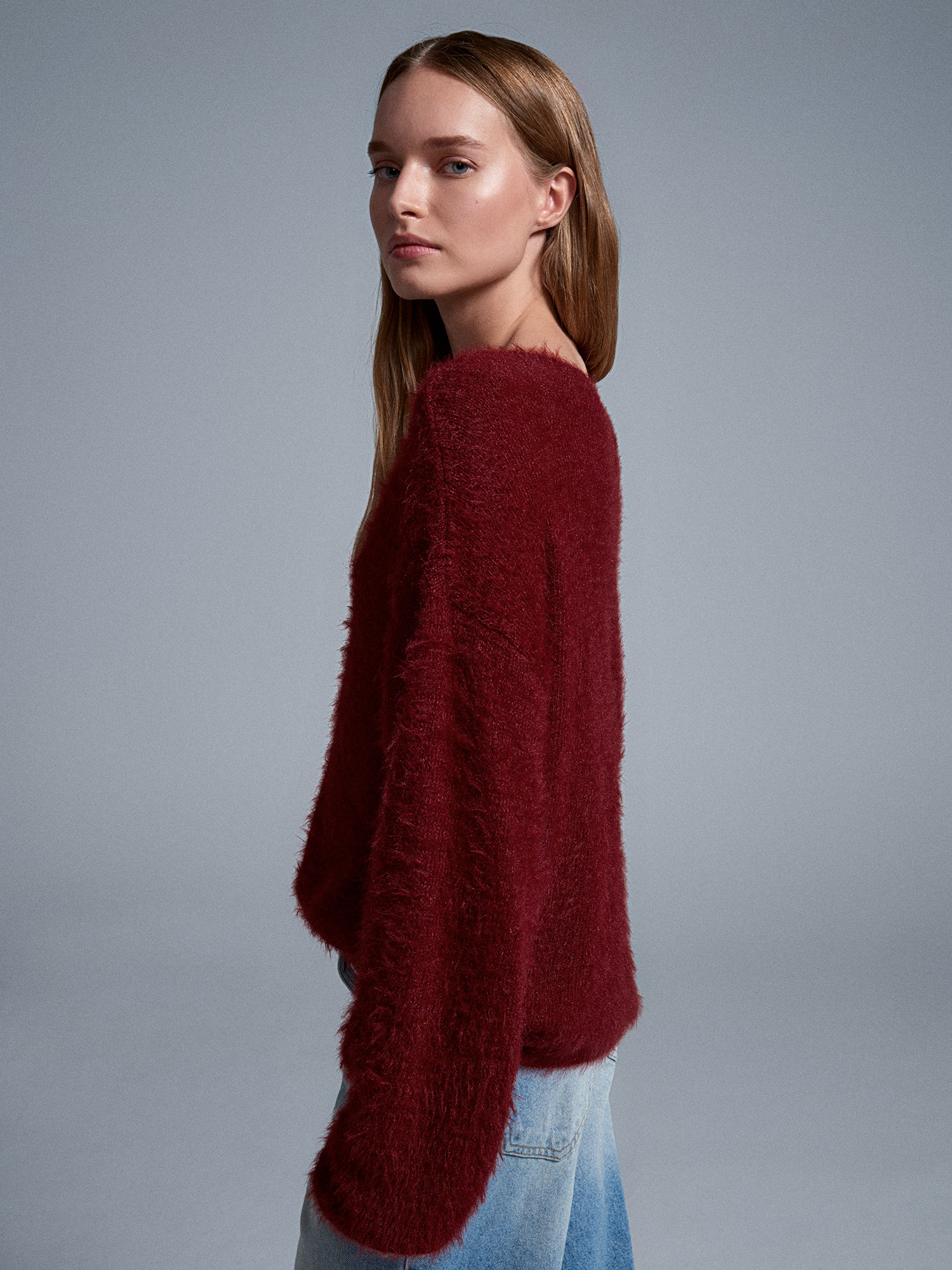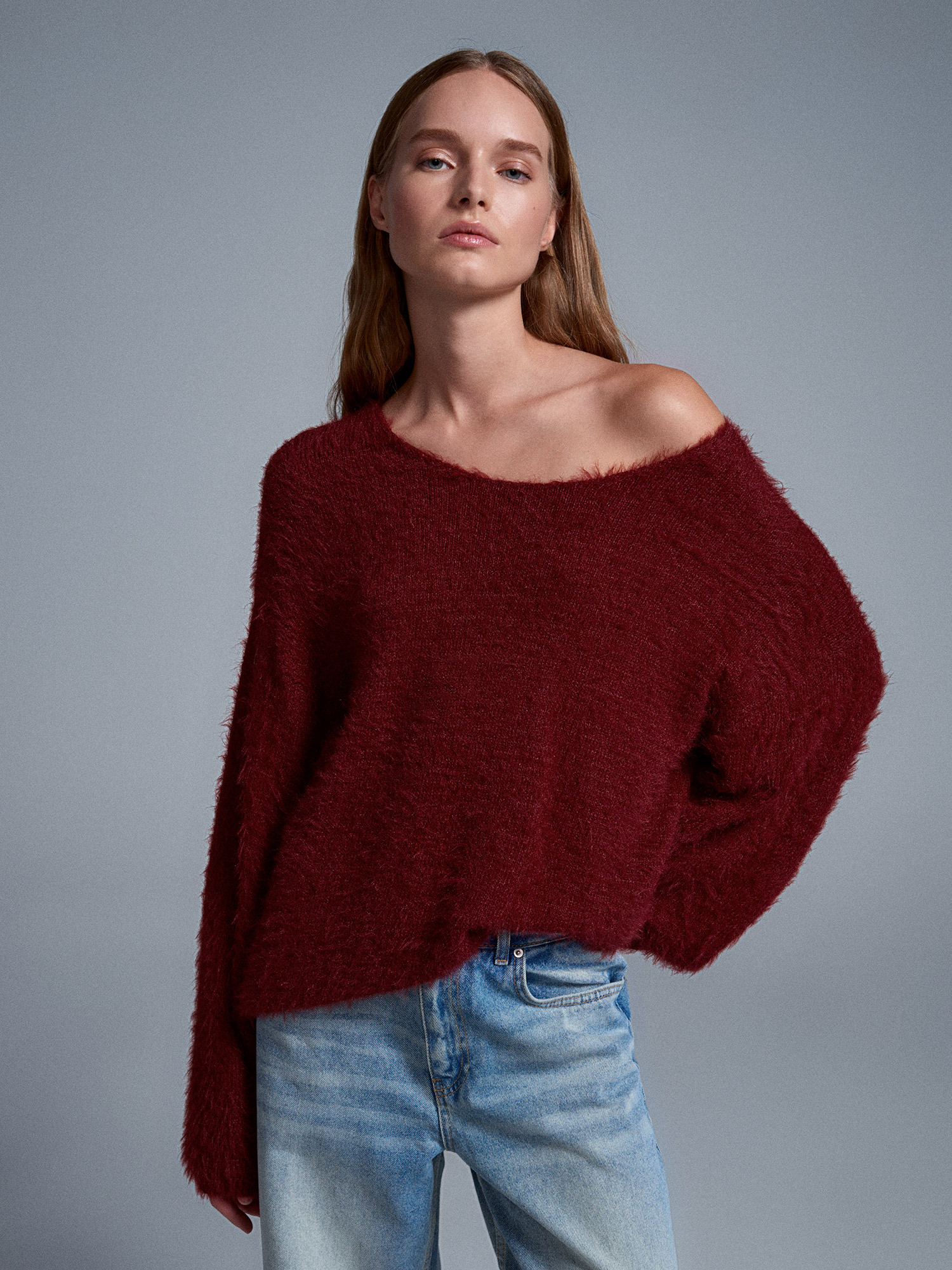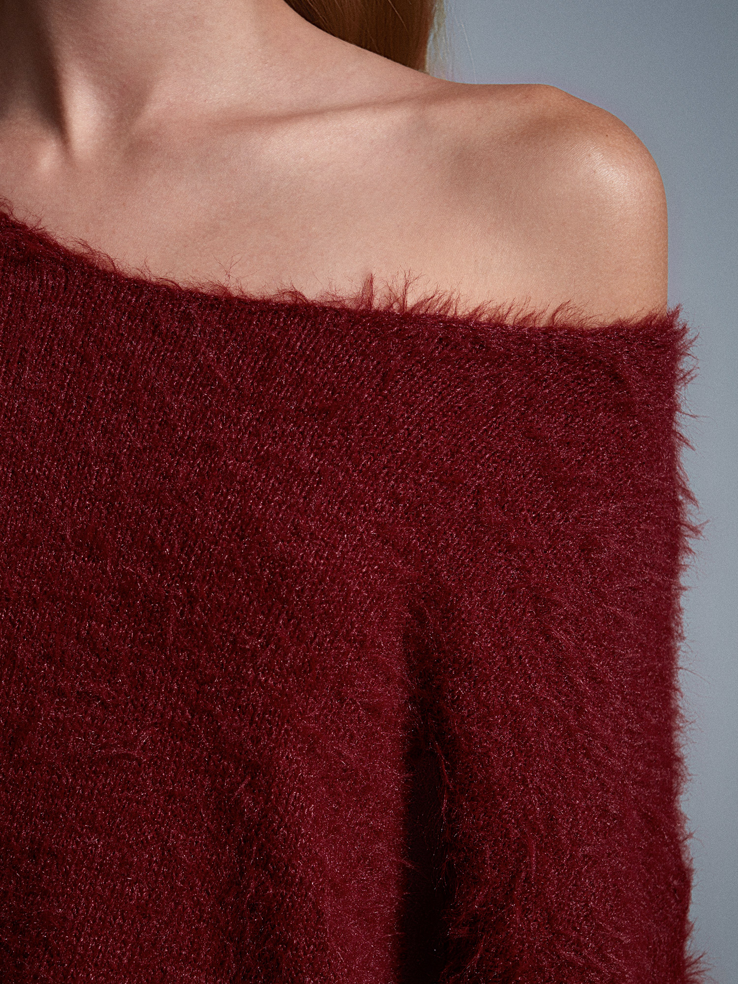 10806 Kayık Yaka Yumuşak Dokulu Triko Kazak-Koyu Bordo