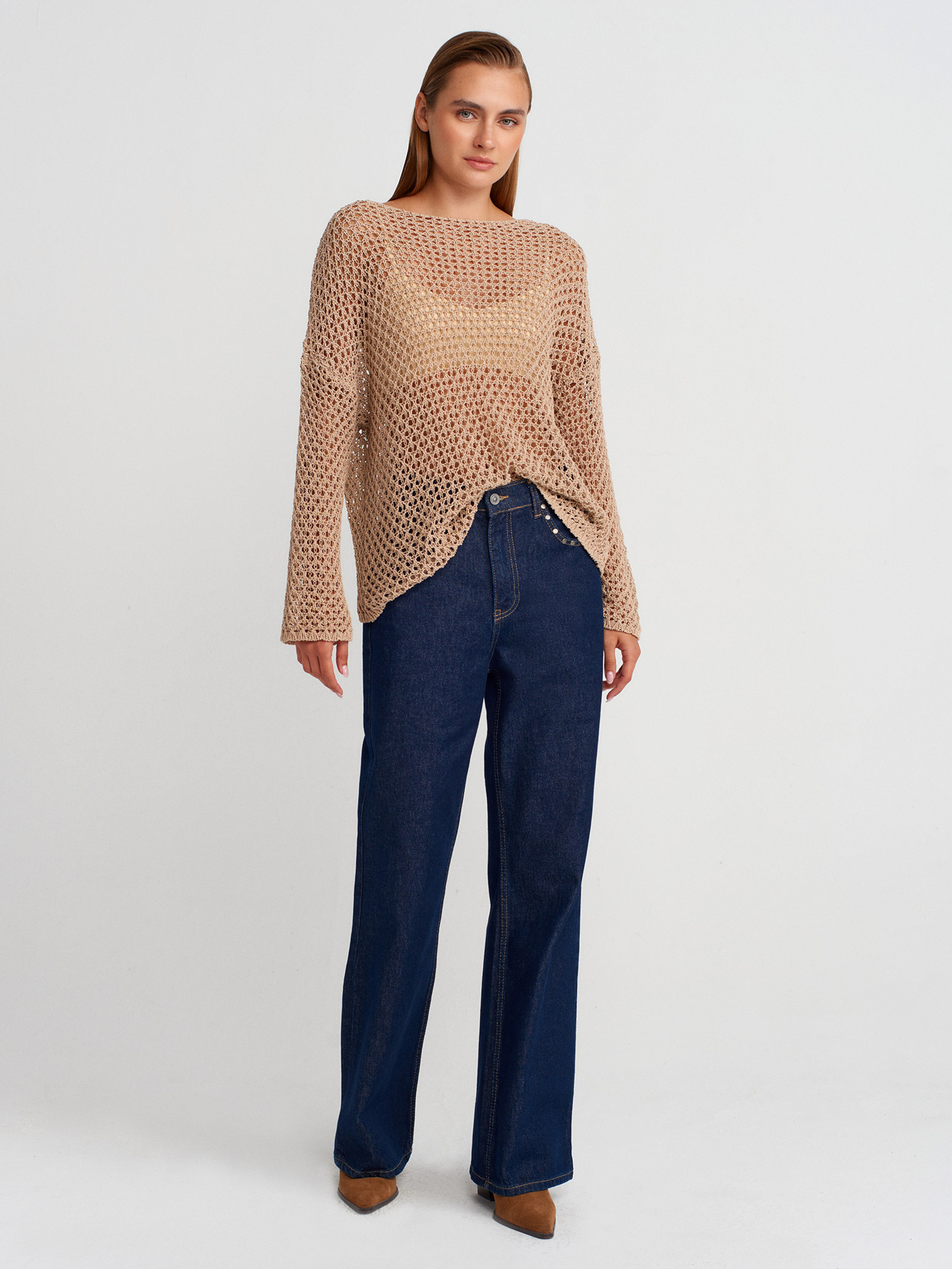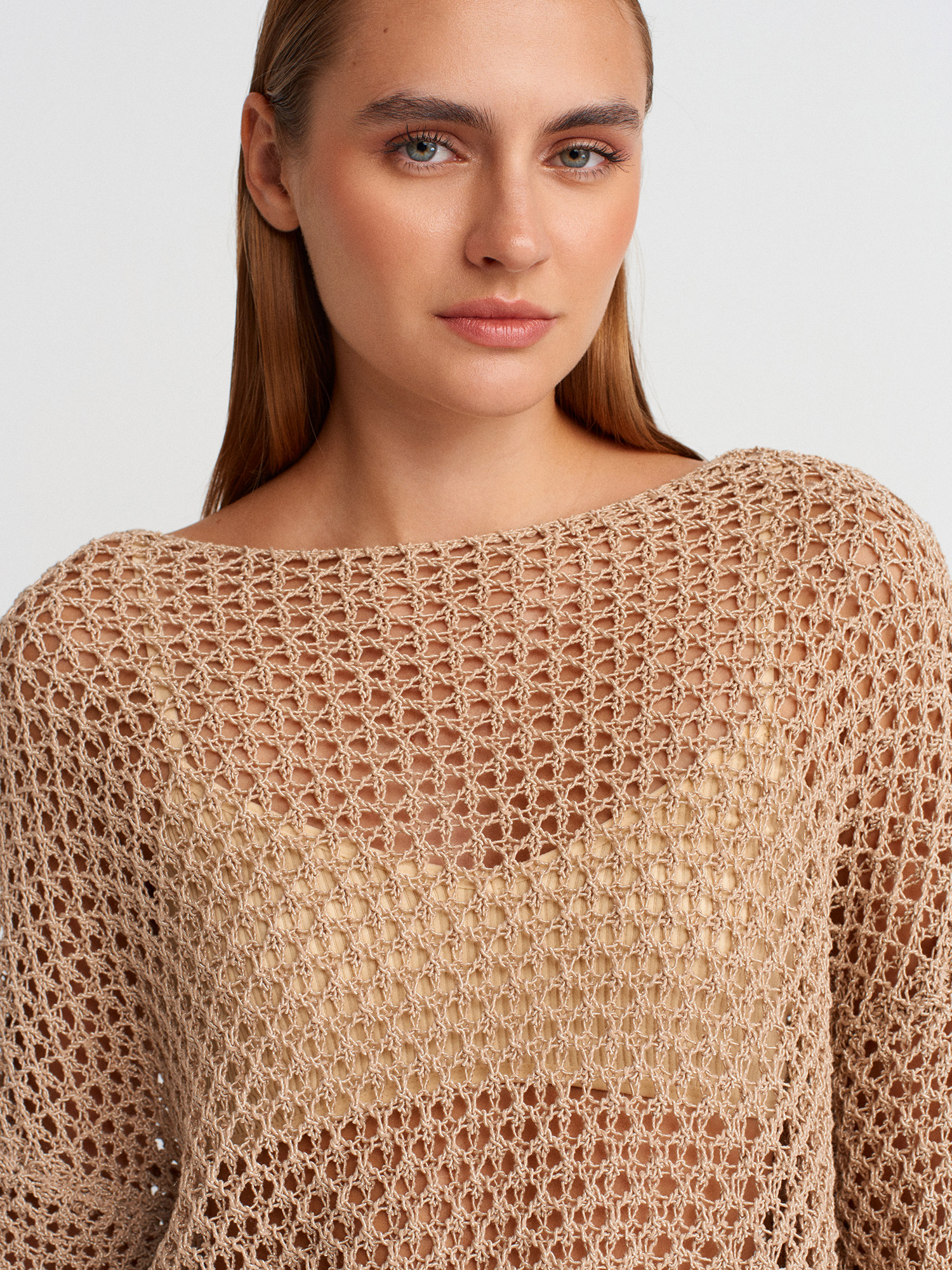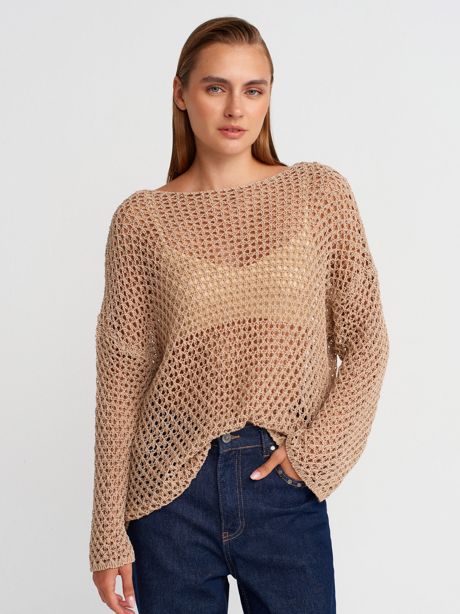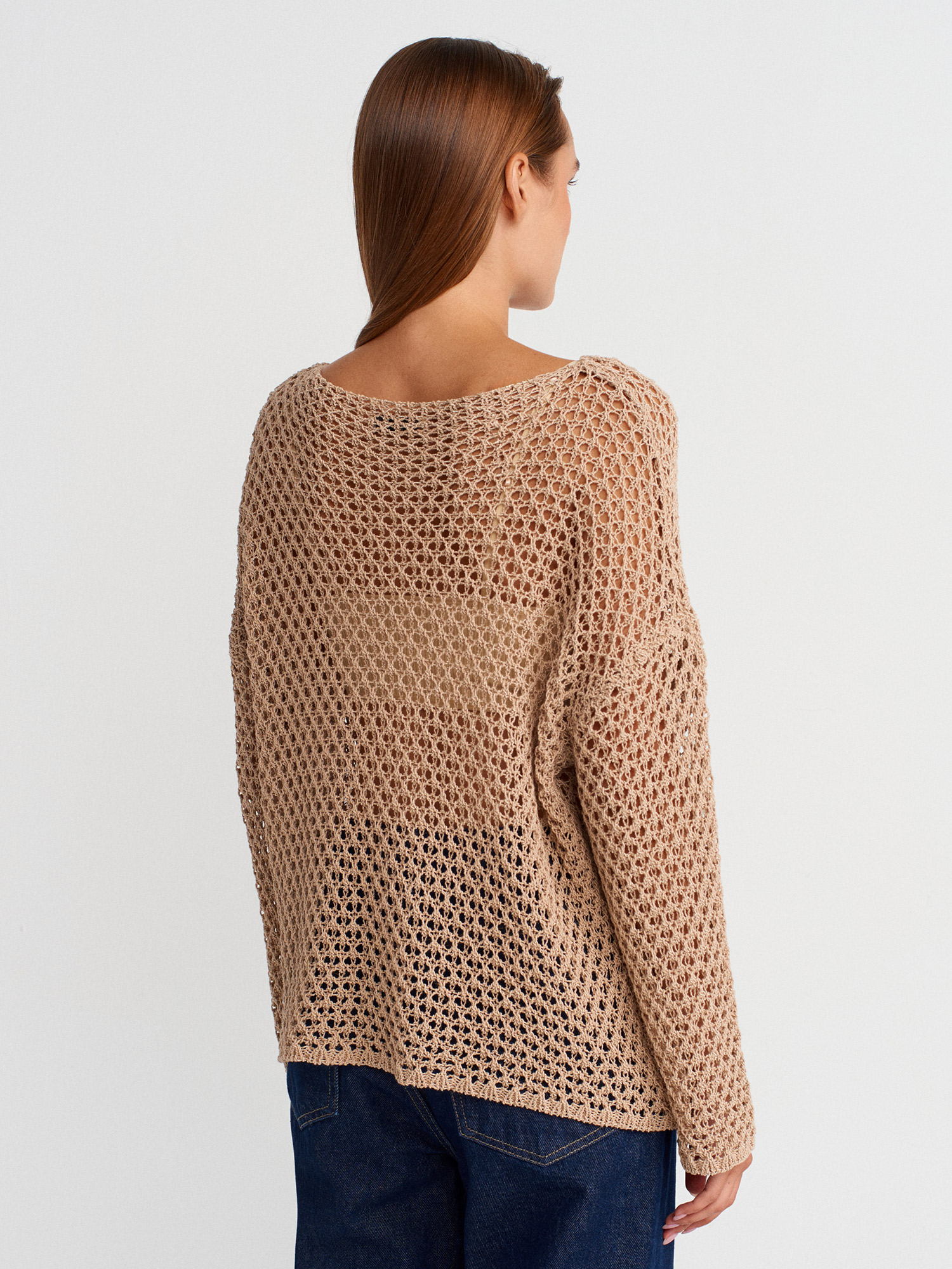10807 Kayık Yaka Ajurlu Triko Kazak-Bej