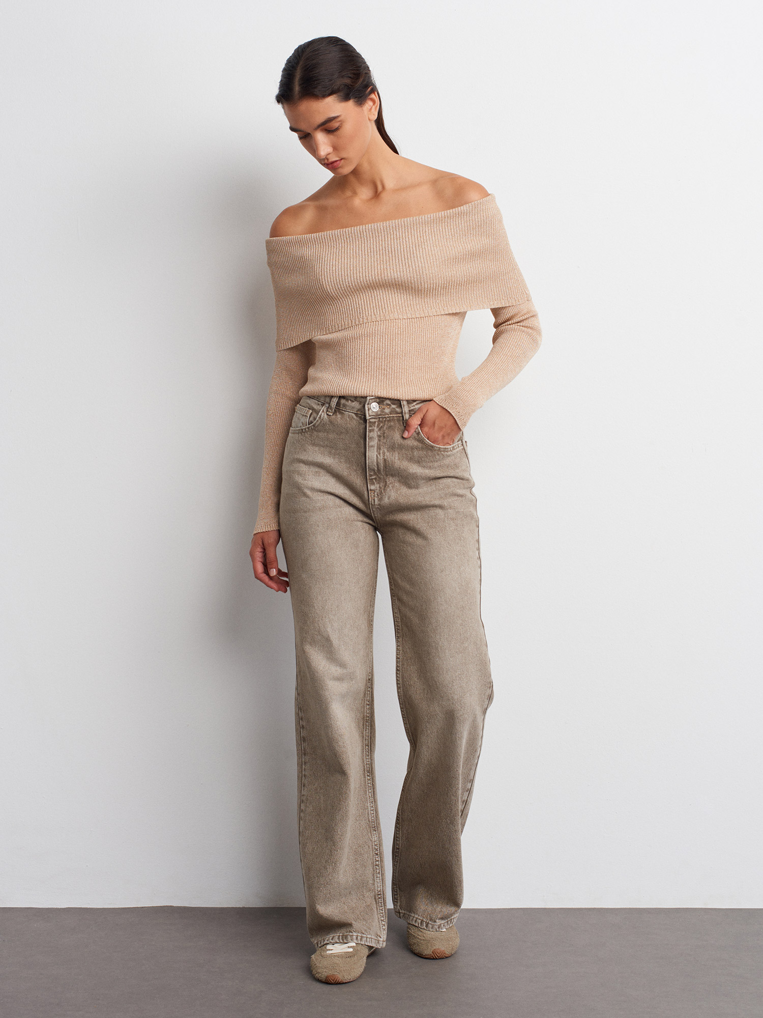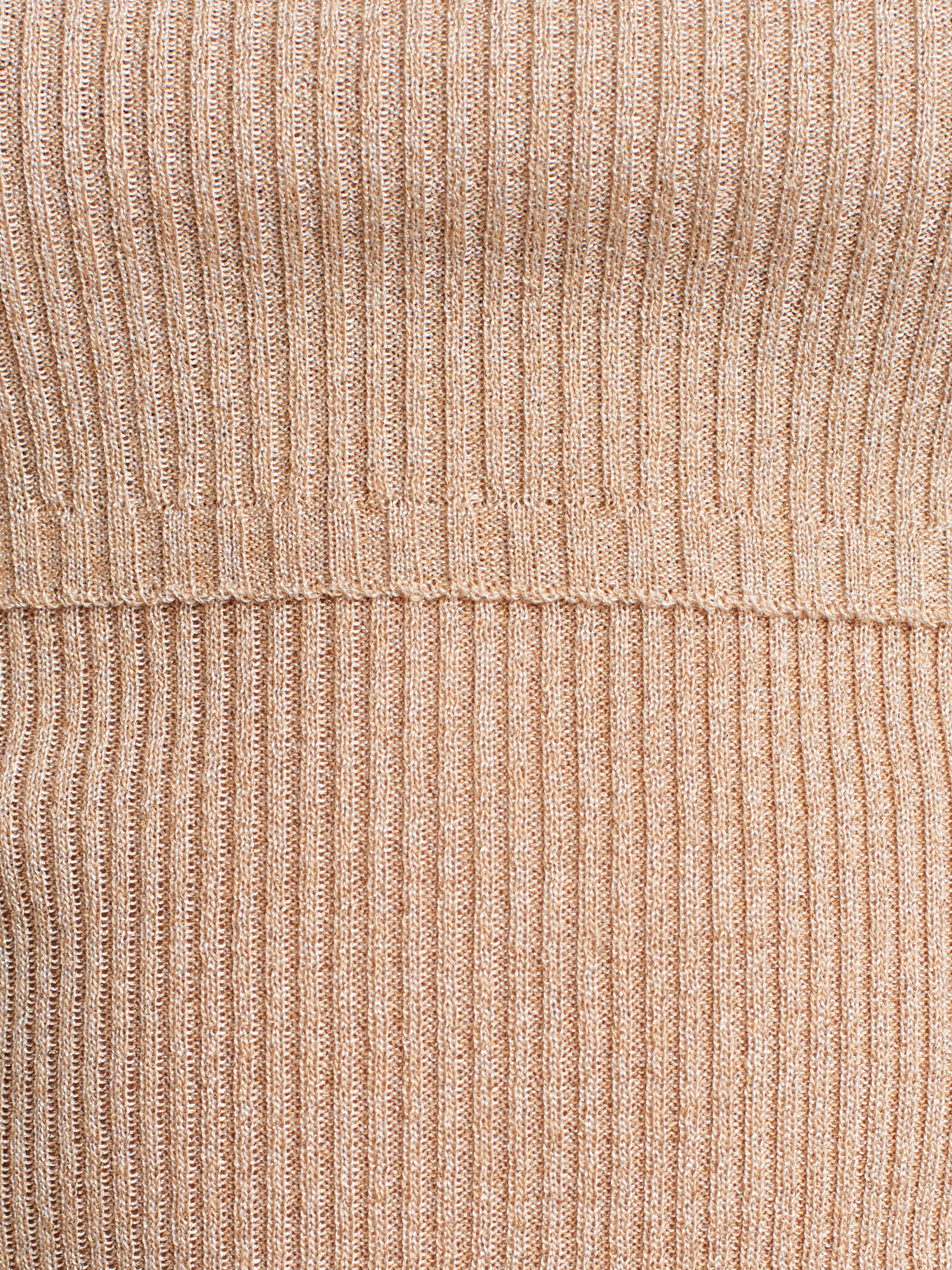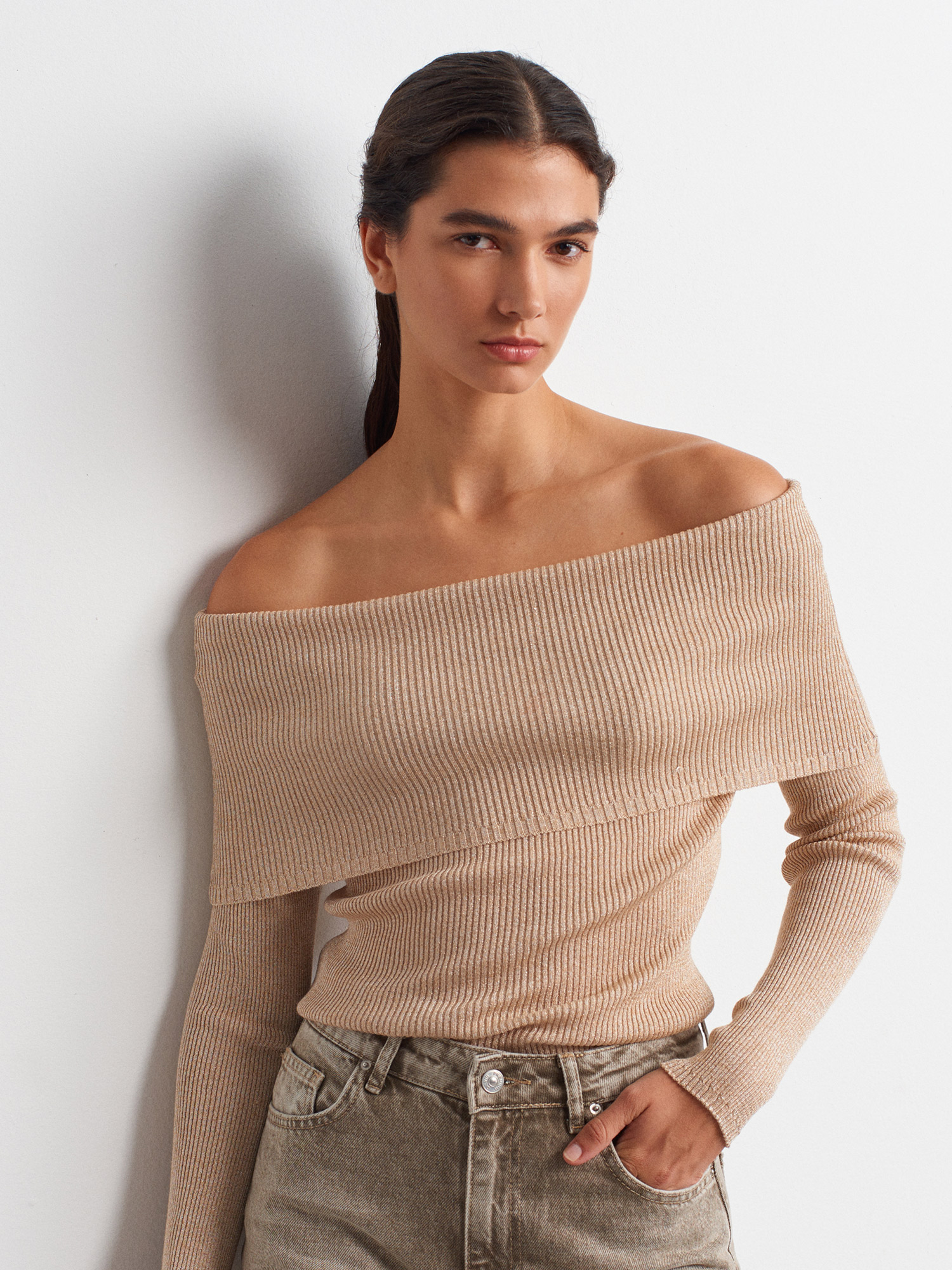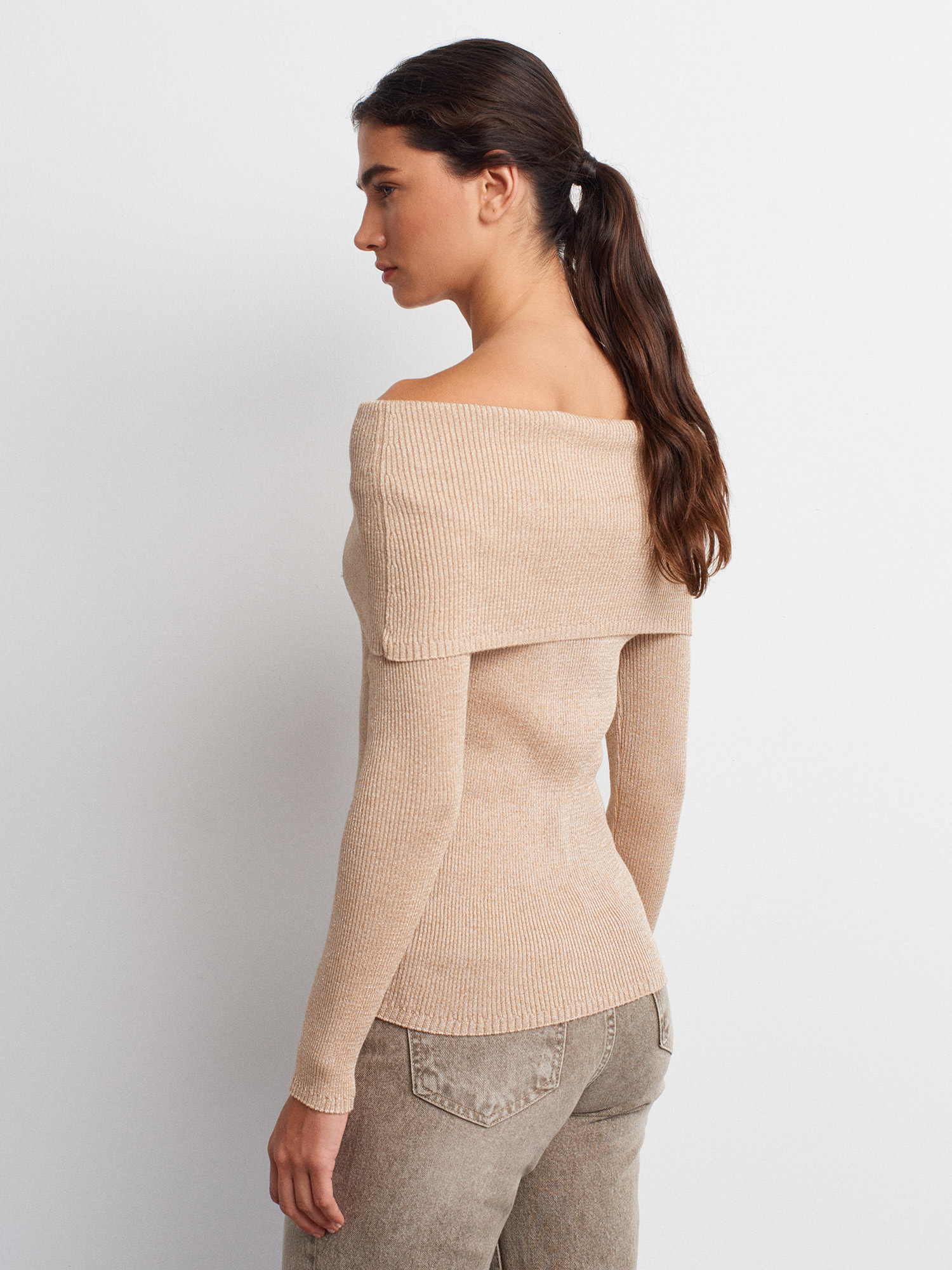 10808 Bardot Yaka Fitilli Simli Triko Kazak-Bej