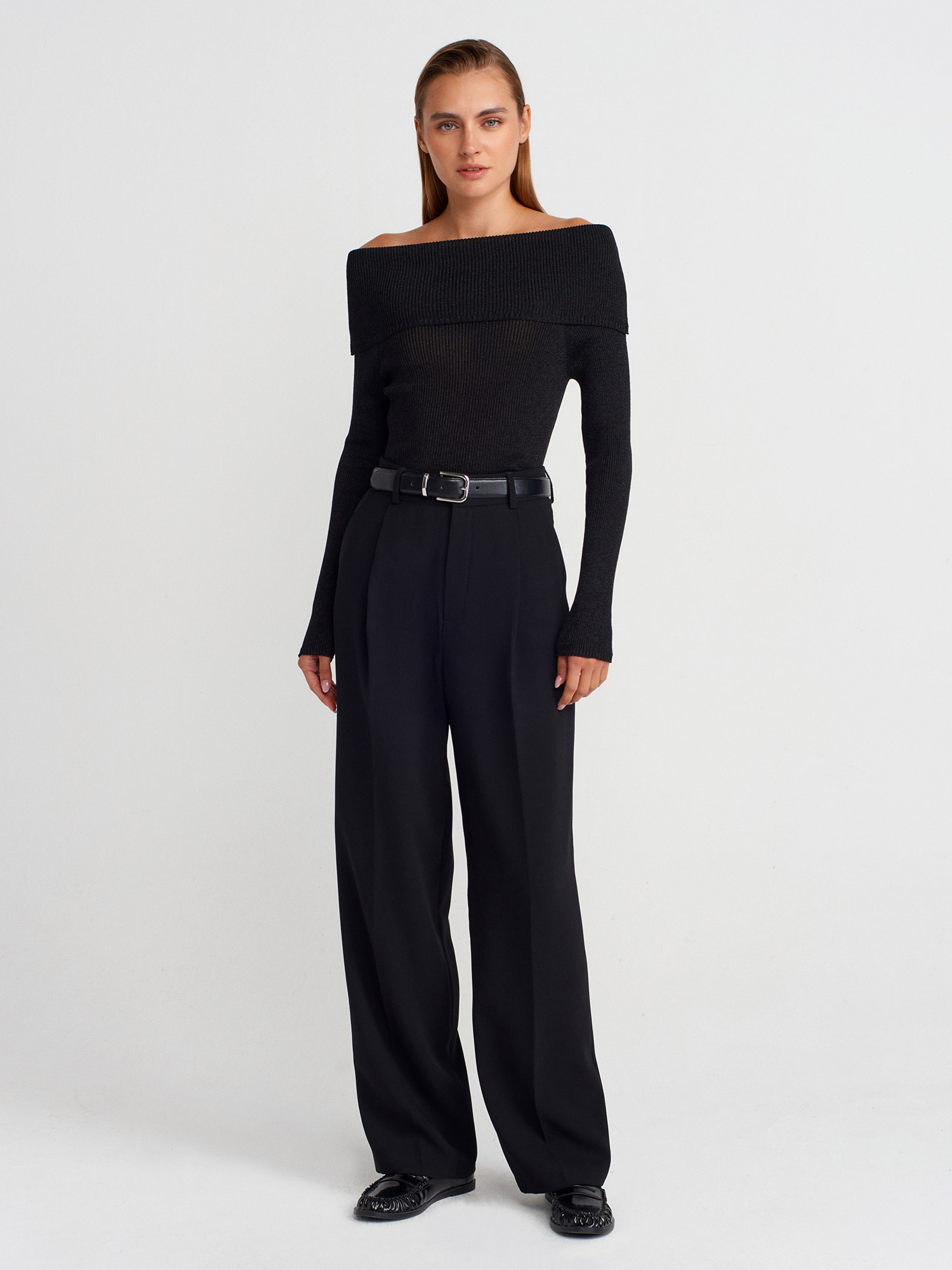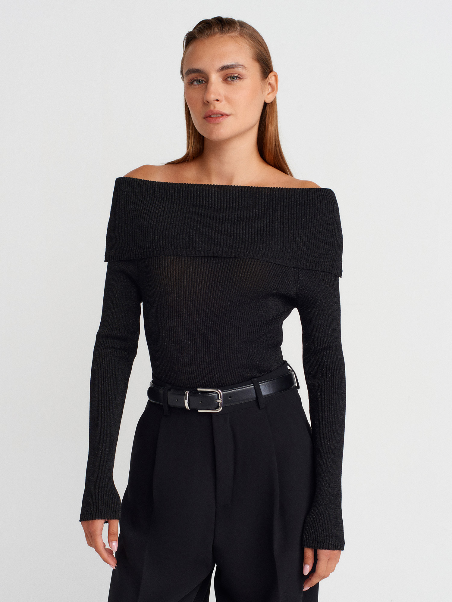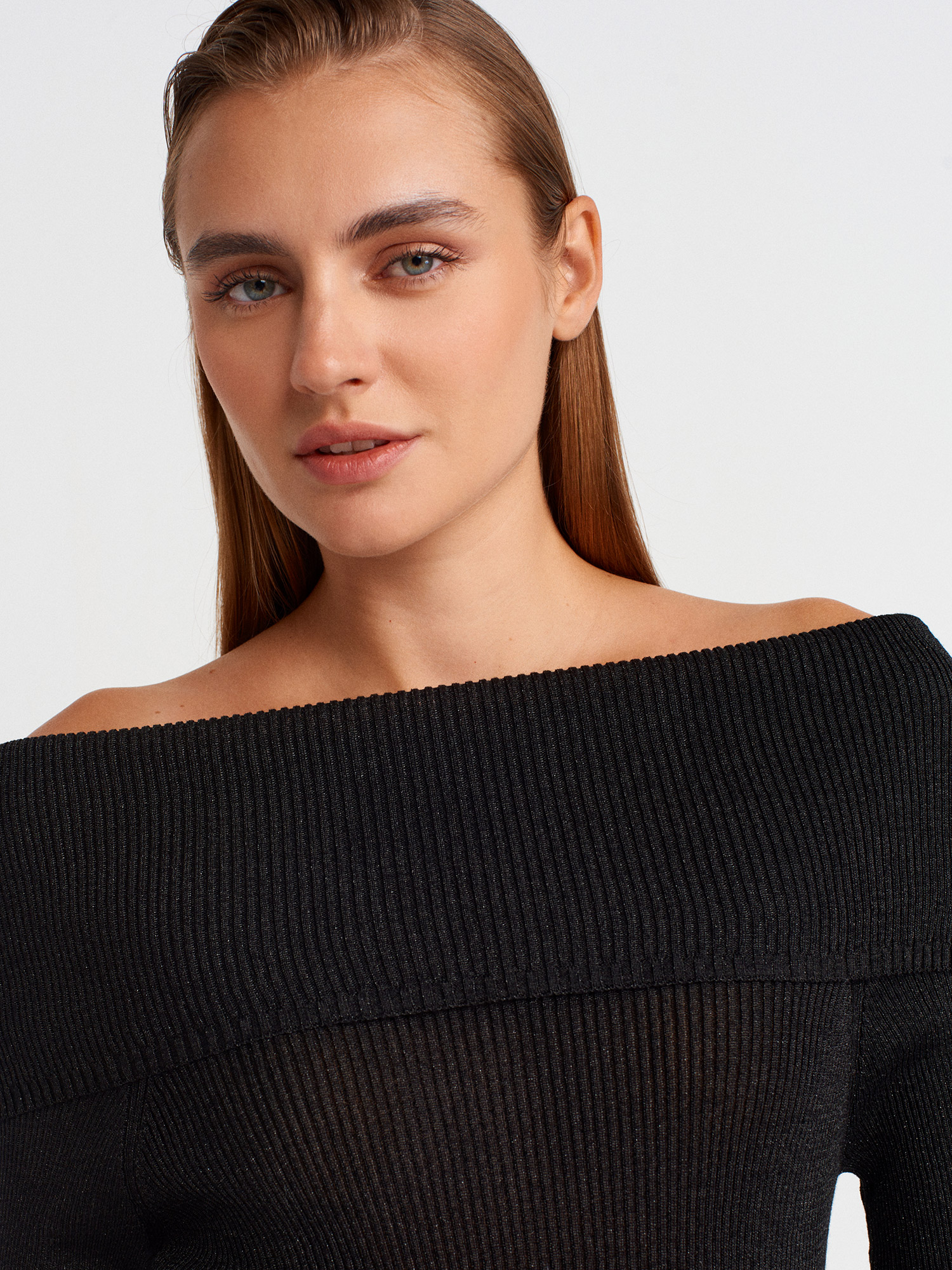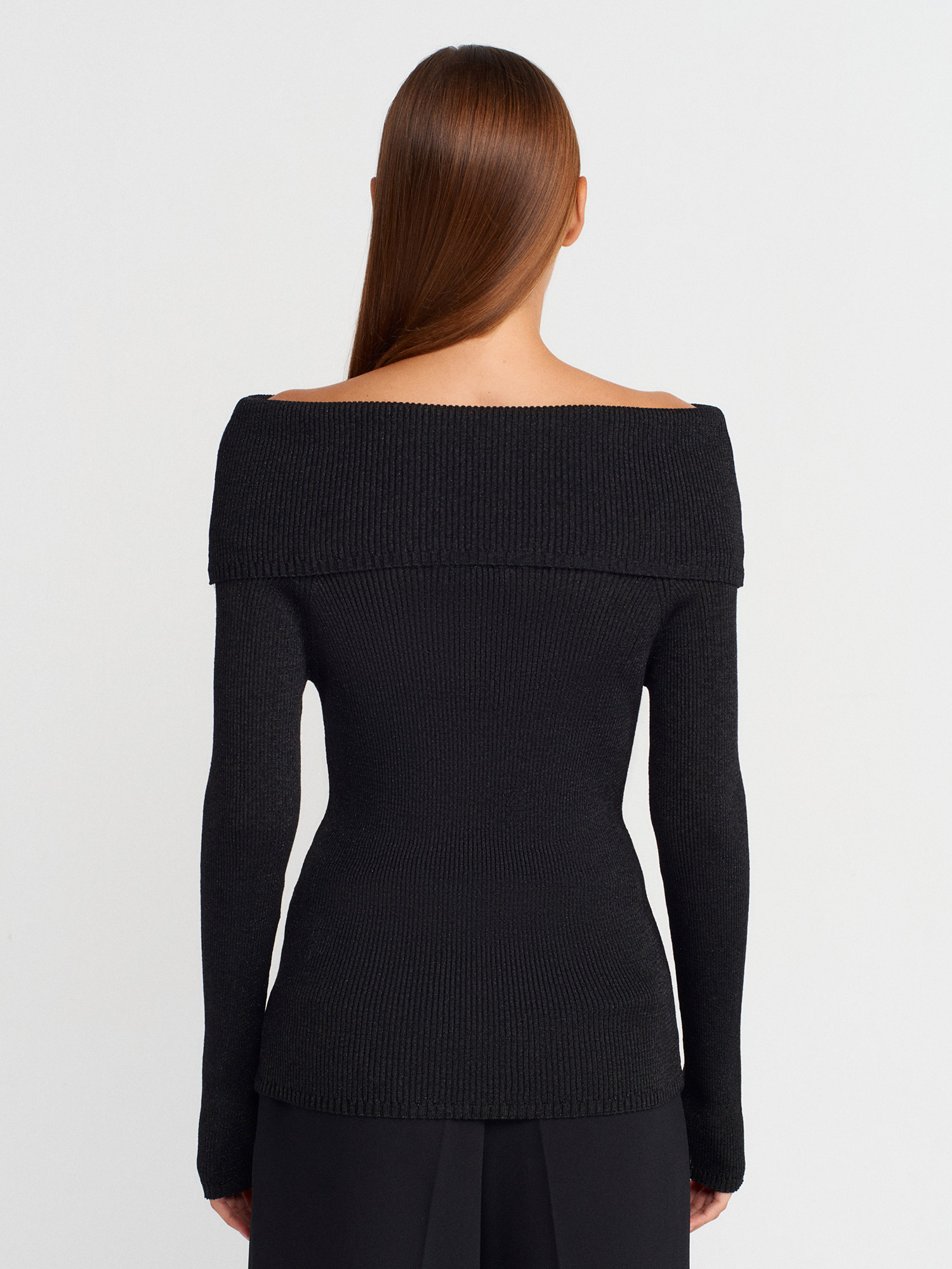 10808 Bardot Yaka Fitilli Simli Triko Kazak-Siyah