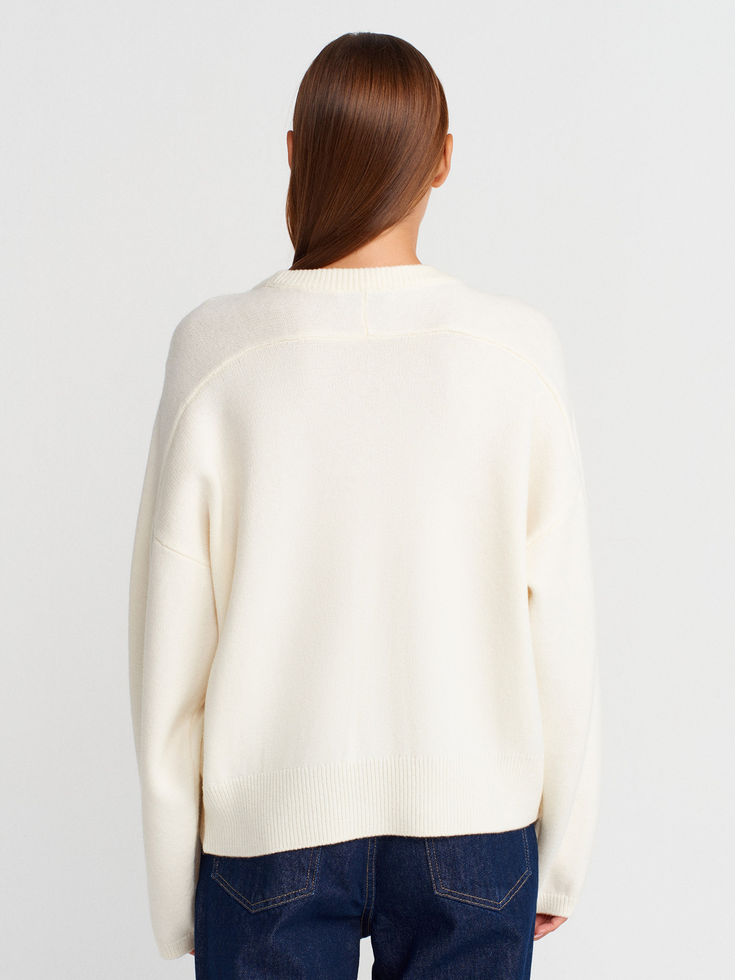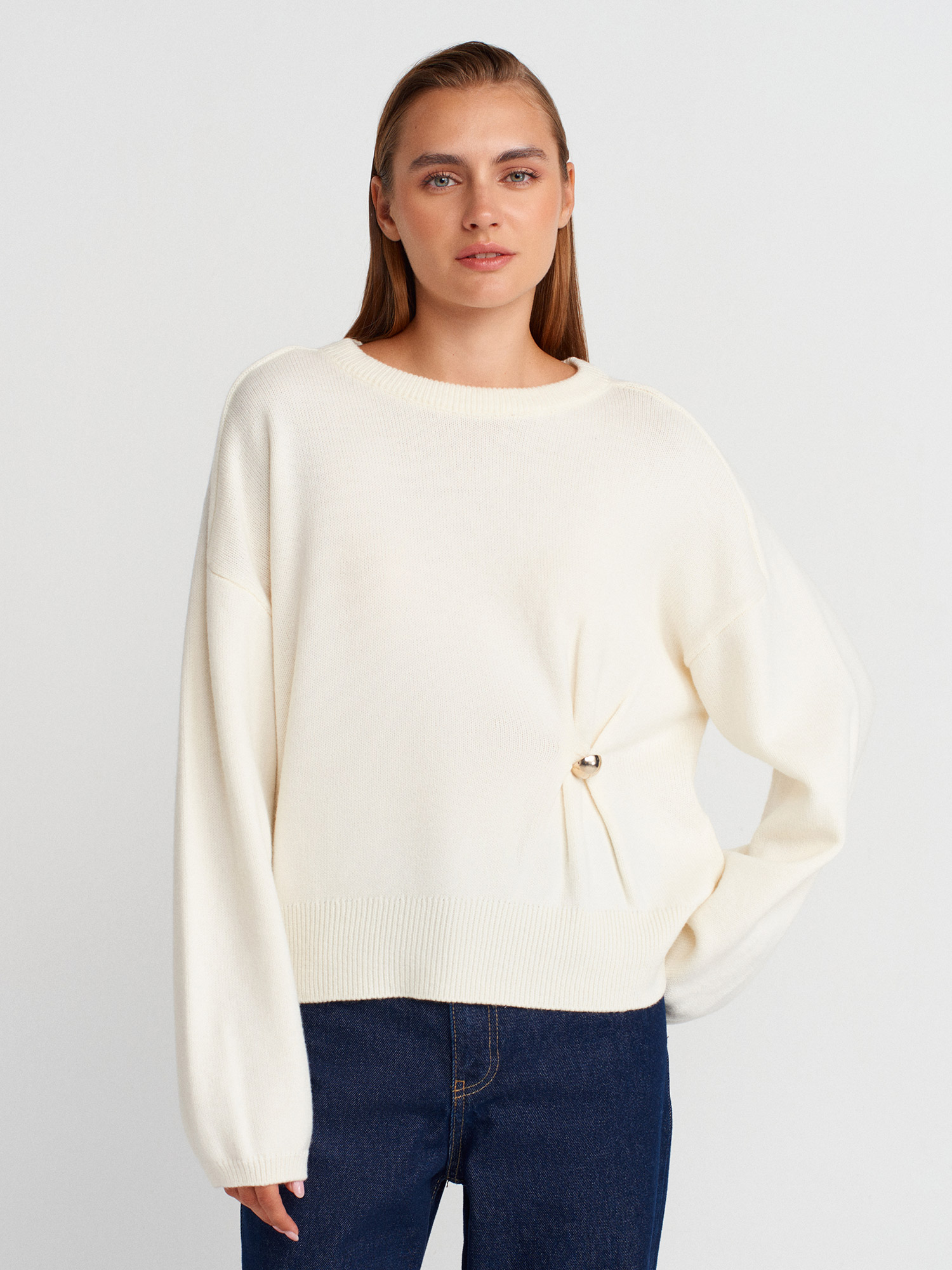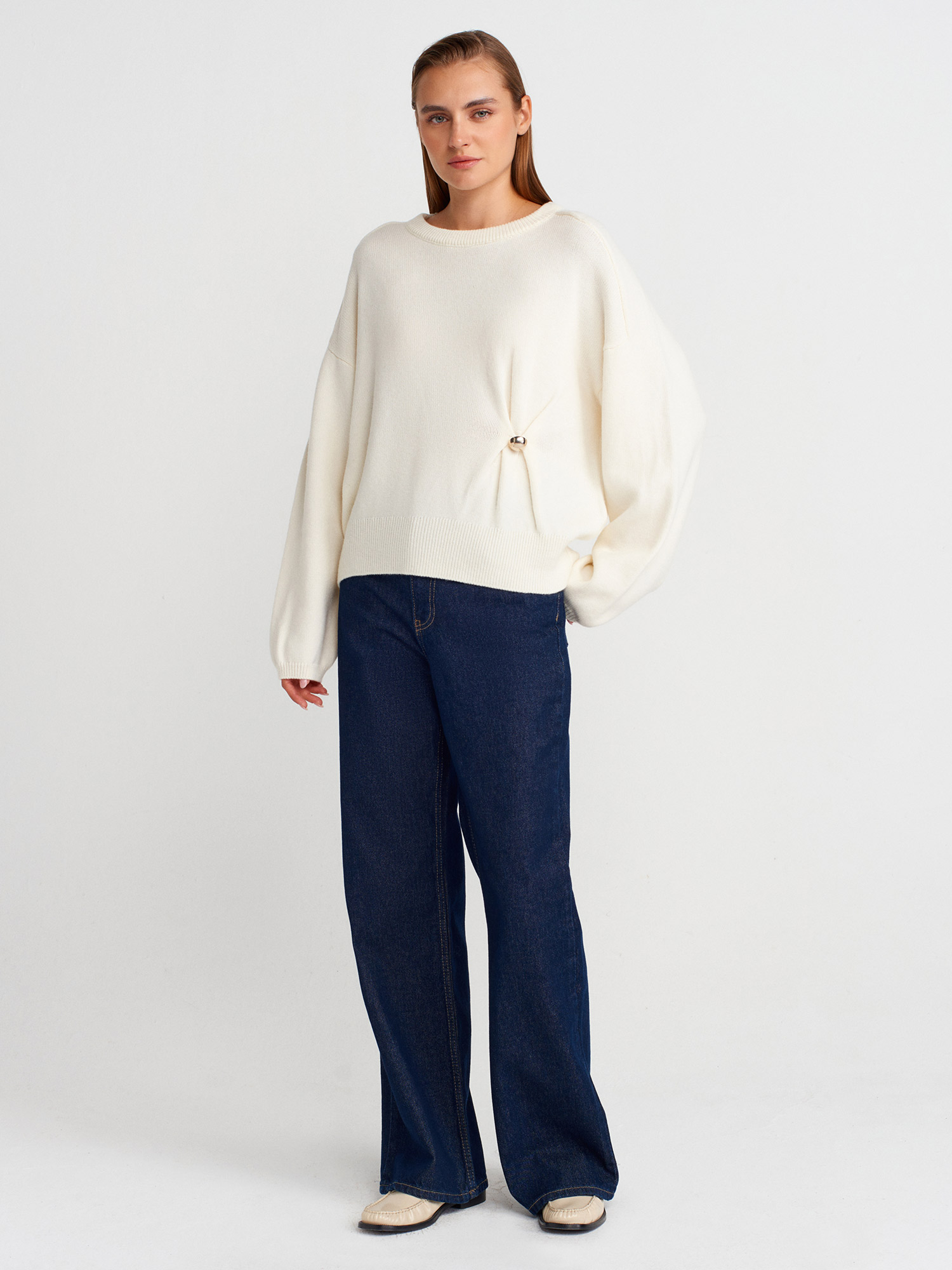 10812 Bisiklet Yaka Büzgü Düğme Detaylı Yünlü Triko Kazak-Ekru