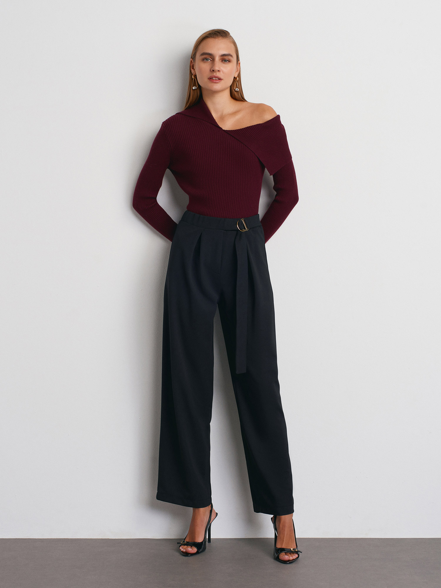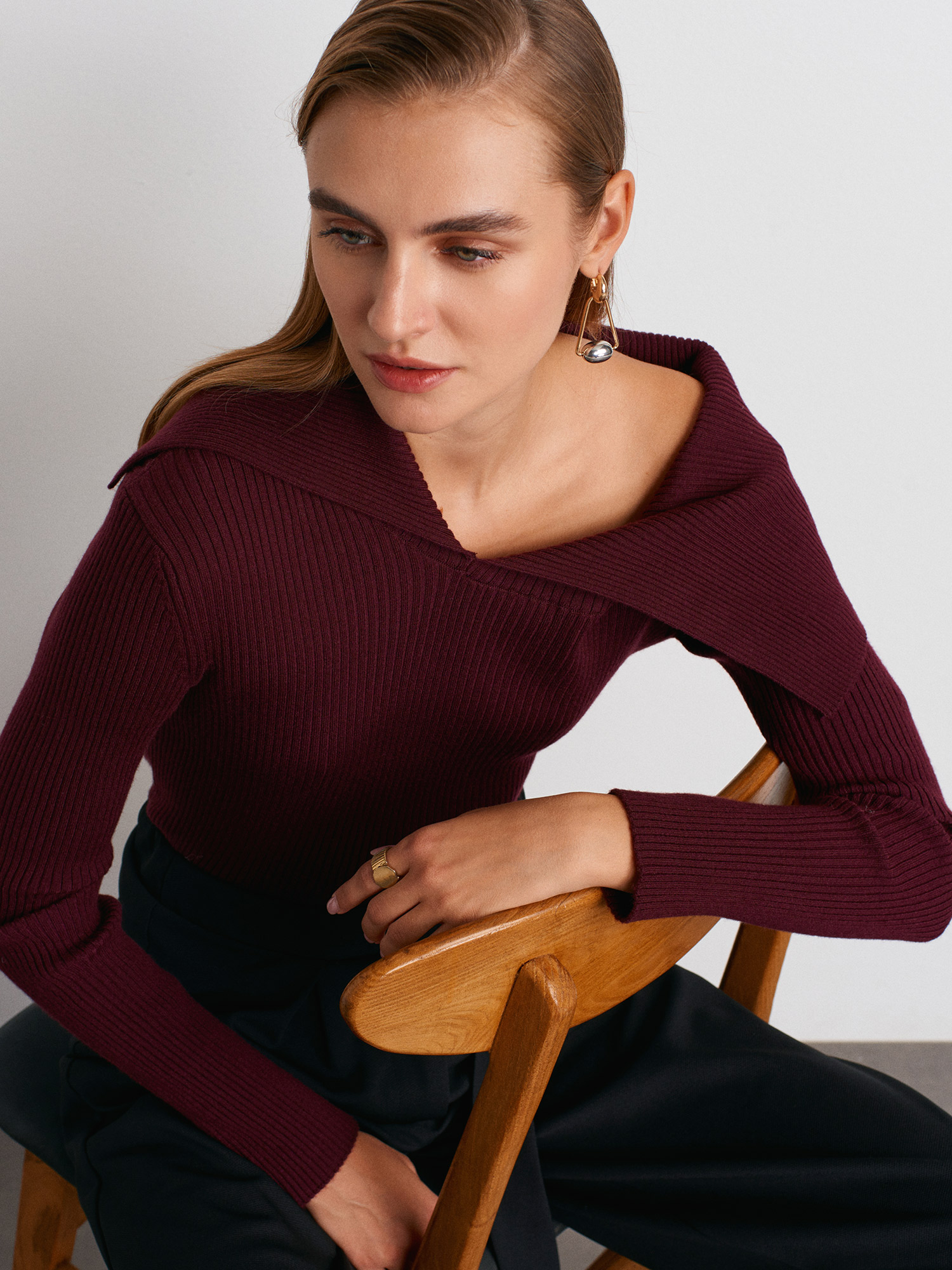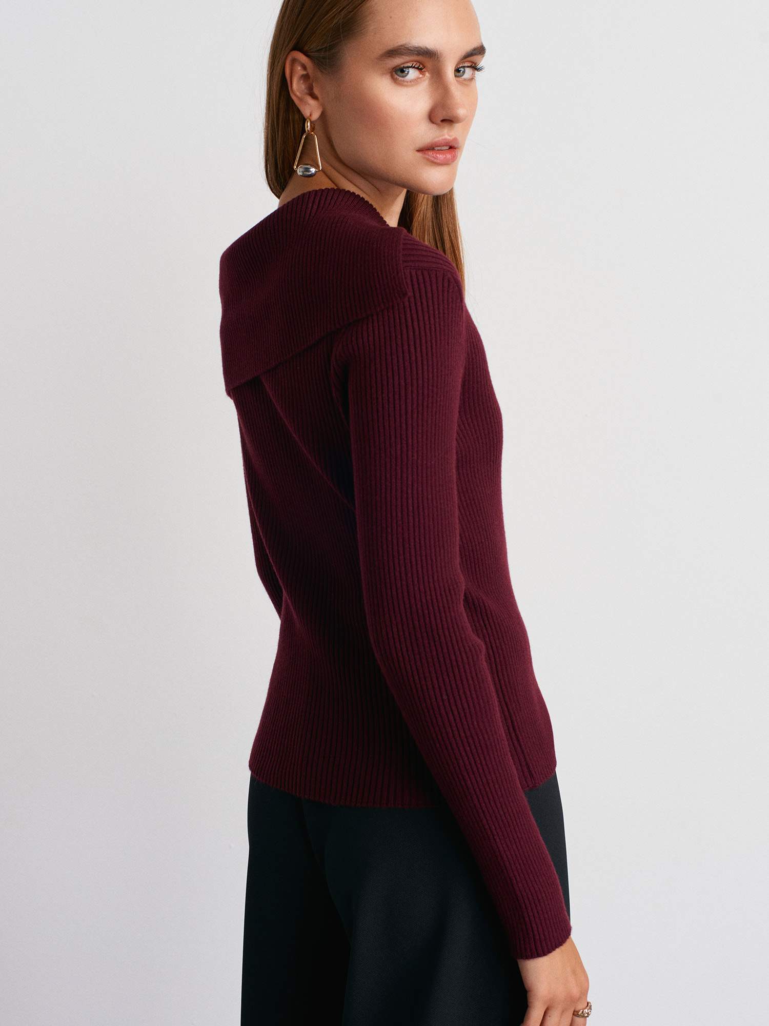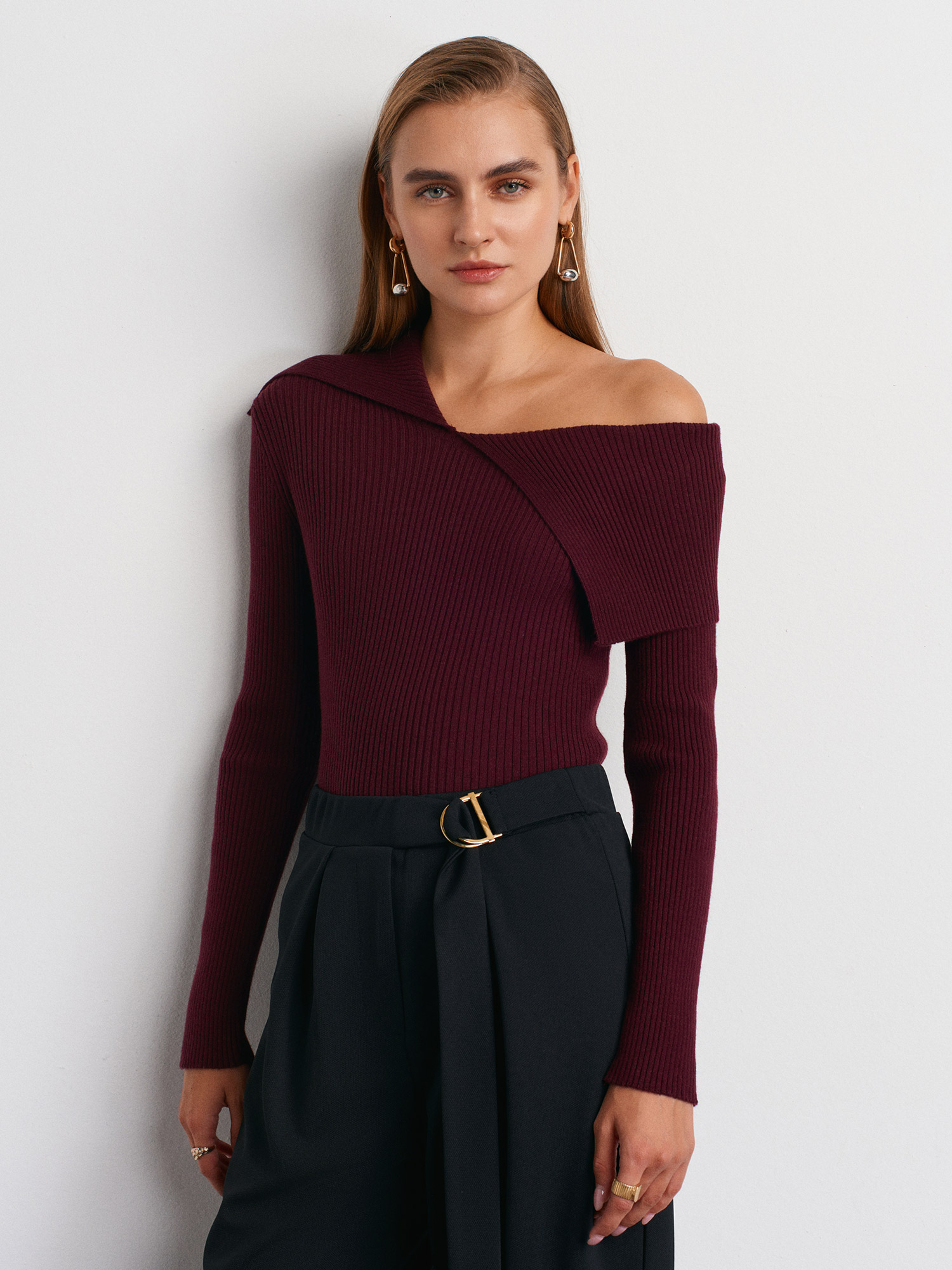 10815 Asimetrik Yaka Yün Karışımlı Triko Bluz-Bordo M.