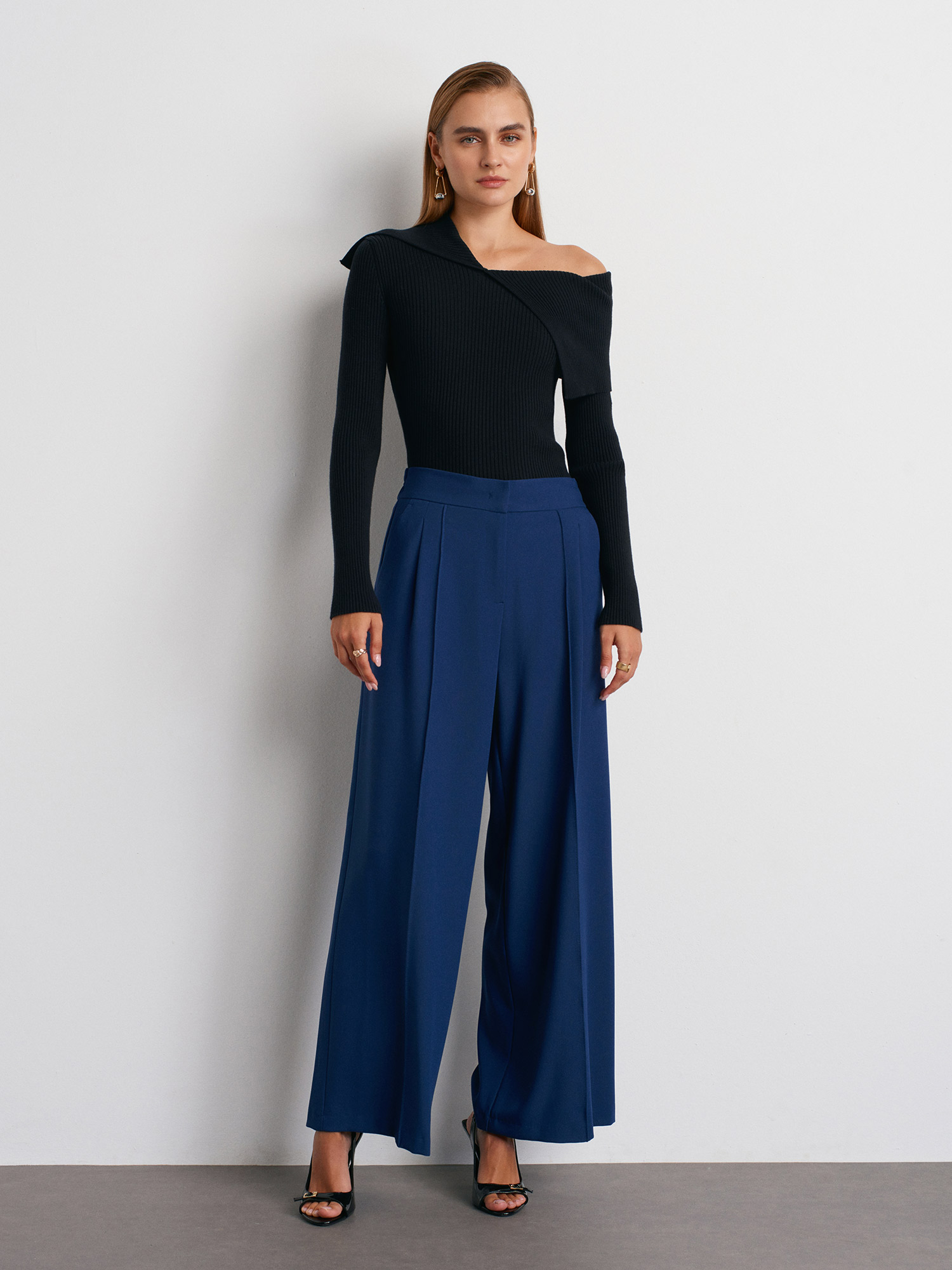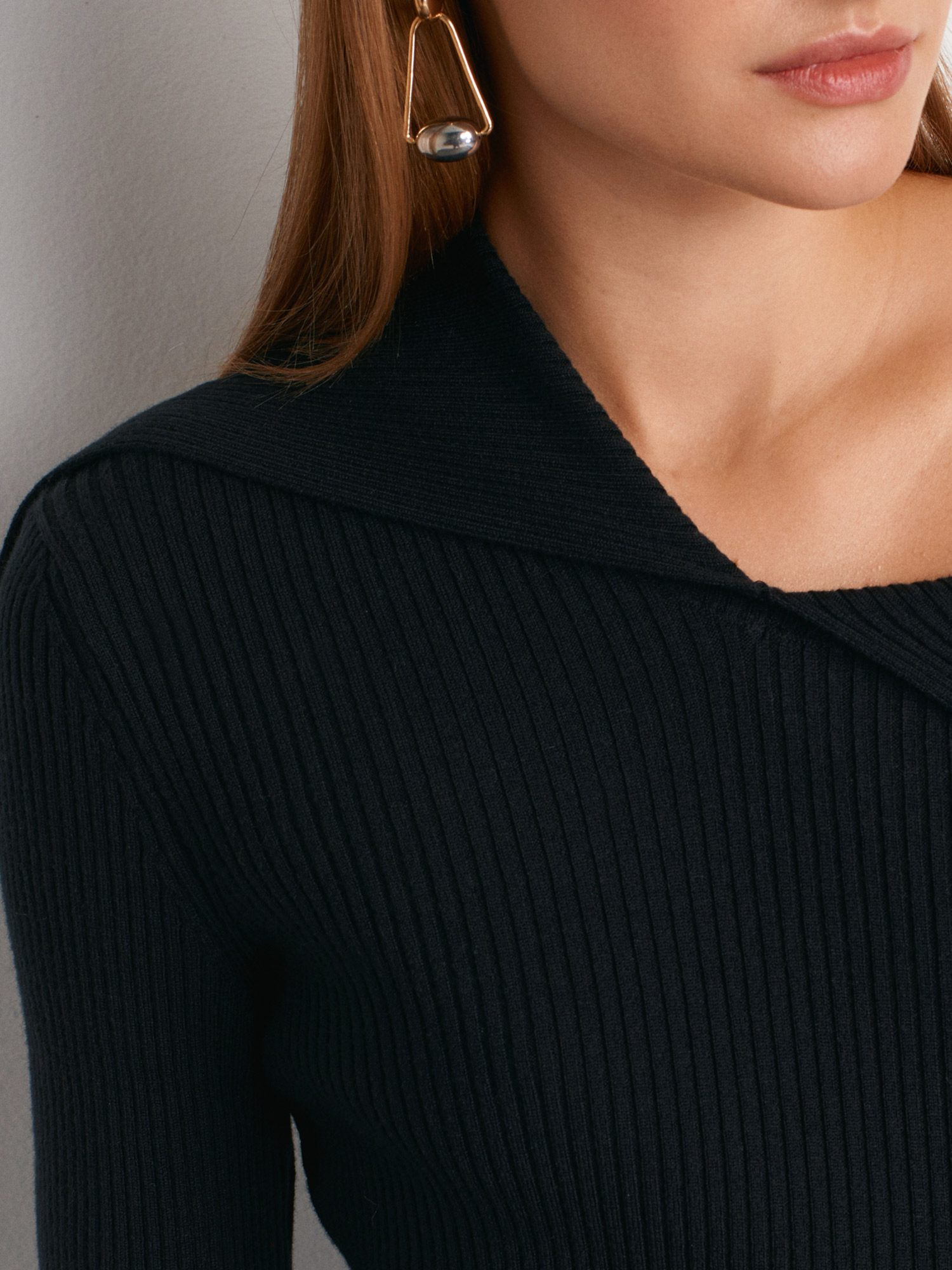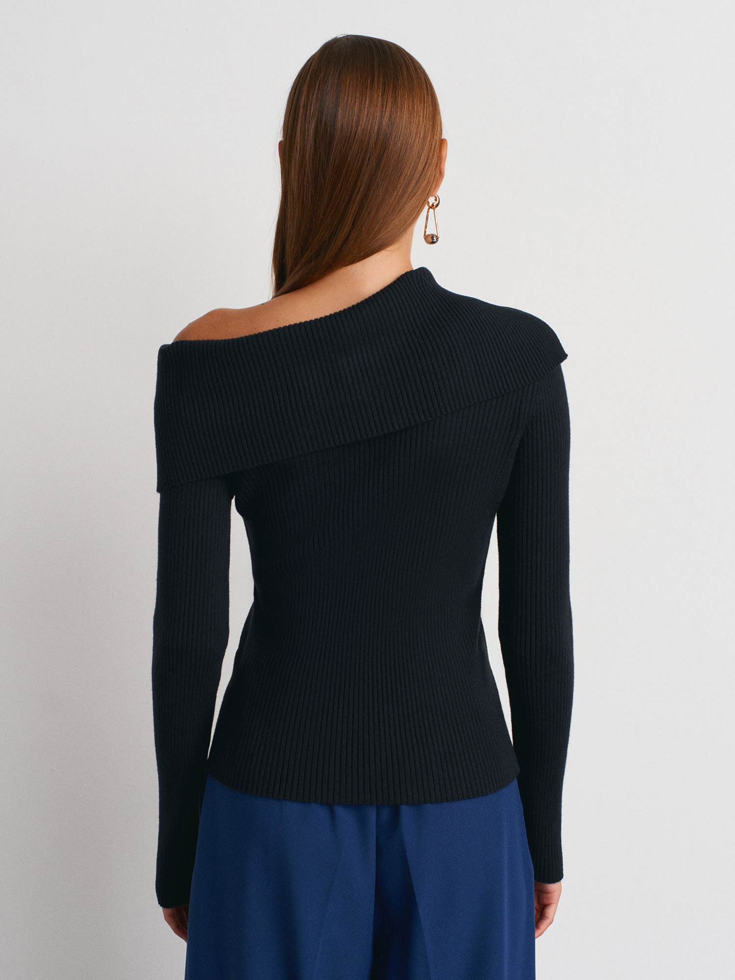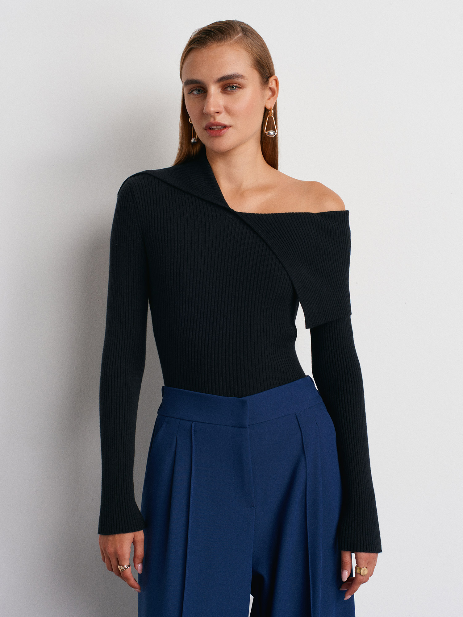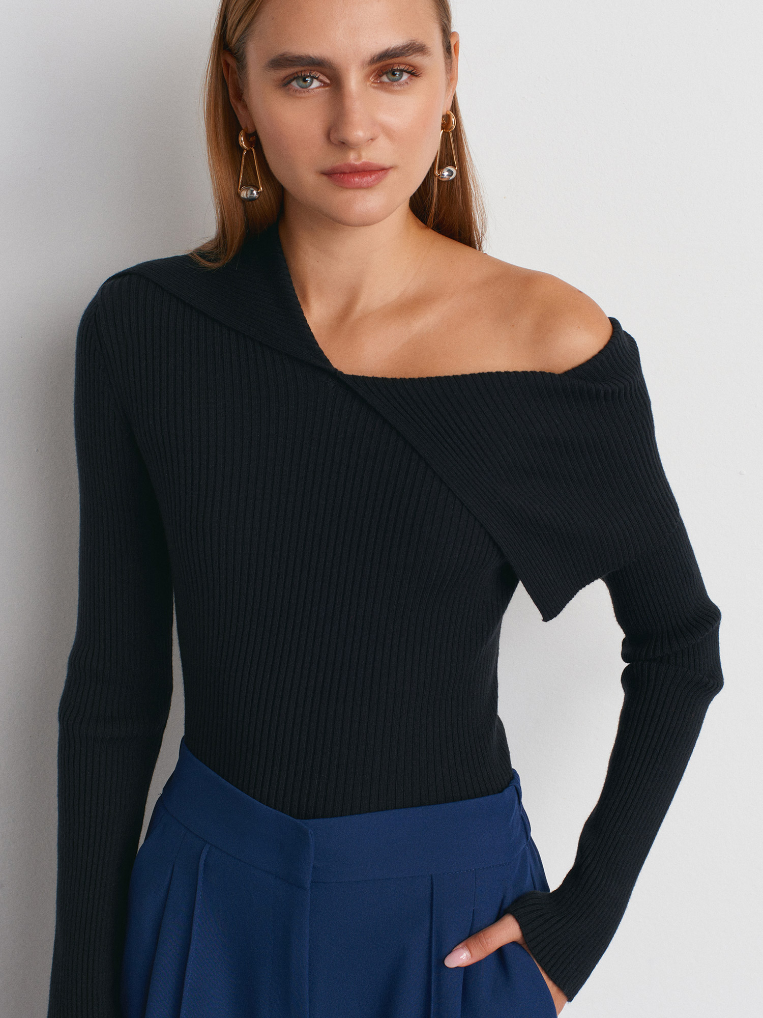 10815 Asimetrik Yaka Yün Karışımlı Triko Bluz-Siyah
