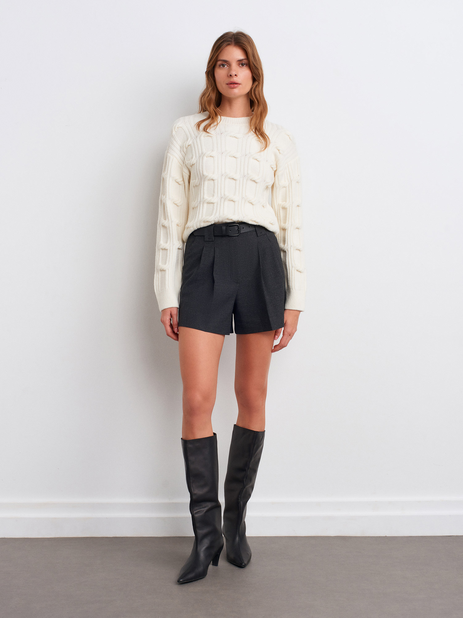 10825 Yün Karışımlı Kabartma Detaylı Triko Kazak-Ekru