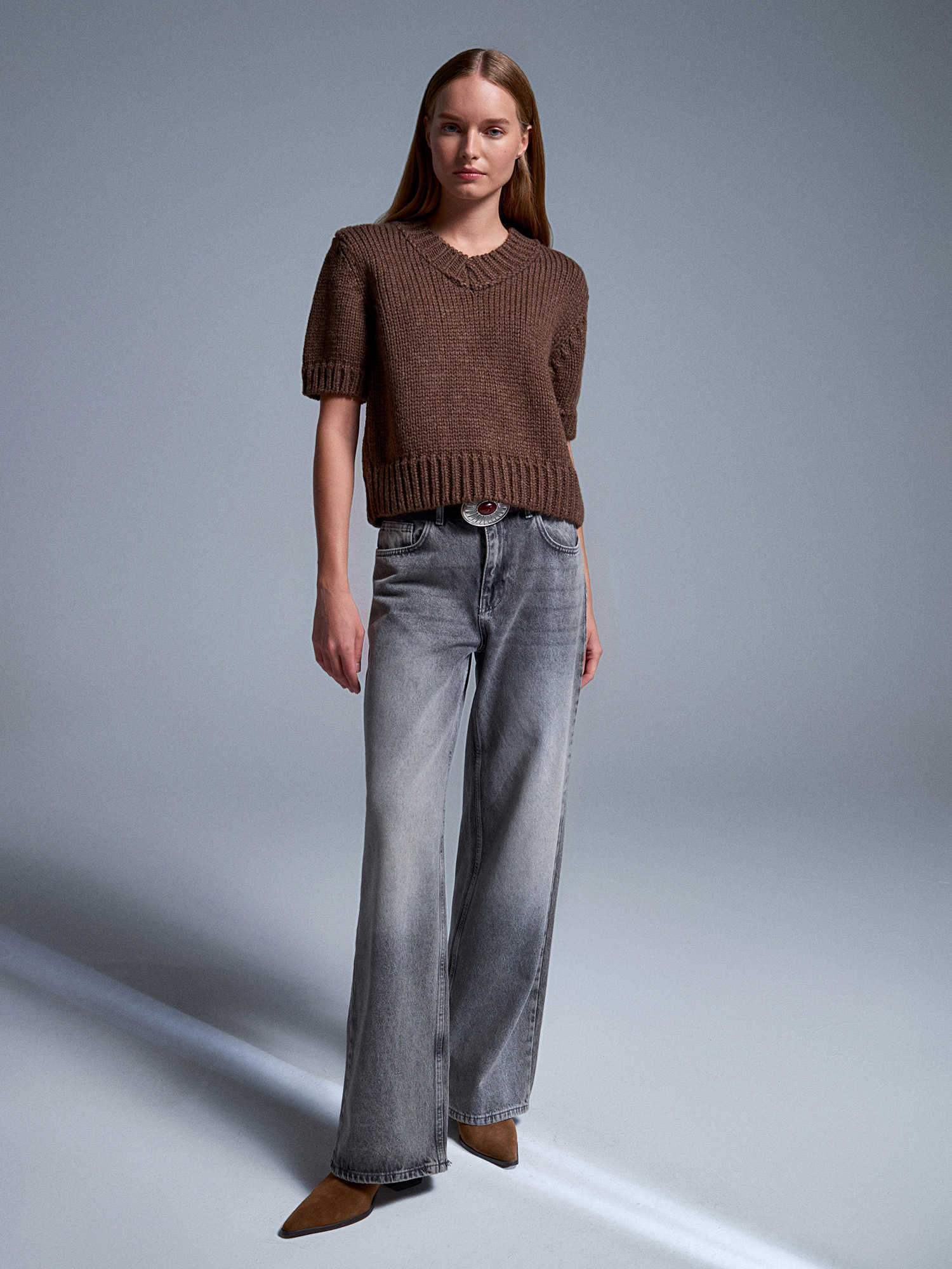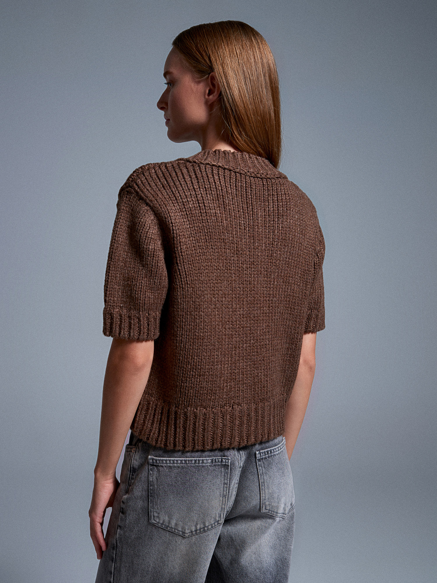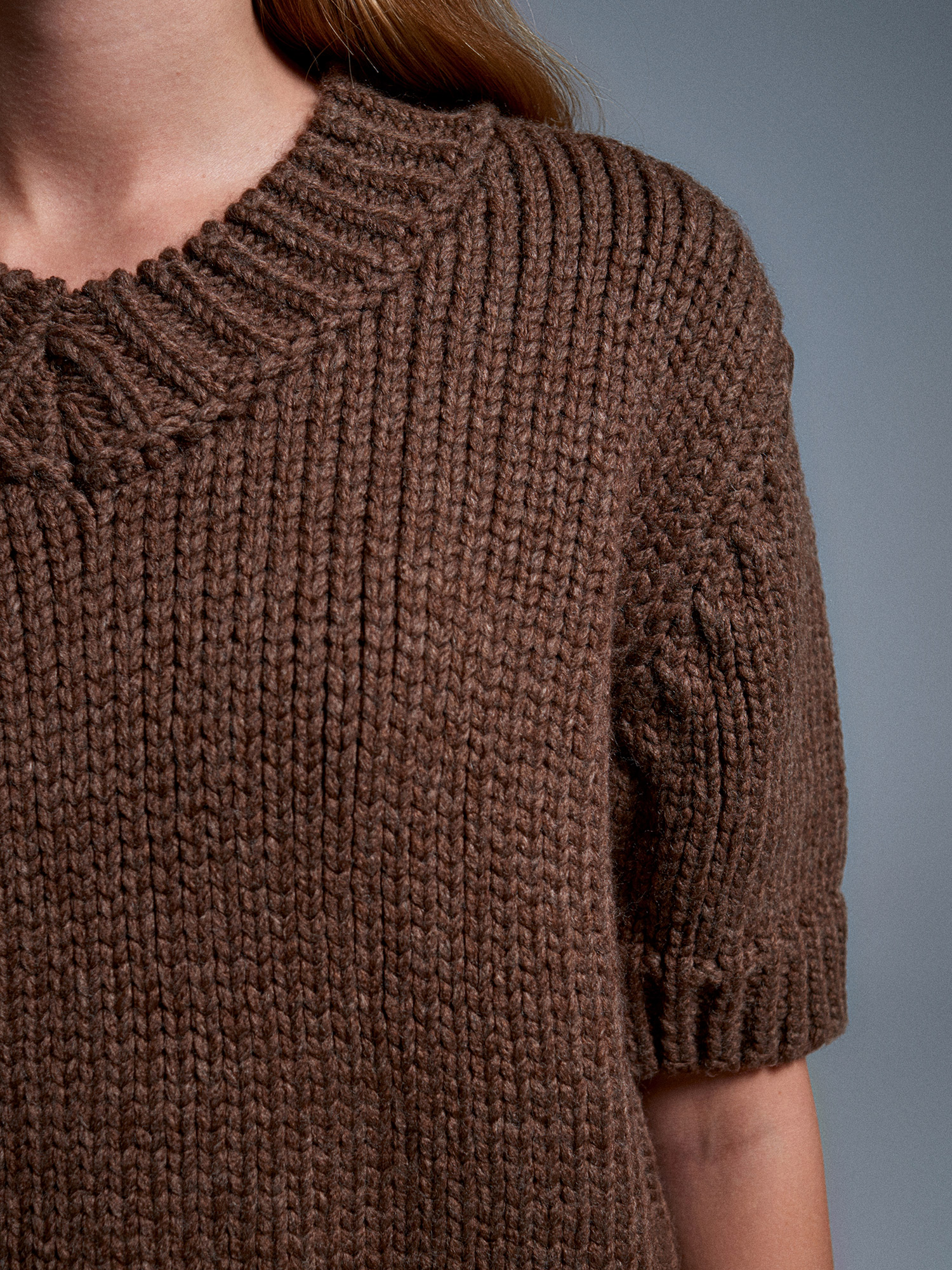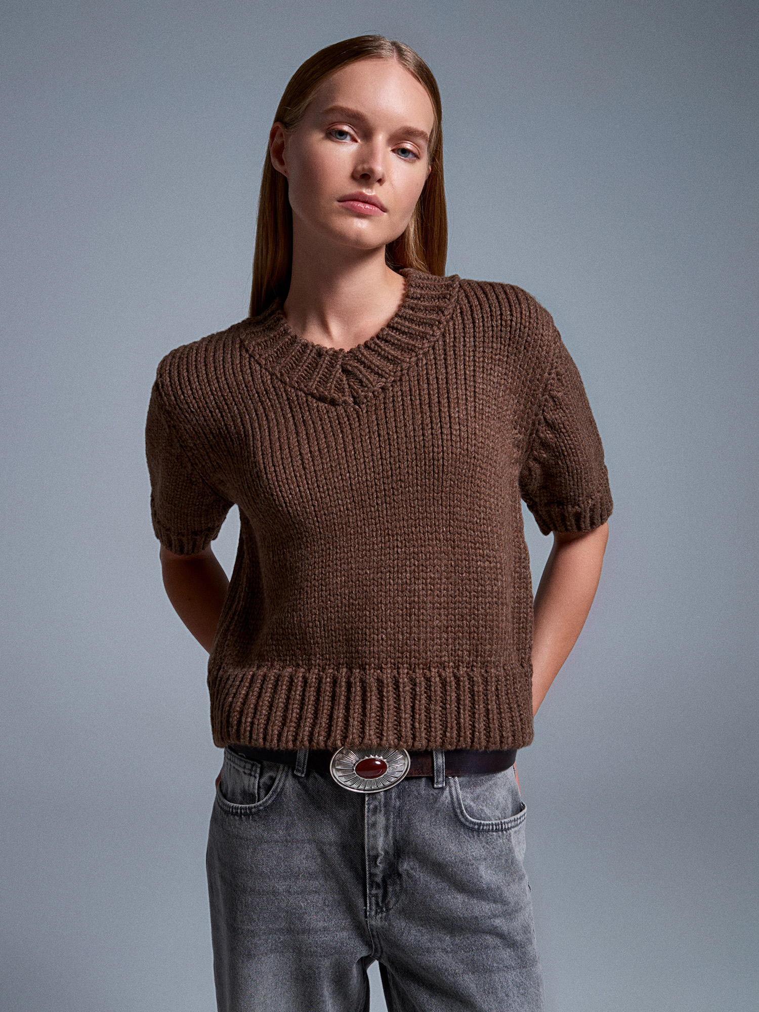 10831 V Yaka Kısa Kollu Triko Kazak-Kahve
