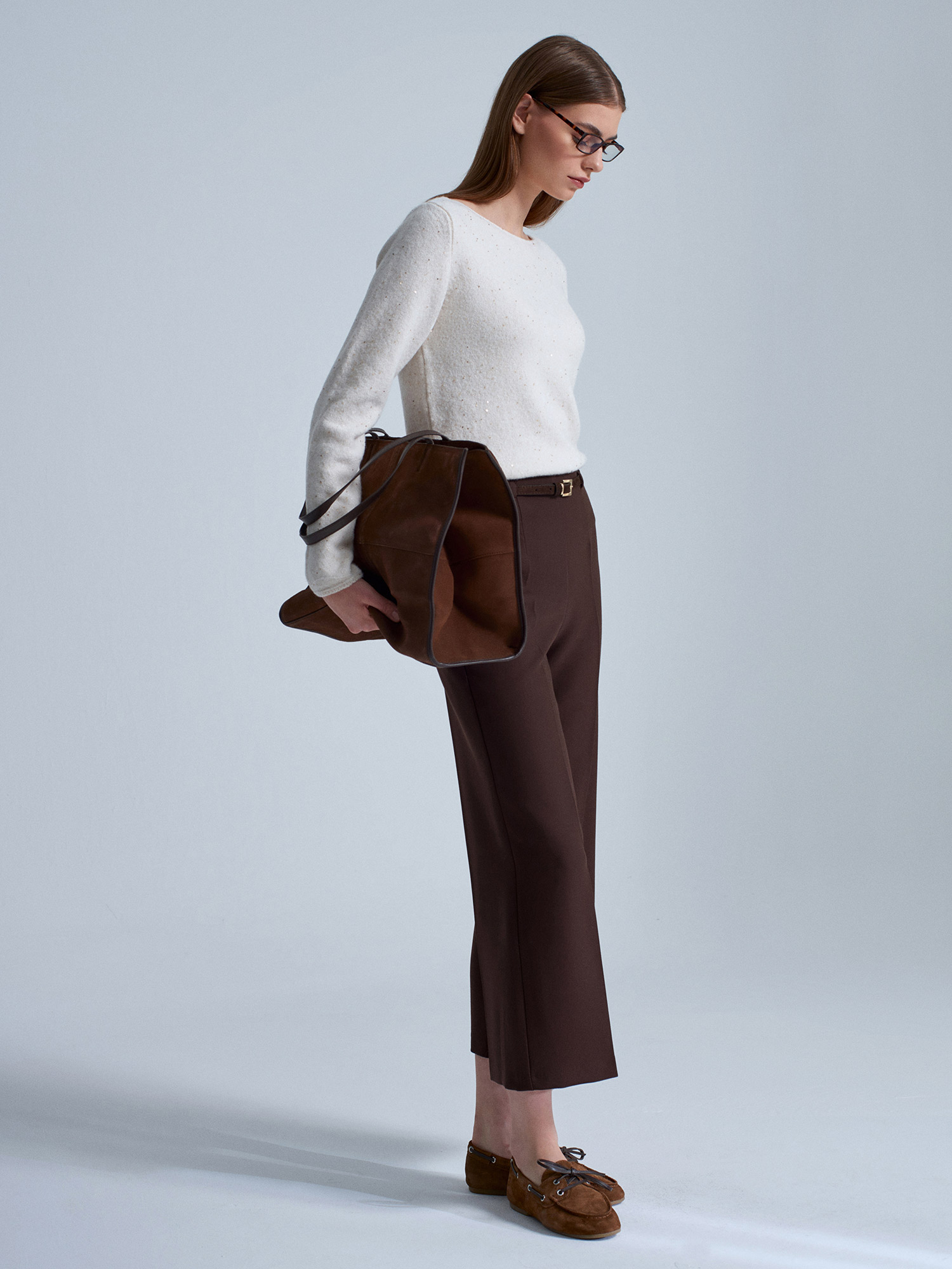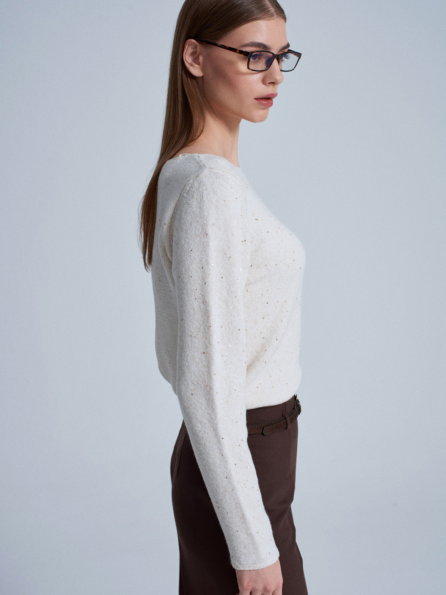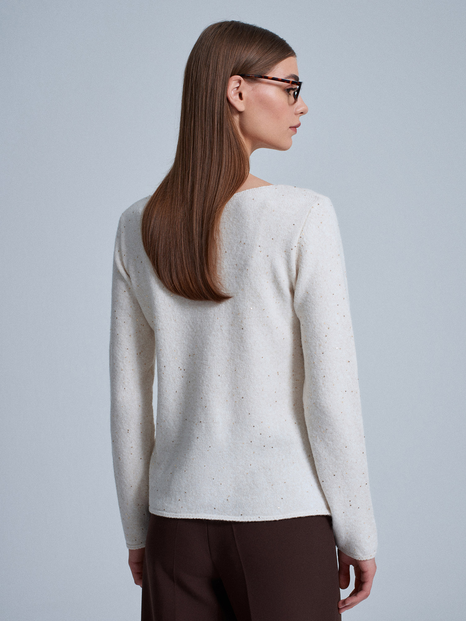 10836 Yün Karışımlı Parıltılı Kayık Yaka Kazak-Krem