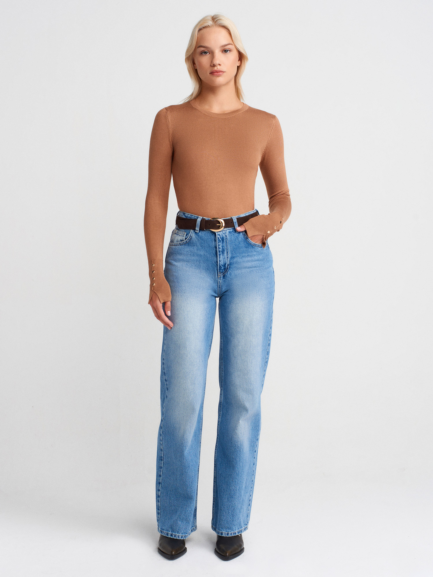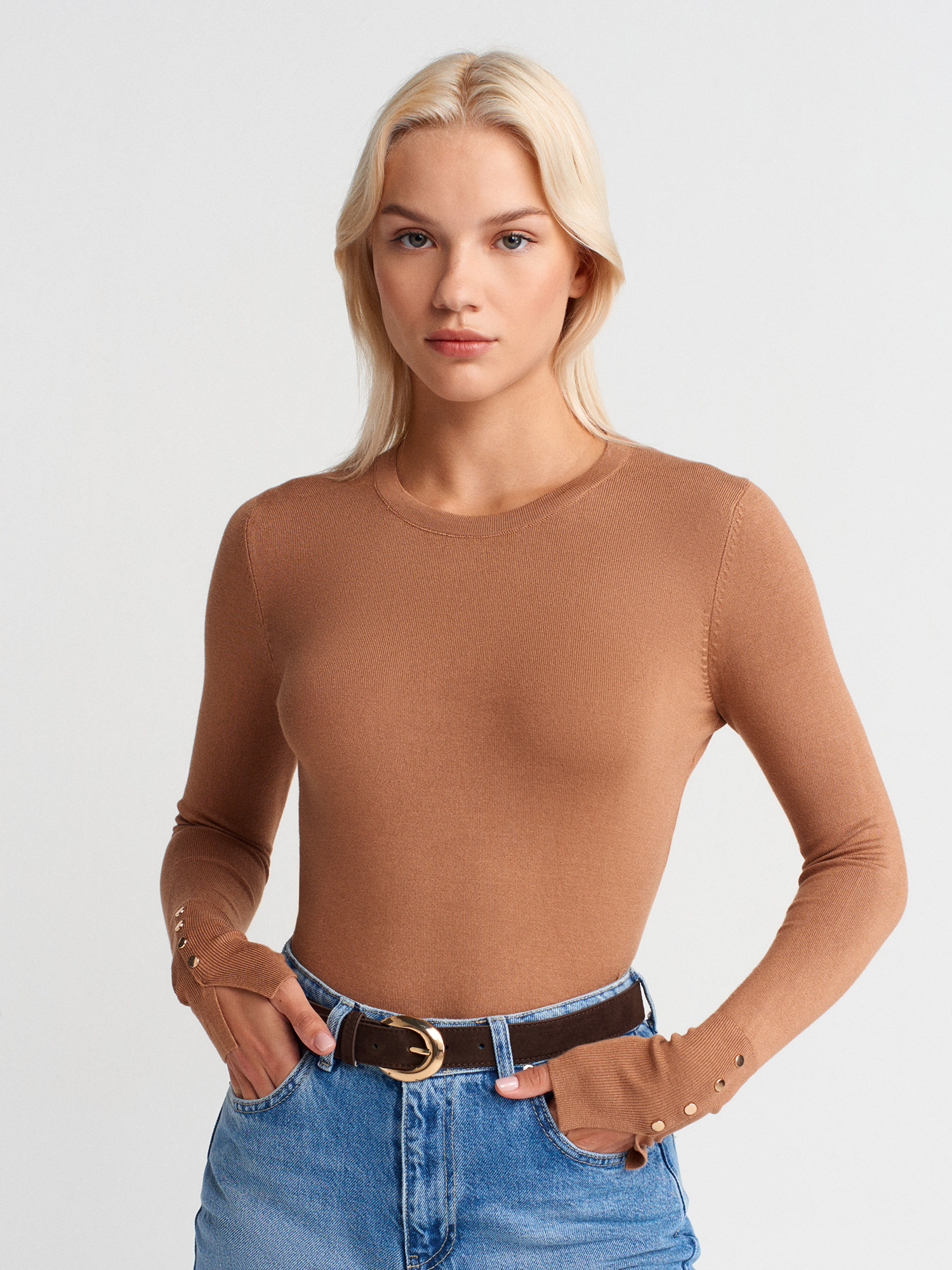 1267 Bisiklet Yaka Kol Ortası Droplu Kazak-Camel