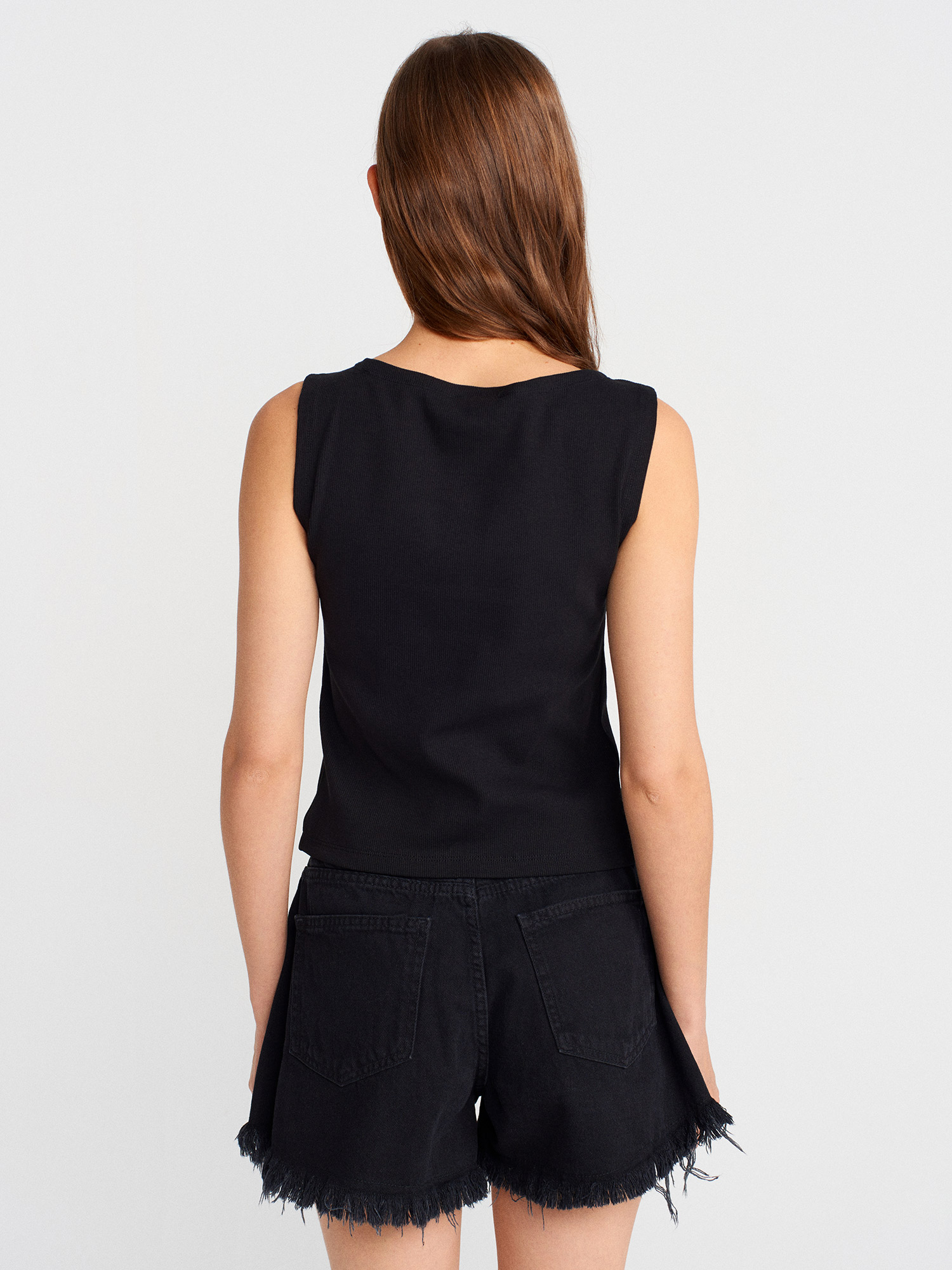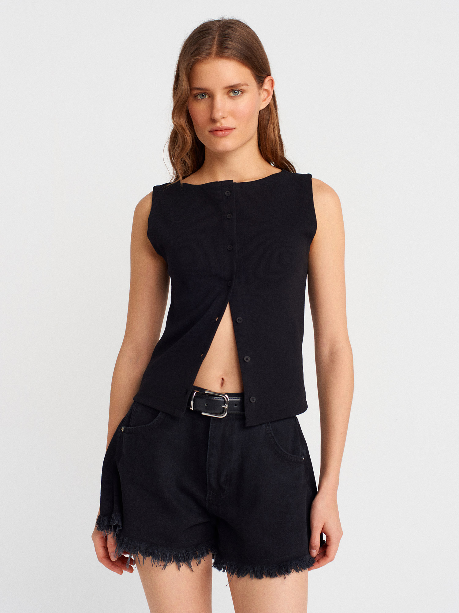 20975 Kayık Yaka Düğmeli Kolsuz Top-Siyah